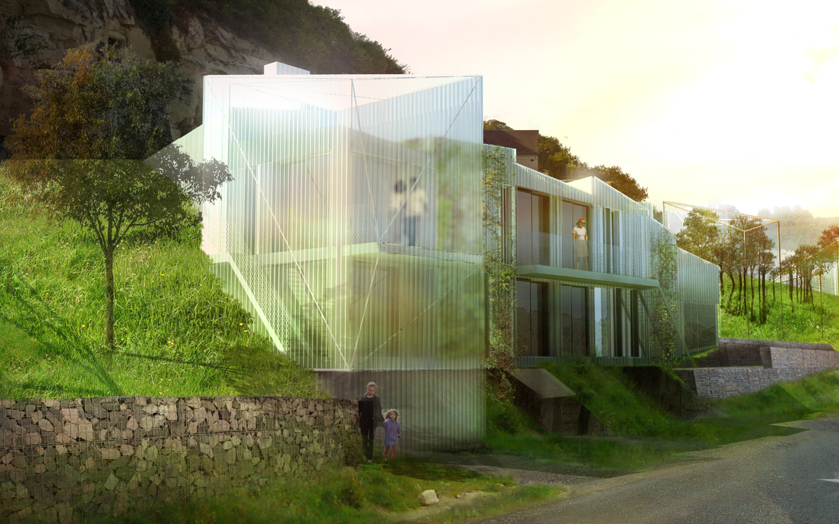 ☉ 11 Housing in a slope is a proposal by 2:pm architectures for Parc Loire Anjou Tourraine designed in 2011. It is located in Turquant France in an outskirt setting. Its scale is large with an estimated budget of 750.000 €. Key materials are metal and polycarbonate. Concepts such as sustainability transparency aggregation and gallery are explored.
