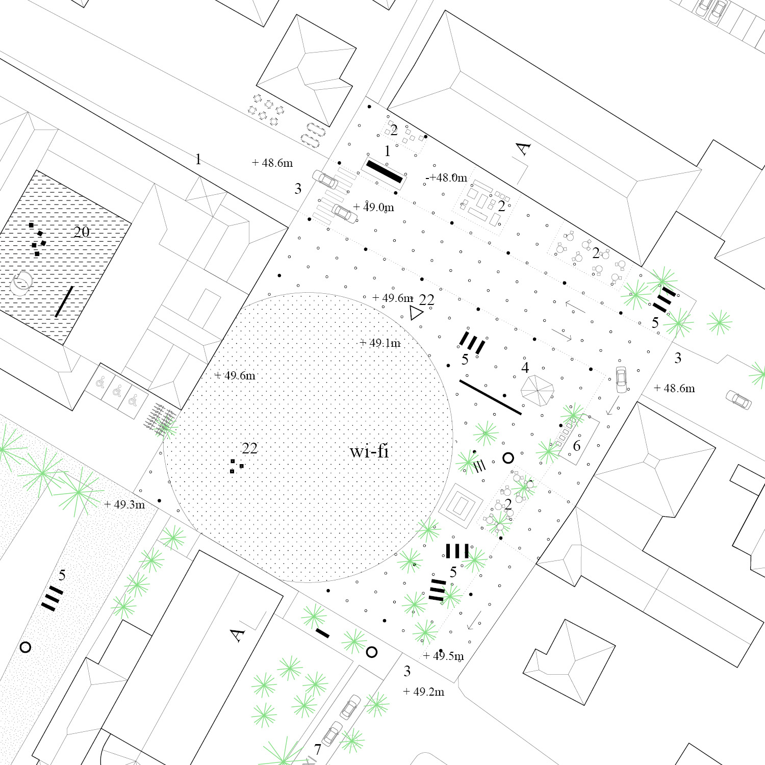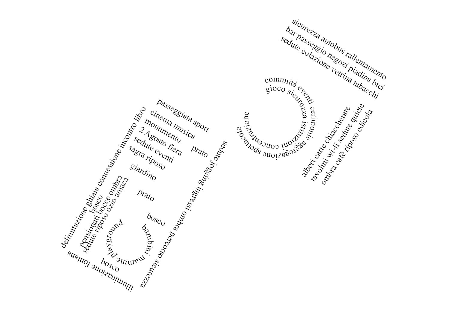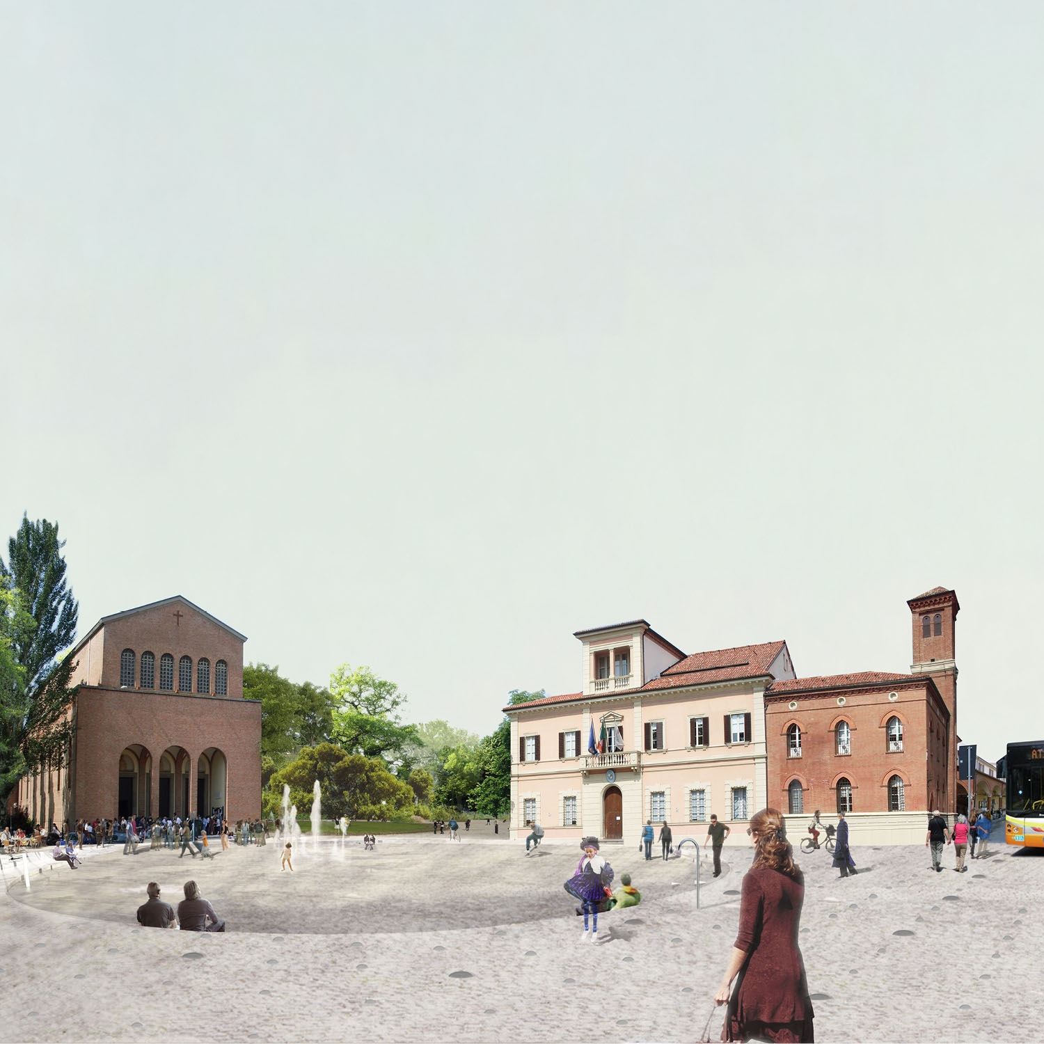 Two integrated entity. The square and the park, clearly redefining their perimeter in the urban context, emerge as a unique public space. The form and the program. The square defines an inner and more intimate space while the park is surrounded by a circuit that conveys pedestrian flows. The program is punctuted by the compression and decompression of spaces, from the sunny or shaded areas, the proximity to roads or not, services, institutions, alternating relaxation areas to areas of activity or events. The edge of the square is extended to the fronts of the buildings on 4 sides, overcoming the gap created by the Via Emilia. The existing drop is solved with a gentle slope of the pavement of the square, which bends to the level of the shopping arcade. The 85 stone seats, monument in memory of the victims of the 2nd of August 1980, are the permanent part of the arena for shows. The “platea” can be extended with temporary seats when necessary. The monument is an integral part of the structure of the park and sharing activities that involve him.