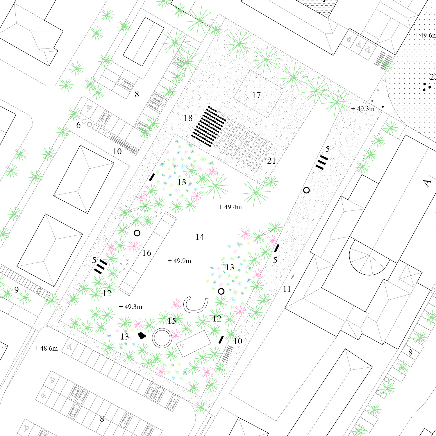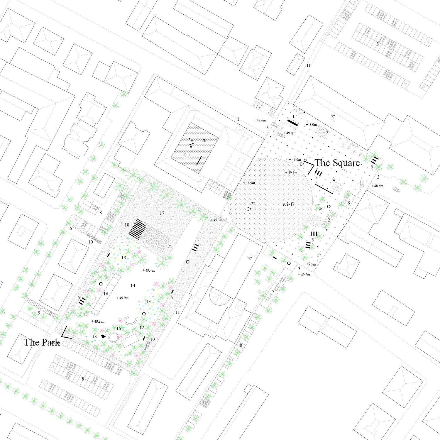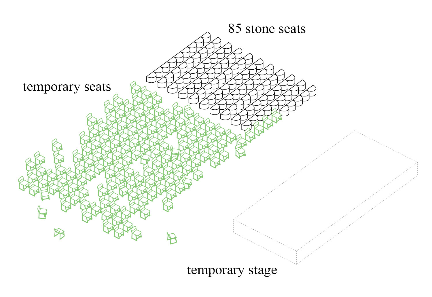 Two integrated entity. The square and the park, clearly redefining their perimeter in the urban context, emerge as a unique public space. The form and the program. The square defines an inner and more intimate space while the park is surrounded by a circuit that conveys pedestrian flows. The program is punctuted by the compression and decompression of spaces, from the sunny or shaded areas, the proximity to roads or not, services, institutions, alternating relaxation areas to areas of activity or events. The edge of the square is extended to the fronts of the buildings on 4 sides, overcoming the gap created by the Via Emilia. The existing drop is solved with a gentle slope of the pavement of the square, which bends to the level of the shopping arcade. The 85 stone seats, monument in memory of the victims of the 2nd of August 1980, are the permanent part of the arena for shows. The “platea” can be extended with temporary seats when necessary. The monument is an integral part of the structure of the park and sharing activities that involve him.