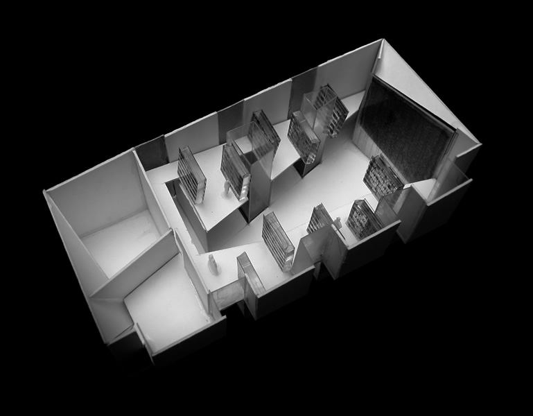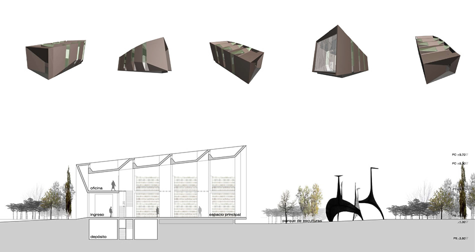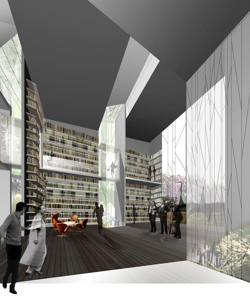 This library will be specialized in art and literature of twentieth century authors. It will house the client’s entire private collection. It could be figured either as a future cultural centre or an emblematic referent to the zone. The library is presented as an object both clearly identified and deeply inter-penetrated by the landscape, establishing a dialogue and rooted to the site. Thus, the building is designed as a singular geometric container, focusing its interior towards a main open view – a wooded garden where contemporary sculptures will be exhibited. The building is placed onto the ground gently, via different platforms. Before entering, it raises to an entry plaza where a reflecting pool is located. A terrace extends into the impressive view. On the interior, the library creates its own atmosphere. It is made of concrete and its geometry is responsive to the careful search for introducing light by lateral courtyards and skylights. Entering through a filter funnel that prepares the visitor for the indoor environment, a double height exhibition room appears. While the main space is completely open, there are options of differentiated and intimate adjacent spaces of staying. The double height main space is surrounded by two stories of thematic open rooms. These rooms are continuously turning towards the central space where the book is always the main protagonist. As a parallel requirement, clients wanted to have the possibility to organize concerts for more than 80 people in the interior. Those will take place in the main space with the upper rooms being used as balconies to extend the audience. All materials chosen are direct consequence of integrating Structure, Geometry, Aesthetic Experimentation and Spatial Expression.
