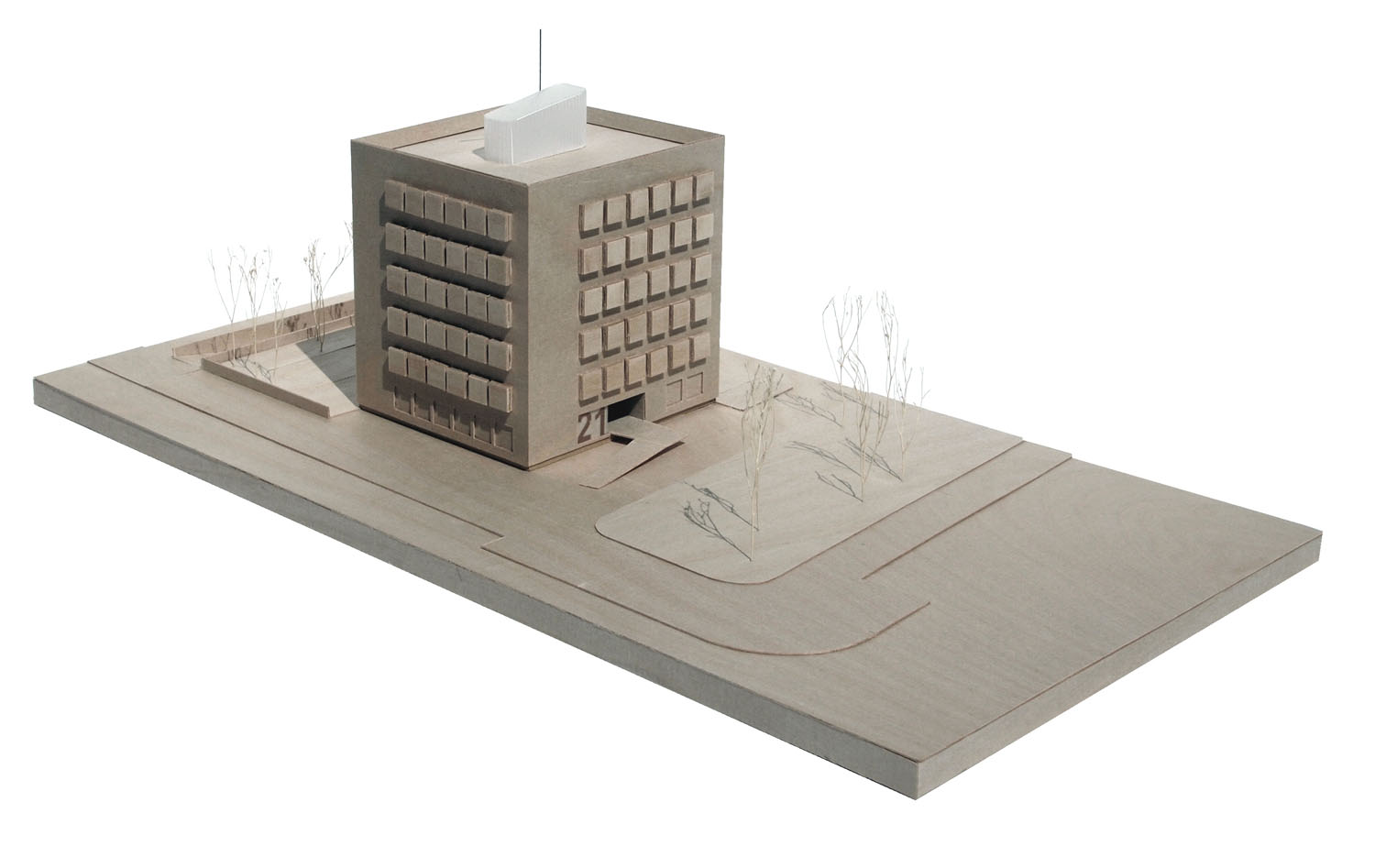 El espacio del vestíbulo se proyecta hacia la avenida, una rampa que permite salvar el desnivel que beneficia la privacidad de las viviendas situadas en planta baja, rompe la contundencia del cubo con un gesto de ofrecimiento que, como si de una alfombra se tratase, concilia lo privado con la geometría del viario público.