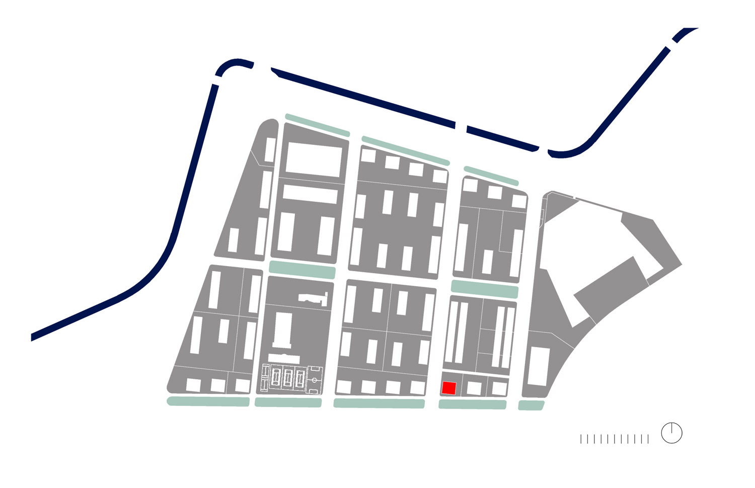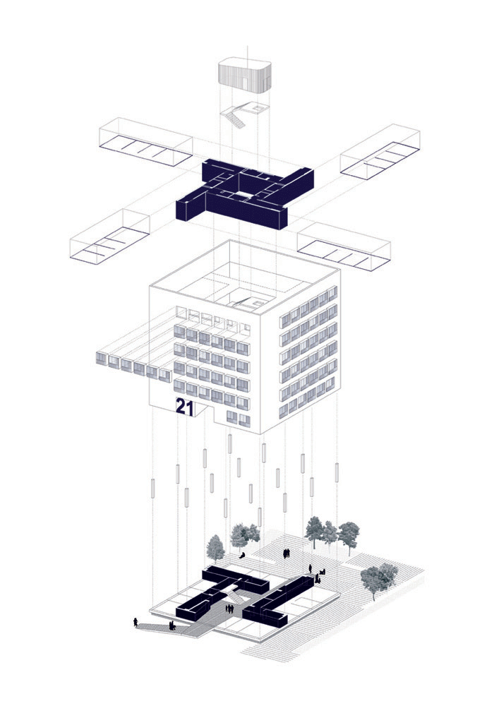 Podríamos acordar que el entronque de la “torre” con el suelo es un momento crítico, así el encuentro de lo público con lo privado, por ello asumimos que la planta baja del edificio se transforma por las presiones del suelo y del espacio público. La planta de acceso es entonces una versión modificada de la planta donde un corte transversal permite el acceso y el encuentro con el espacio exterior común situado al norte, que imaginamos lugar de reunión comunitario, espacio de juego de los niños y reposo de los mayores.