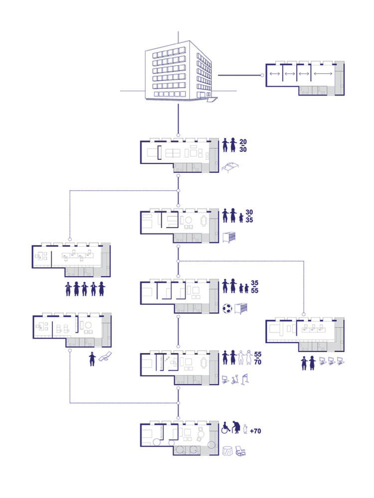 No es difícil imaginar estadios previos y posteriores a la vida de pareja con dos o tres hijos, a la que parece estar destinada la vivienda normativa, que requieran distintas necesidades, por lo que no parece lógico ignorar estas situaciones con una configuración espacial única del hogar. Desde la situación de pareja o único individuo que accede a la vivienda aún sin hijos y que podría preferir un estar más grande a costa de un dormitorio, a la posibilidad de vincular el tercer dormitorio al salón-estar como espacio de trabajo, pasando por la configuración tipo de pareja y dos hijos, a situaciones posteriores en la que alguno de los hijos abandona el hogar y de nuevo se prescinde de uno de los dormitorios; o momentos ulteriores en los que la pareja, de mayor edad ya, requiere de espacio donde poder guardar los enseres acumulados durante toda una vida o mantener un dormitorio para la visita de un nieto, pasando por situaciones intermedias, quizá temporales, como vivienda para una persona que vive sola y prefiere un espacio diáfano o un grupo de individuos que comparten un ámbito mayor de trabajo.