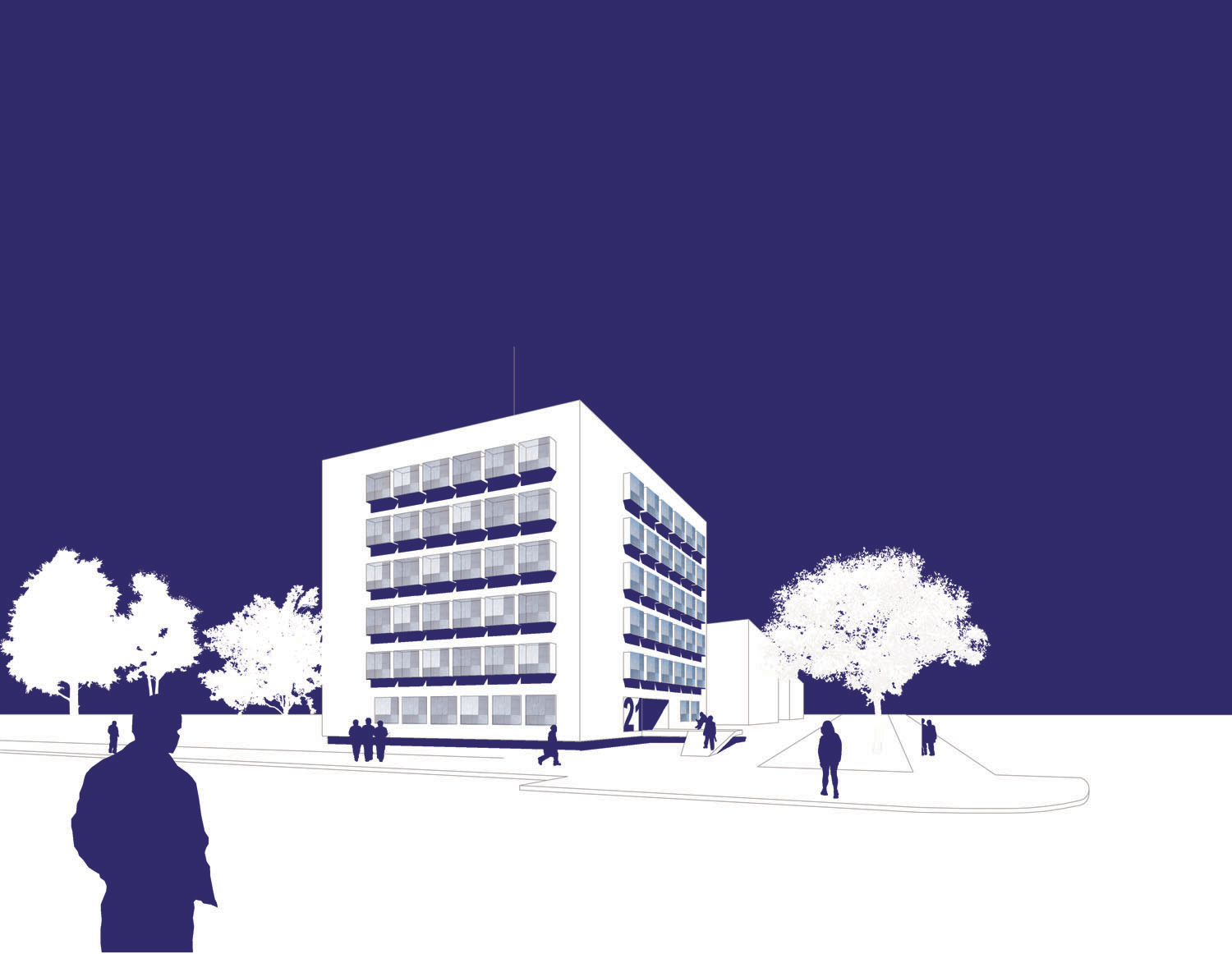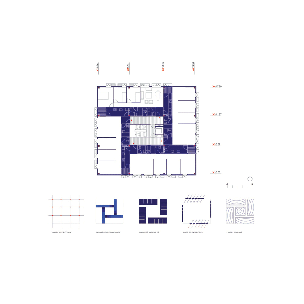 Las dimensiones de la planta definida por las alineaciones, así como la distribución de número de viviendas por planta demandada, nos refiere a una planta configurada como un torre, esto es, un núcleo de comunicaciones verticales situado en el centro de masas, rodeado de un cinturón de instalaciones y un anillo exterior diáfano y flexible asociado a la luz y a la ventilación.