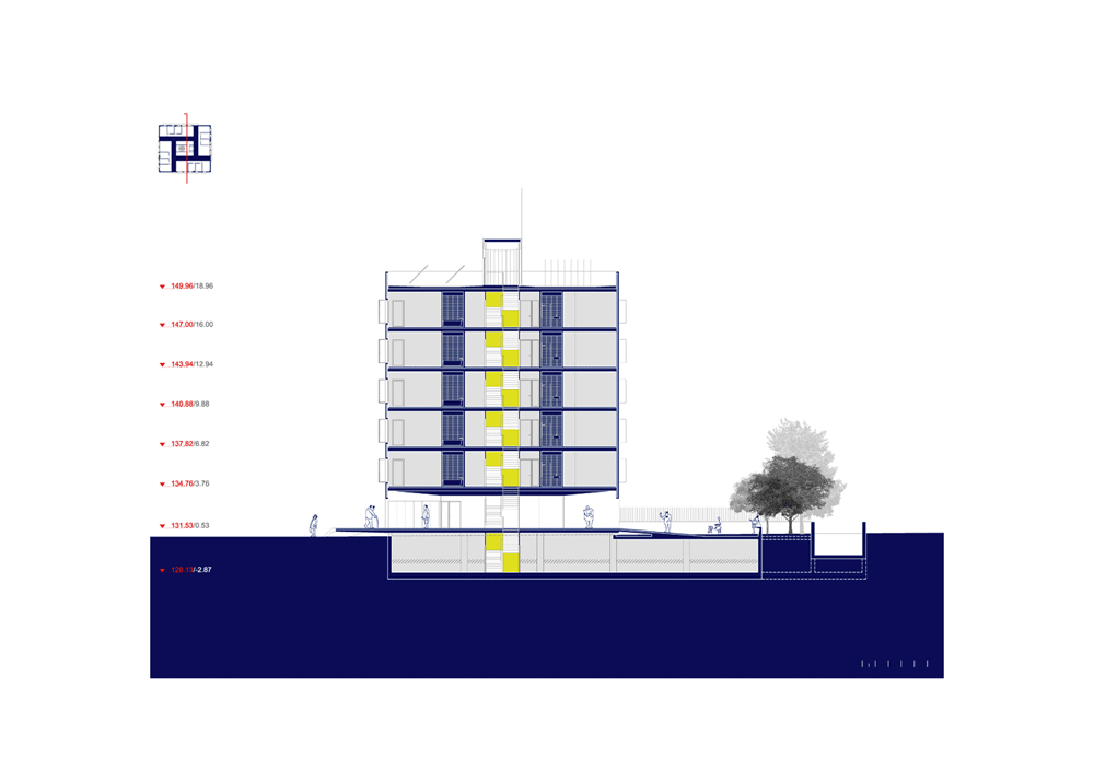 Este corte reconfigura la planta manteniendo la cruz de instalaciones que se borra en los ámbitos de acceso para permitir el paso, de modo que al enfrentarnos al acceso vislumbraremos la luz del espacio exterior al otro lado del vestíbulo del edificio, evitando angustiosas sensaciones de fondo de saco y sugiriendo ese espacio de encuentro.
