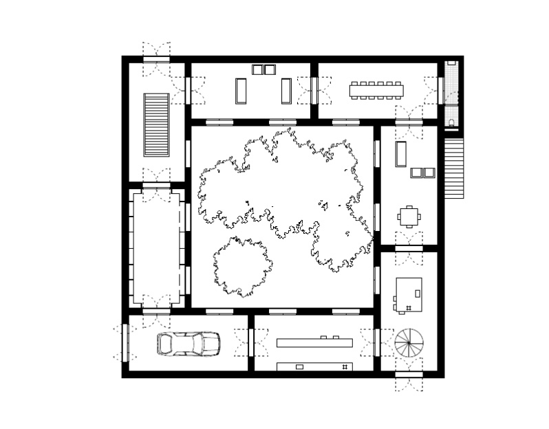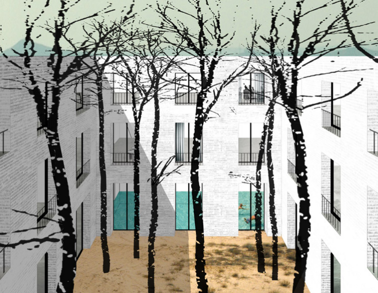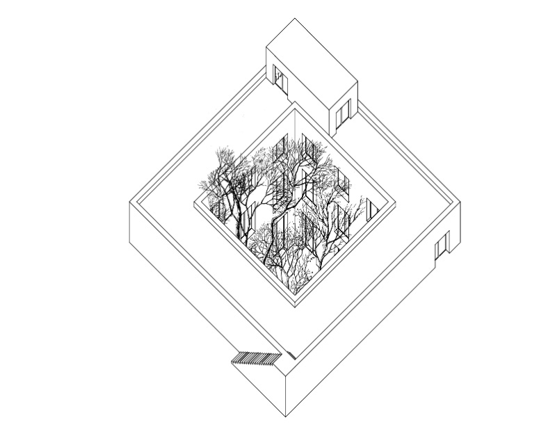 Part of the ‘Ordos 100’-project, selected by Herzog & De Meuron, curated by Ai Weiwei. The design for a 1,000-square-meter residence in the Mongolian desert is reduced to the design of just one component, a room: a rectangular space with four entrances and no prescribed function. The room receives its individual character only through its ceiling height and its relative position in the house. Twenty-four identical rooms are organized over three stories, on each floor time forming an enfilade around a central atrium that is protected from harsh winds and sand storms. The inner garden is the actual outdoor space of the house, to which all of the rooms are oriented. Two flights of stairs, which stand in the middle of the room like pieces of furniture, provide the connection between the stories.