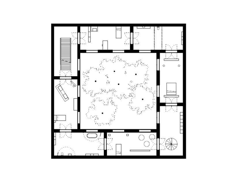 Because the building is sunken into the ground, only the top story can be seen in the residential neighborhood, like the tip of an iceberg. As in traditional Mongolian settlements, the house forms a microclimate: its underground position profits from the relatively constant ground temperature, tempering the extreme temperatures of the Mongolian climate. The structural base of the project is a massive concrete base, which by its weight prevents the house from being pushed up by the water force. The concrete wall decreases in width towards the top. Inside, the walls between rooms are doubled, and the space in between used to house the impressive array of ducts, vents, and other technical equipment required by a house of this comfort level. All rooms are equipped with double glass doors, allowing for each room to be closed off separately to maintain it’s singular logic. The luxurious aspect of this residence is not in an extravagant form or use of materials, but in the abundance of spaces. The enigmatic twenty-fifth room on the roof is for the attendant: a lookout post on a thick wall.