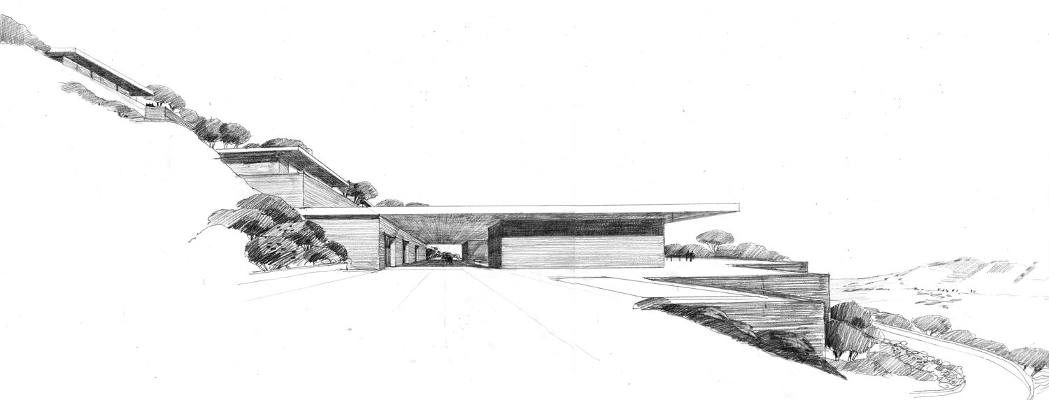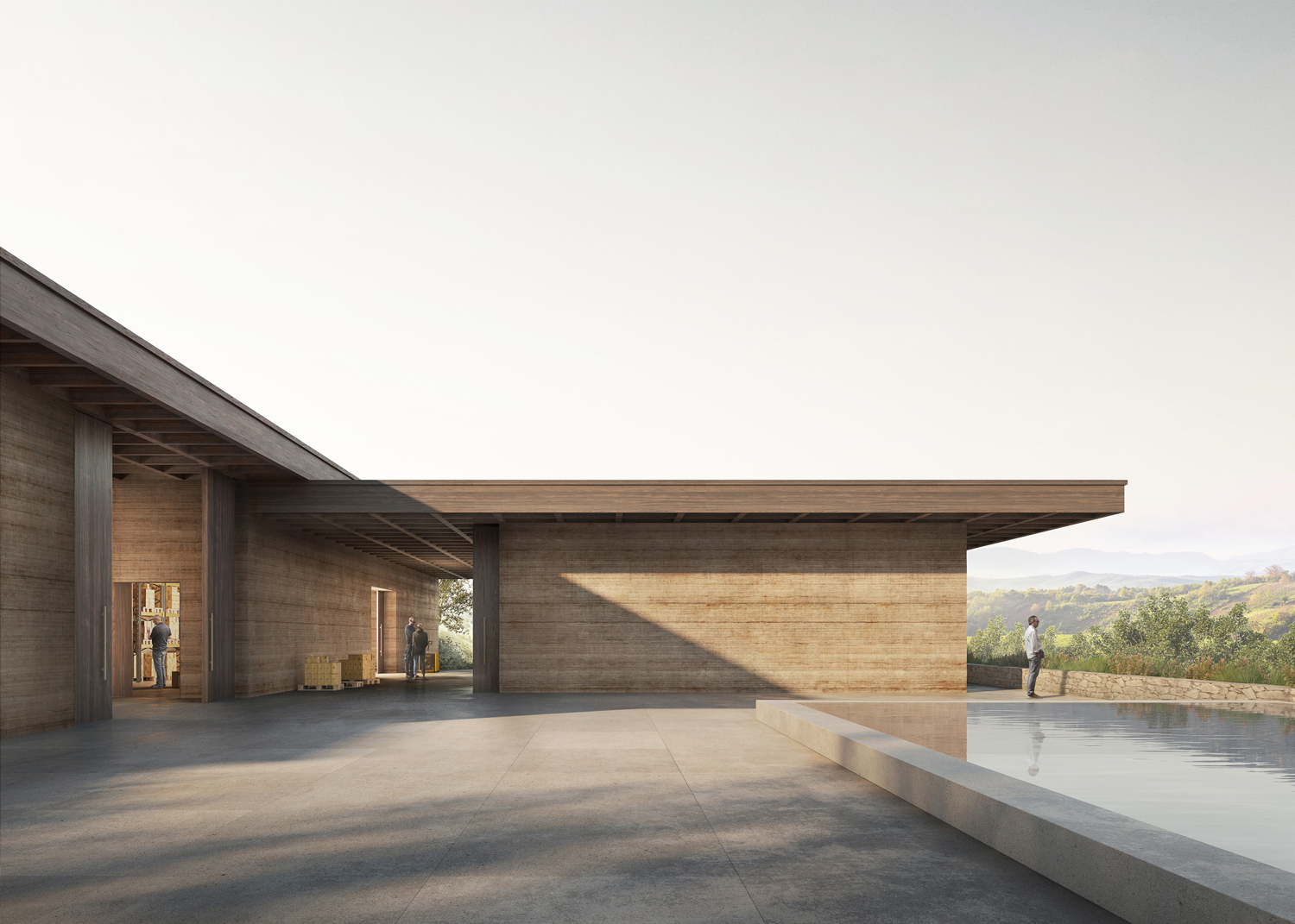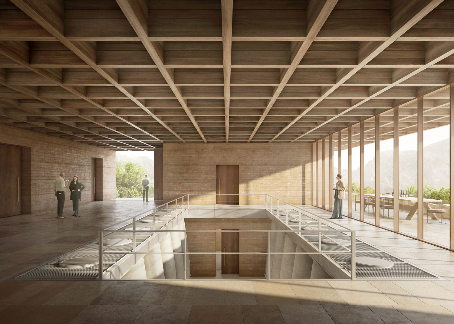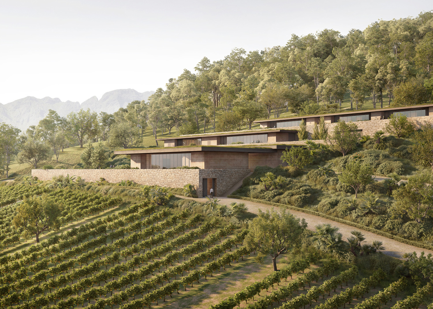 In the Cape Winelands region, around 60 kilometres east of Cape Town, a new wine estate for 4G Wines is being developed in the mountainous landscape of Franschhoek. Once founded by French immigrants and winegrowers, Franschhoek is one of the most important wine-growing areas in South Africa. The grounds of the new estate are shaped by their unique hillside location, offering sweeping views over the landscape. At an elevated point of the site, the new winery with its clear architectural language blends sensitively into its natural surroundings, while being visible from afar as a new landmark of the wine region. The architecture is based on the logic of wine production. Following the principles of gravity flow, in which production takes place on different levels, the functions of the building are distributed over three compositionally offset levels – from wine production to offices and wine tasting to the apartments. The flat, elongated structures, each consisting of a base, volume and roof, adapt to the topography of the slope, while creating expansive terraces. Landscaped gardens with native plants embed the terraced architecture seamlessly into the landscape, providing a smooth transition from winery to the surrounding nature. The architectural concept for the winery focusses on durable and sustainable materials. This does not only contribute to an environmentally friendly construction, but also creates a physical connection to the surrounding landscape through its materiality. Rammed earth walls, produced from the excavation of the site itself, regulate temperature and humidity, creating a healthy, comfortable indoor climate. The cantilevered roof construction made of local timber offers protection from the sun and weather conditions, while contributing to biodiversity through its extensive greenery. With its overall low-tech climate concept, the new winery combines functionality with aesthetics and ecological responsibility.