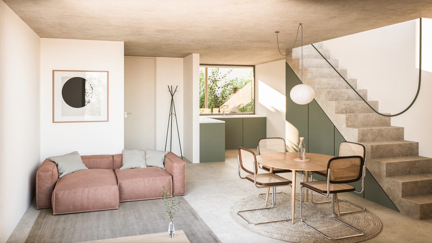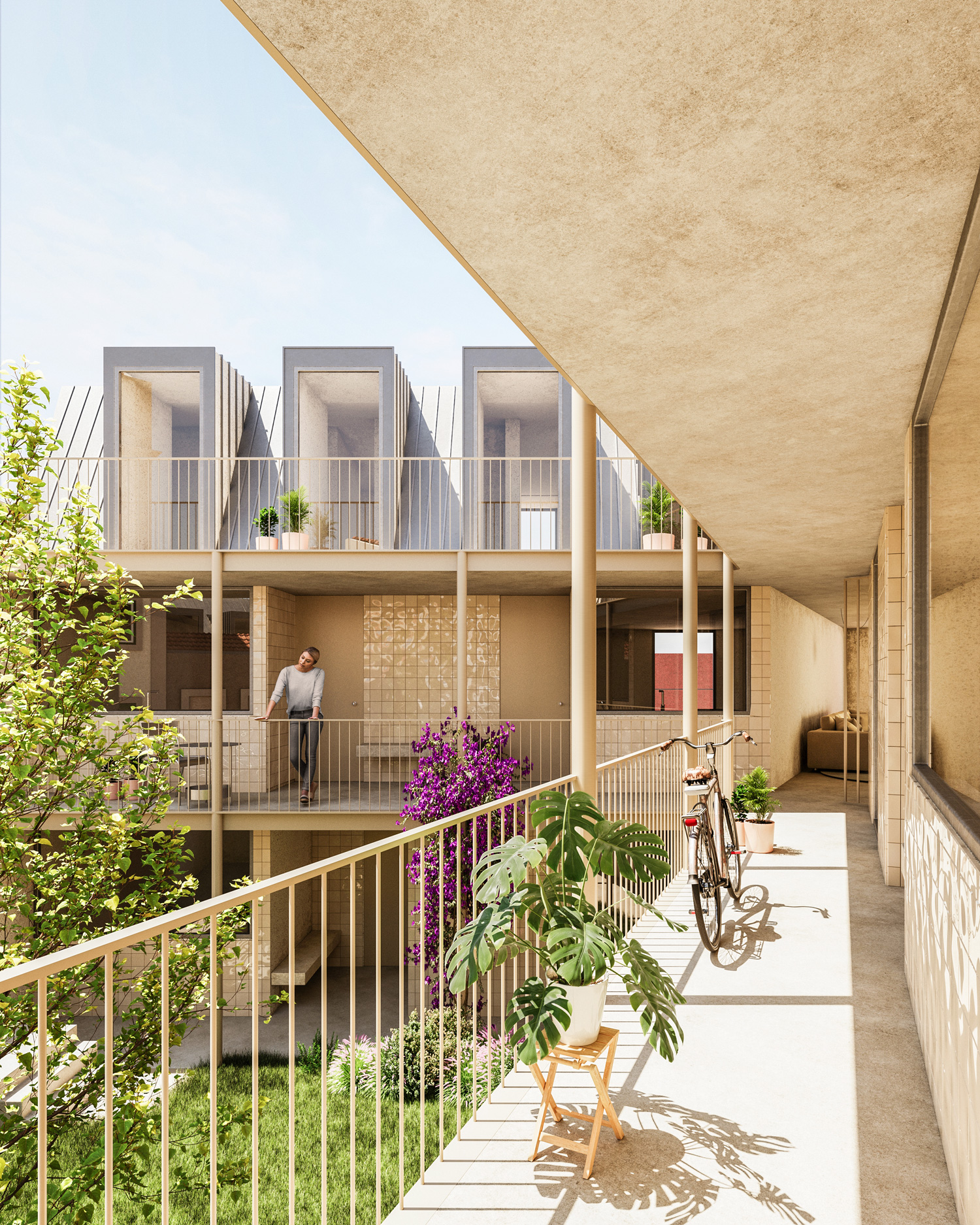 The first floor is thus demarcated by the counterpoint to the volume of the building, allowing residents and citizens to circulate freely as if it were a roundabout. This is where community spaces, technical spaces and bicycle parking are located. The constitution of the building makes it possible to create a tapering off of access to the galleries, which is then relieved in a large and generous patio that appears in counterpoint to the building.