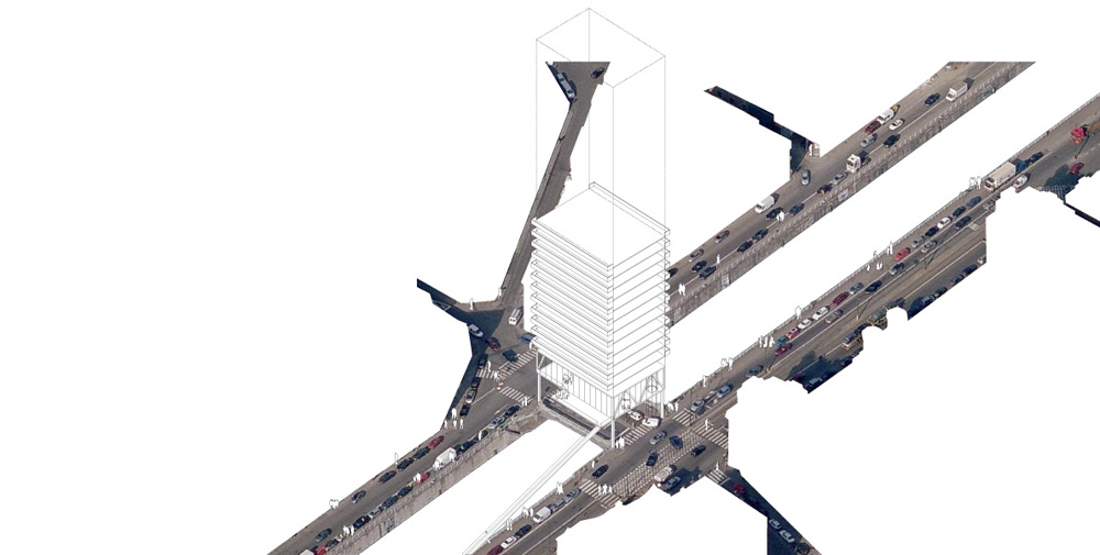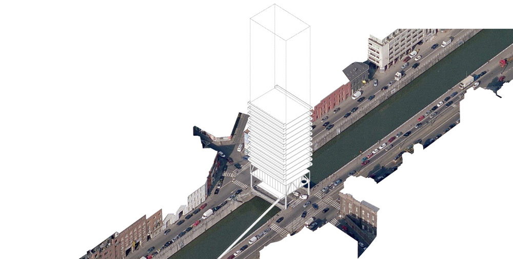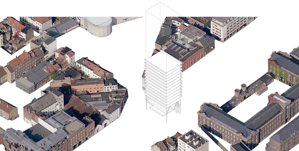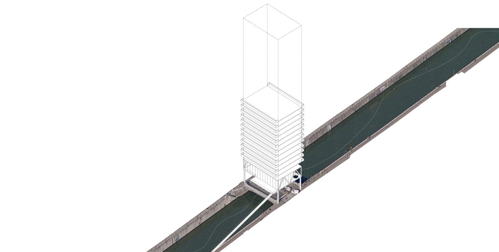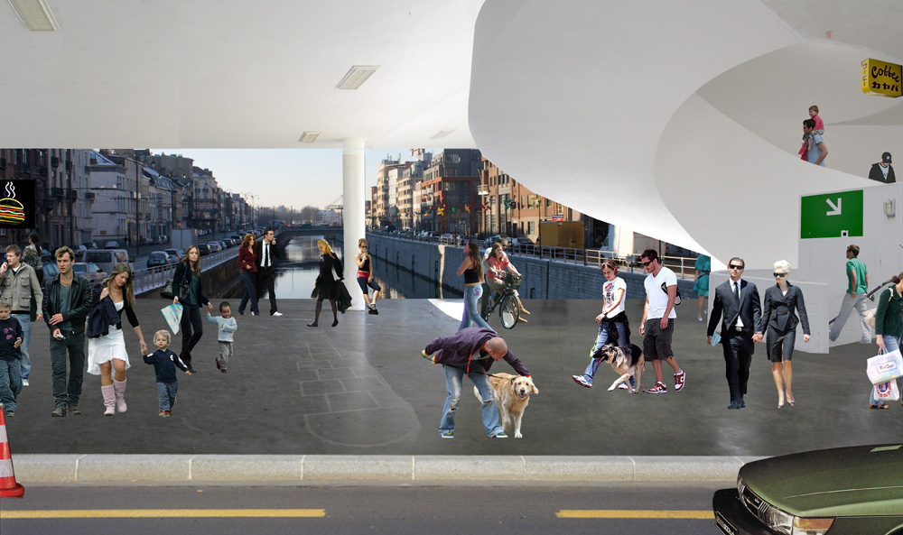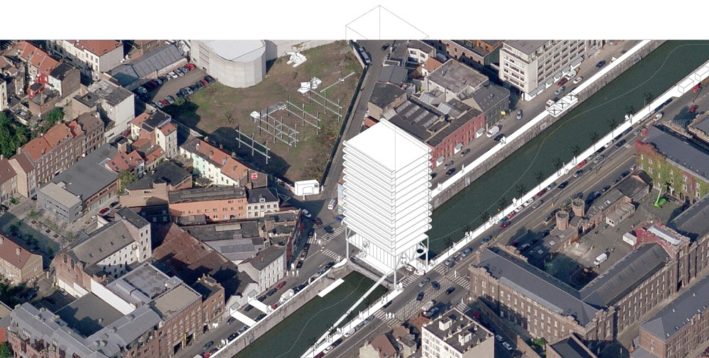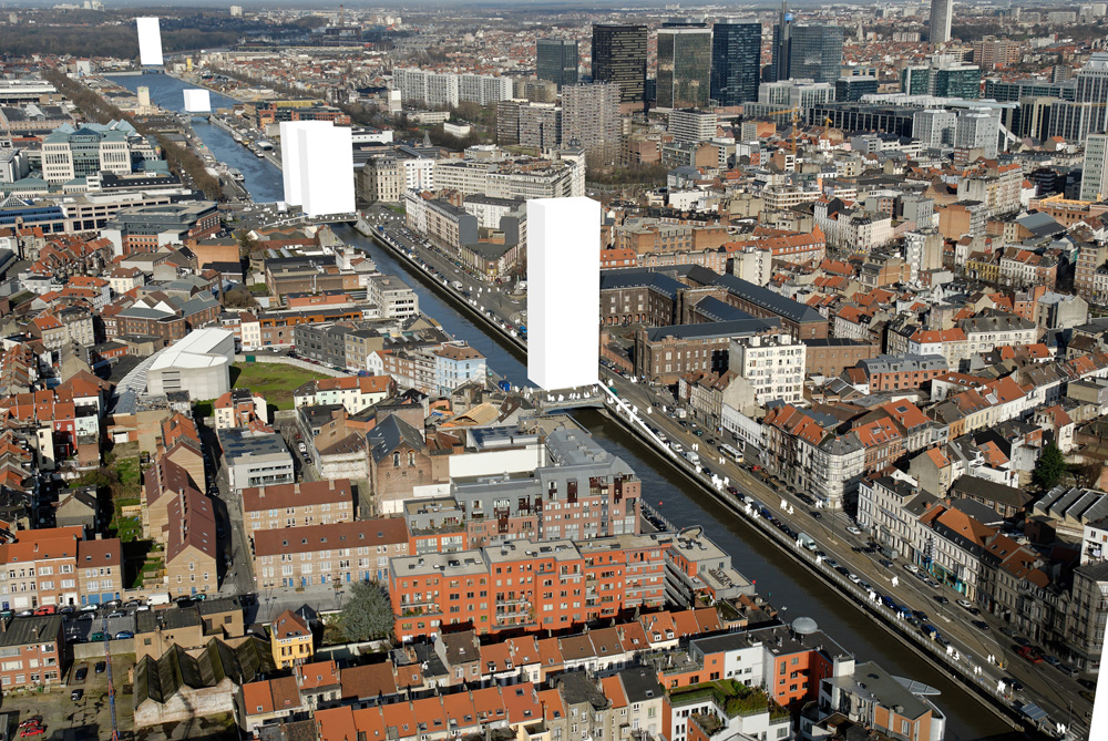 Construire les 18 ponts de Bruxelles pourrait produire 250 000 m² en plein cœur de la Capitale (hauteur hypothétique moyenne de 50 m). Nous estimons que la meilleure façon de répondre à la revalorisation des berges est de créer les conditions de cette requalification (densité) plutôt que de simuler des installations plus ou moins habiles. Nous envisageons 18 « bâtiments ponts », comme des volumes capables au service de la ville: Logements pleins cadres sur les horizons du canal, bureaux au sein des tissus historiques et résidentiels, cafés sur les toits de Bruxelles, nouvelles pratiques fluviales…