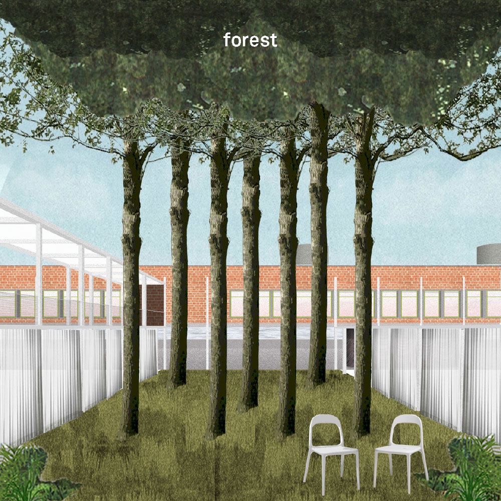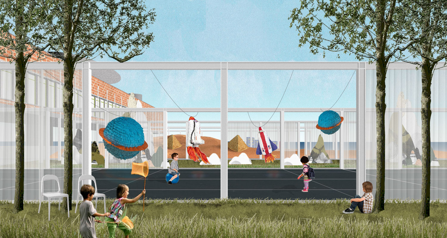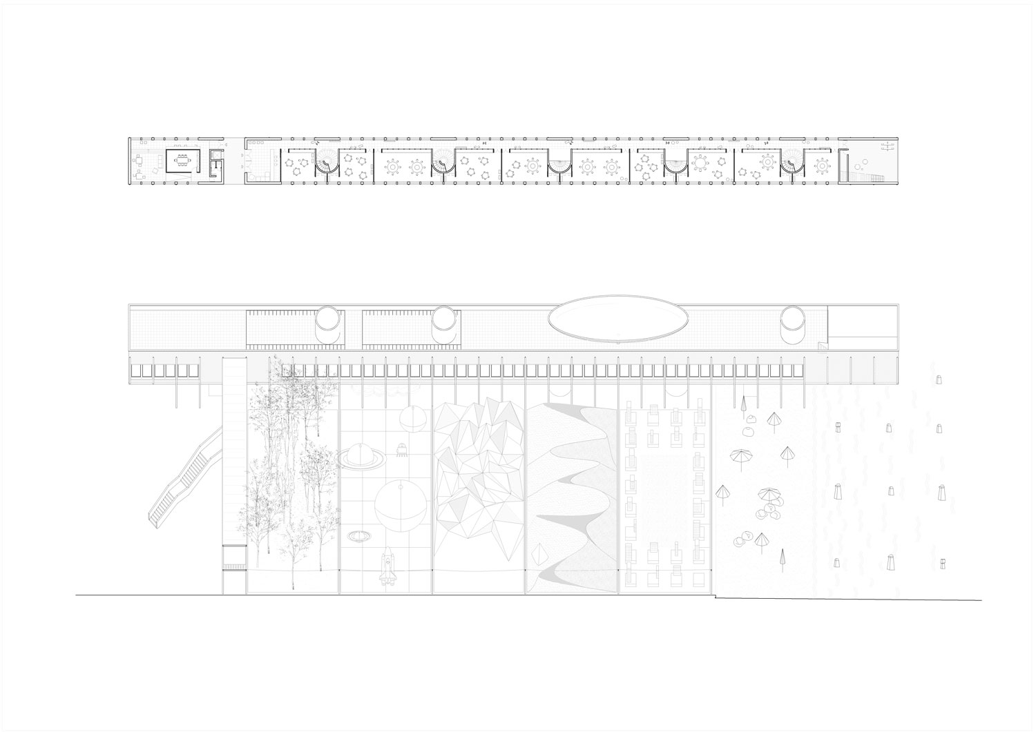 In 1657, in Netherland, the painter Pieter de Hooch realised The Courtyard of a House in Delft. In the painting, the urban space and the domestic space are mixed and the city can be seen as a sequence of spaces, a continuity of different rooms. The building, which contains all the functions connected to the daycare, is arranged along a corridor located in the norther side of the plot. The volume, uplifted from the soil, designs the exterior spaces which interlay occupies the site. At first a public piazza, facing the sidewalk, allows the entrance to a sequence of spaces with a special environmental connotation: a sequence of Dioramas. We cross the forest, the cosmos, the mountain, the desert and the metropolis to nally reach the beach at the end of the pier, untouched by the project. The daycare is the first public room in the human experience, the dioramas, as samples of the entire world, are able to teach the kids about our environment by giving them a playful experience.