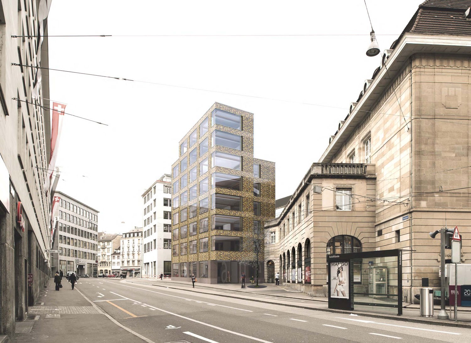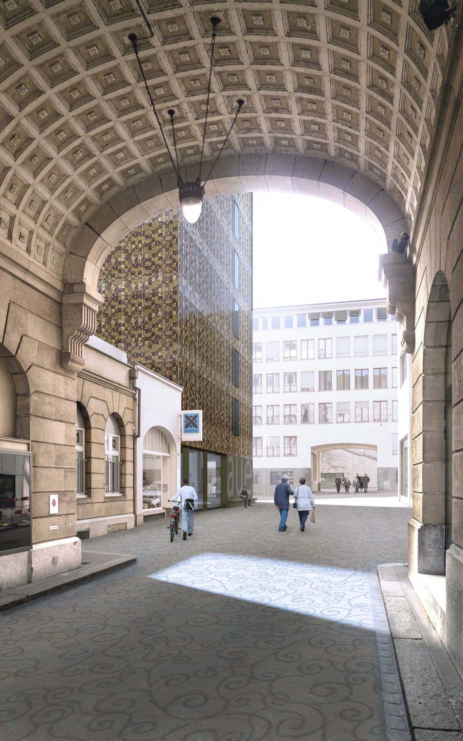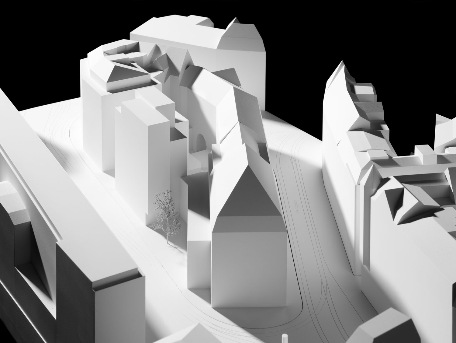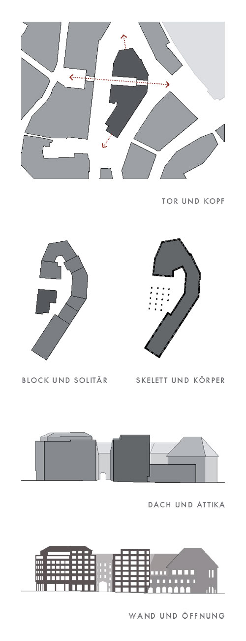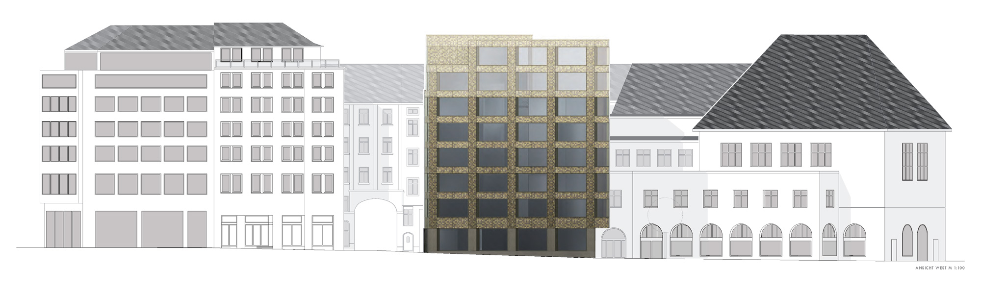Das für den Neubau einzuhaltende Lichtraumprofil wird in ein Volumen mit Flachdächern umgesetzt, welches durch eine differenzierte Höhenstaffelung räumliche Bezüge zu der heterogenen städtebaulichen und architektonischen Umgebung schafft. Die horizontale Staffelung des Gebäudes entlang seiner Längsachsen schafft Vor- und Rücksprünge, welche dem grossen Gebäude eine dem Strassenraum angemesssene Massstäblichkeit verleihen. Eine Auskragung der oberen Geschosse über dem Erdgeschoss in Richtung Fischmarkt markiert den öffentlichen Zugang zum Gebäude und bildet zu diesem ein Vordach. Gleichzeitig bildet sie eine Fuge zur Bestandesbebauung.
