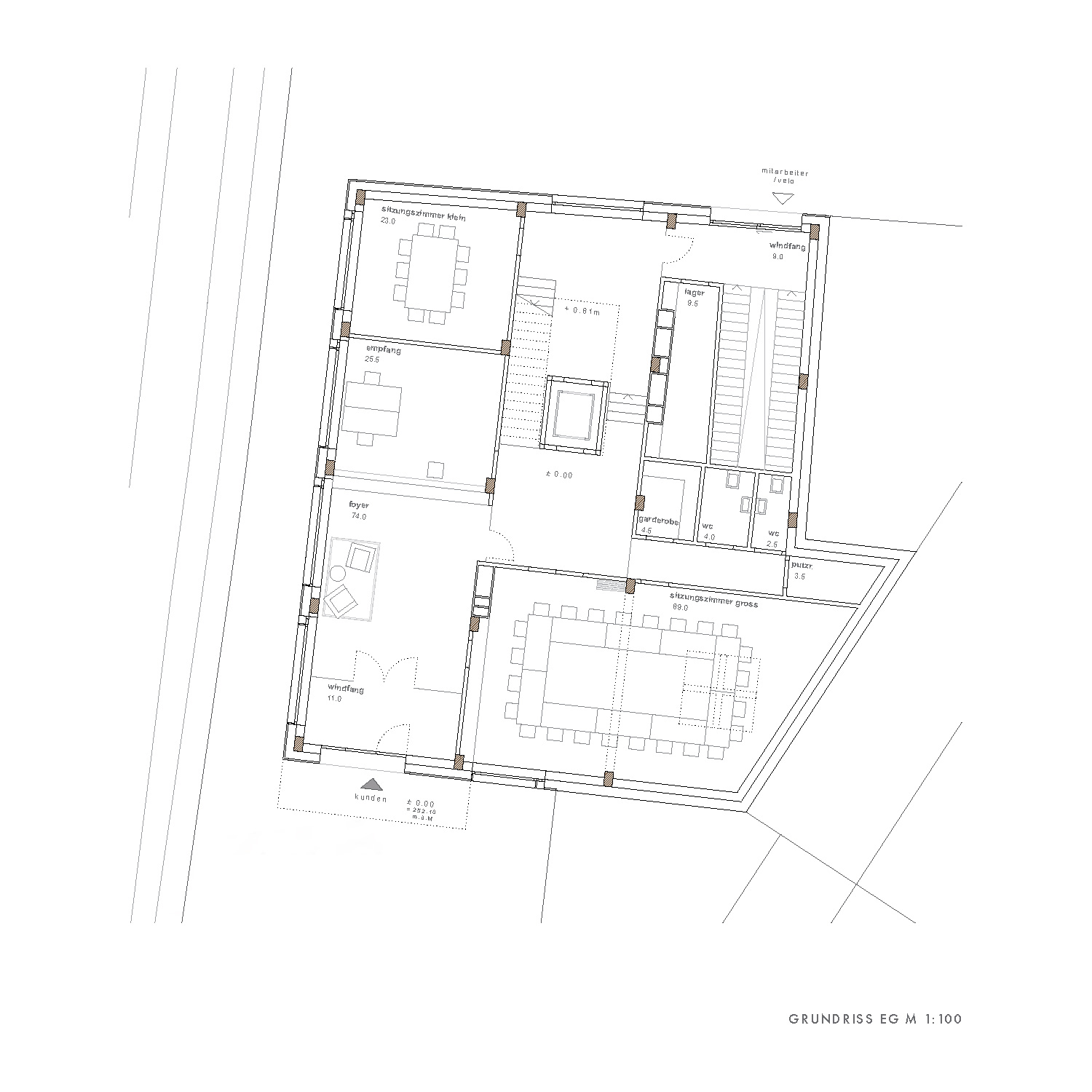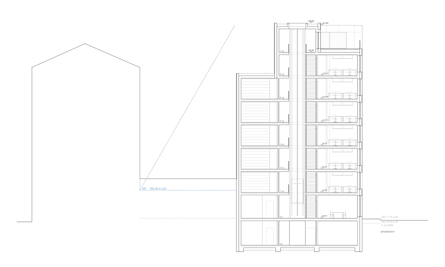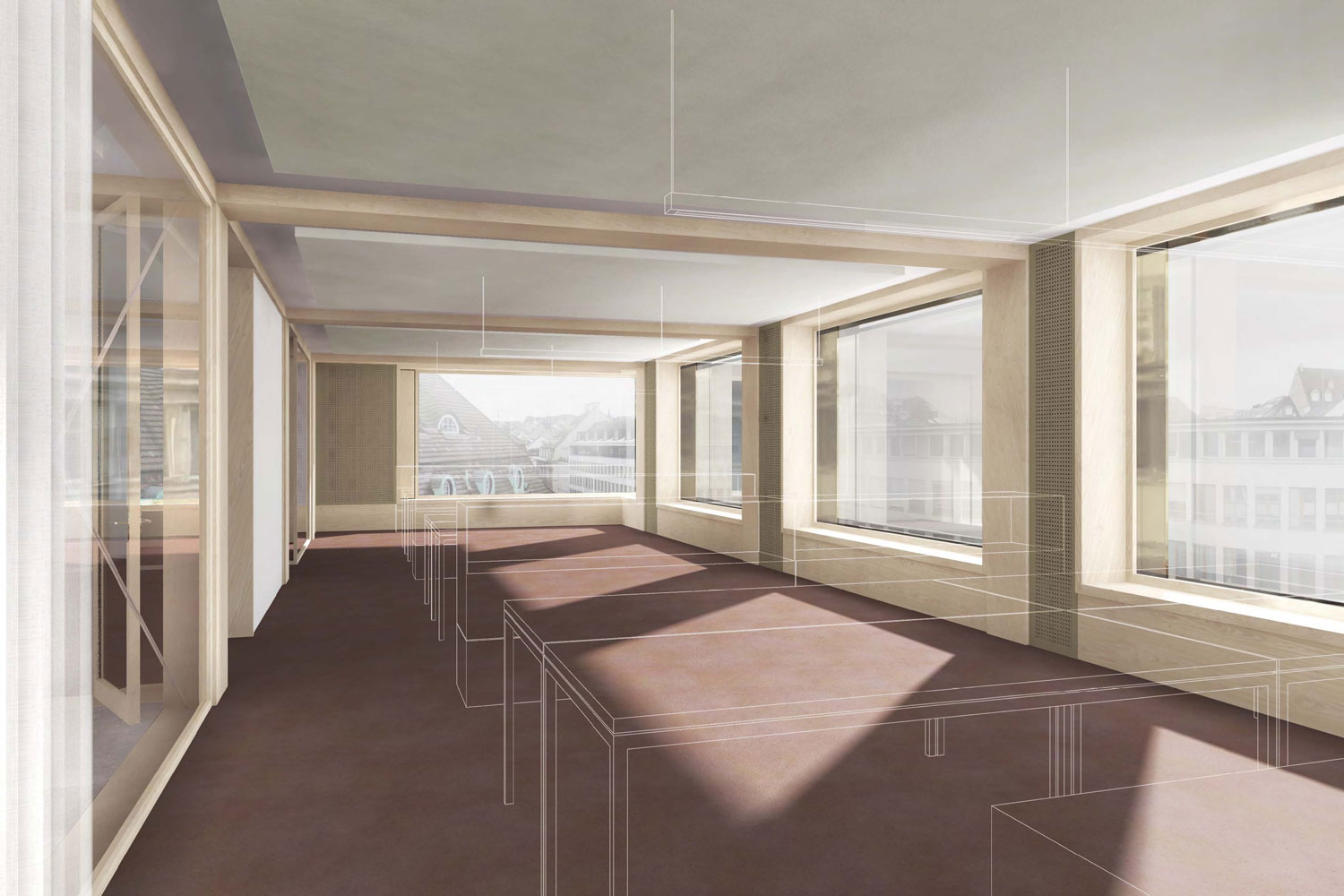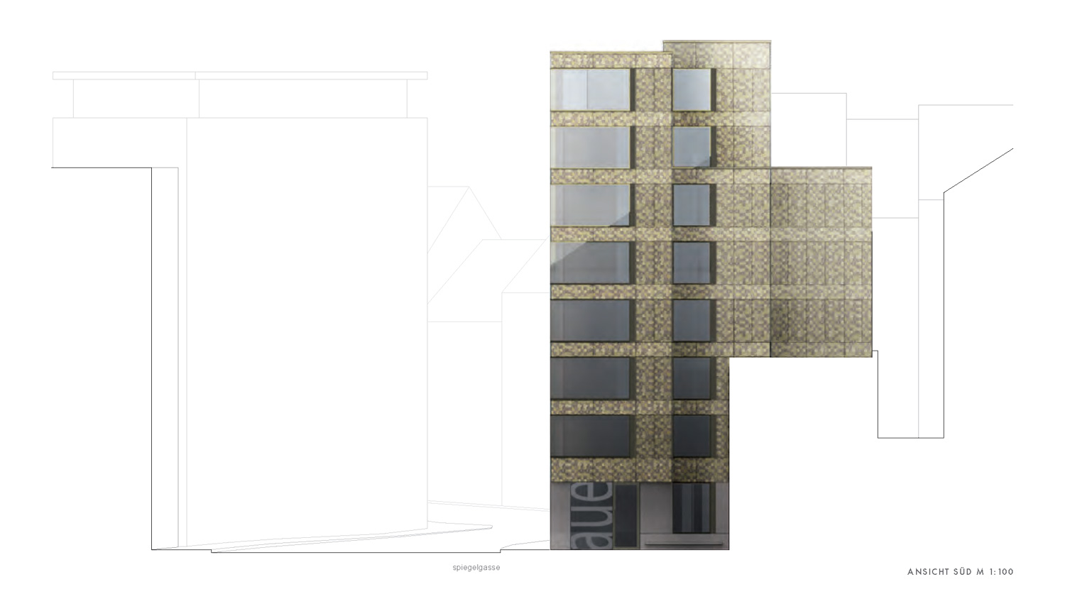 Das für den Neubau einzuhaltende Lichtraumprofil wird in ein Volumen mit Flachdächern umgesetzt, welches durch eine differenzierte Höhenstaffelung räumliche Bezüge zu der heterogenen städtebaulichen und architektonischen Umgebung schafft. Die horizontale Staffelung des Gebäudes entlang seiner Längsachsen schafft Vor- und Rücksprünge, welche dem grossen Gebäude eine dem Strassenraum angemesssene Massstäblichkeit verleihen. Eine Auskragung der oberen Geschosse über dem Erdgeschoss in Richtung Fischmarkt markiert den öffentlichen Zugang zum Gebäude und bildet zu diesem ein Vordach. Gleichzeitig bildet sie eine Fuge zur Bestandesbebauung.