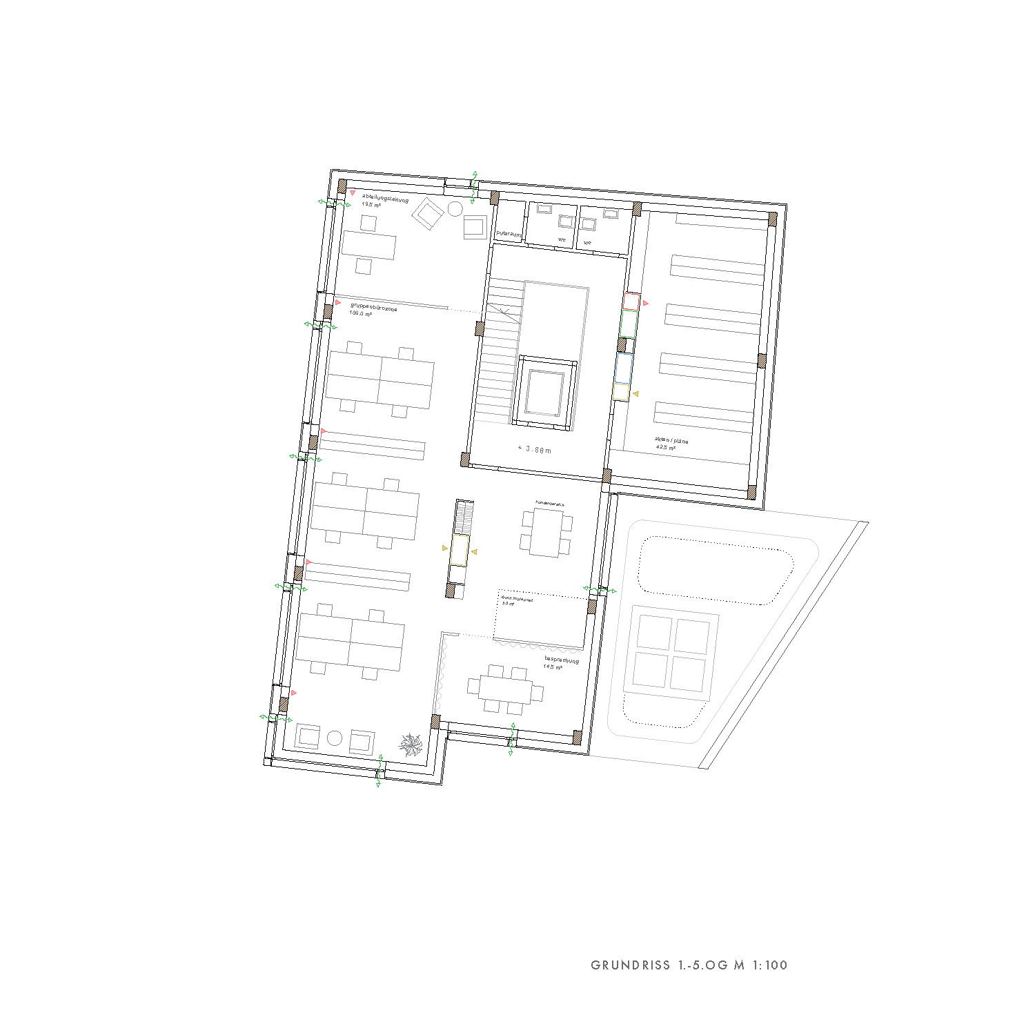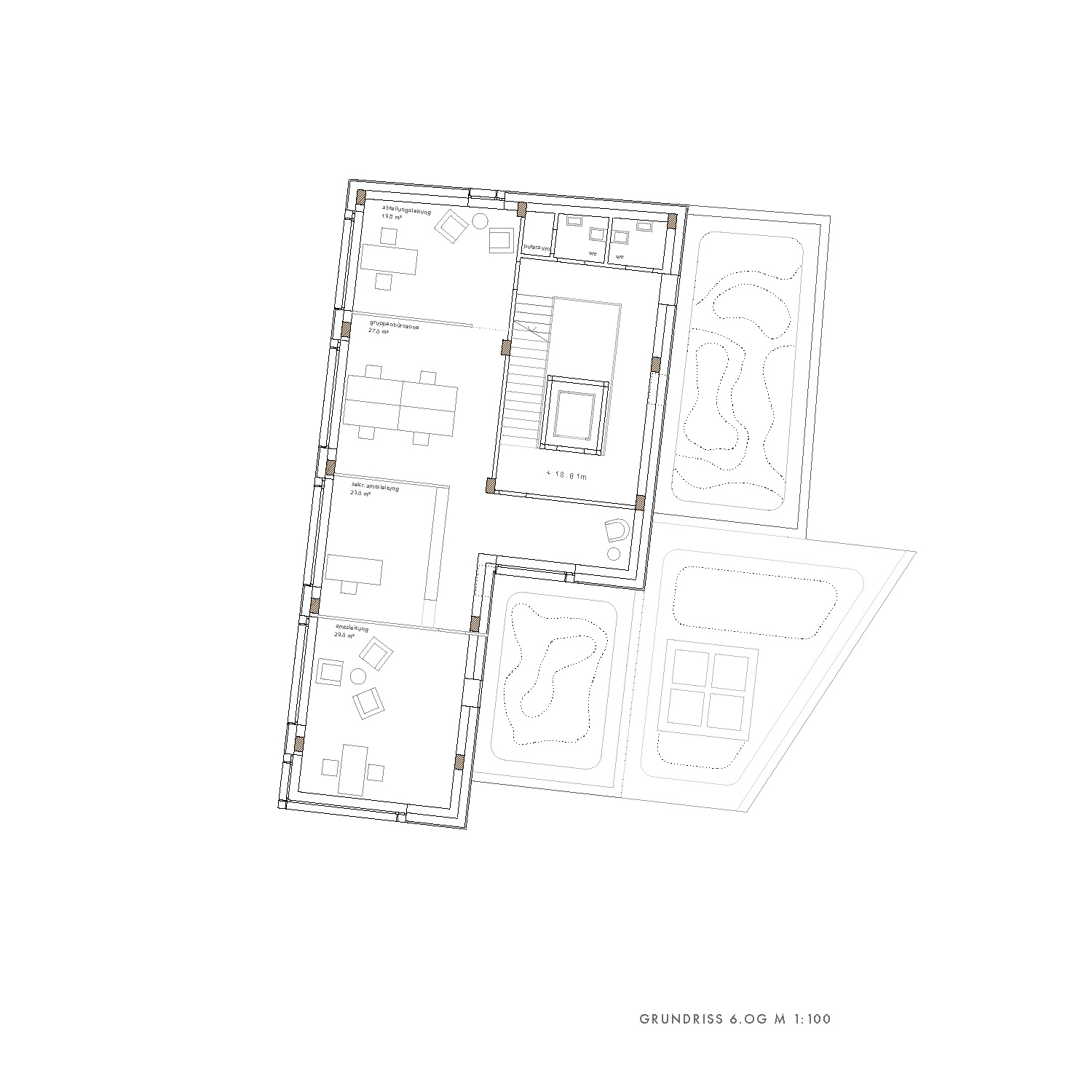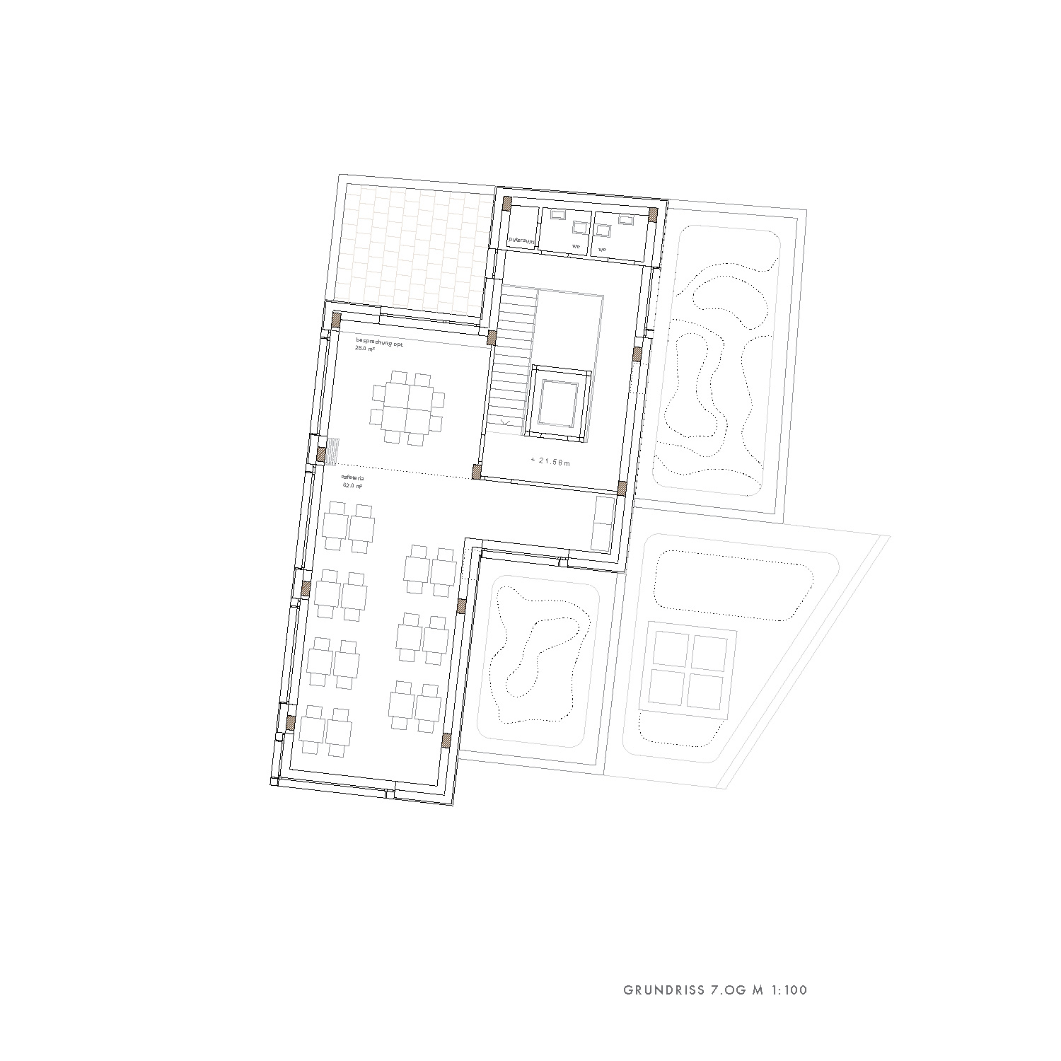 Die als Ablagefläche vorgesehene Raumschicht auf der Ostseite ist über das Treppenhaus erschlossen. Die Verfasser schlagen die architektonisch mögliche Befensterung dieses Bereichs nur als Option vor. Dadurch ergibt sich aber eine einschränkende Flexibilität in der Nutzung. Im obersten Geschoss befindet sich an attraktiver Lage eine Cafeteria. Der im Norden direkt anschliessende Flachdachbereich ist als Terrasse zur Nutzung im Zusammenhang mit der Cafeteria vorgesehen. Eine Bewirtschaftung dieses Bereichs stellt eine hohe Anforderung an die architektonische Umsetzung (Geländer, Markisen, Möblierung). Das klar abgestufte, von Fassaden und Dächern eingefasste und begrenzte Gebäudevolumen könnte in seiner Wirkung beeinträchtigt werden.
