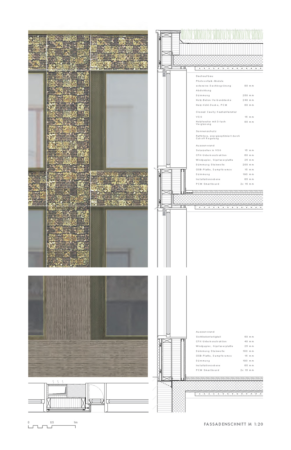 Die Gebäudehülle erfüllt als mehrdeutige Schicht gleichberechtigt mehrere Funktionen: Witterungsschutz, Stromerzeugung und farbliche Einpassung. Keine dieser Funktionen wird demonstrativ hervorgehoben. Gliederung und Farbigkeit der PV Zellen erzeugen eine ornamentale Musterung der Fassade, welche das Gebäude mit der Blocknachbarschaft verbindet. Die technisch aktivierte Gebäudehülle wird periodisch zur Erhaltung ihrer Funktionalität ausgewechselt werden müssen. Dabei ist eine Veränderung des Erscheinungsbildes zu erwarten; die Qualität dieser mittelfristigen Eingriffe ist in grossem Mass von deren architektonischen Bearbeitung abhängig.