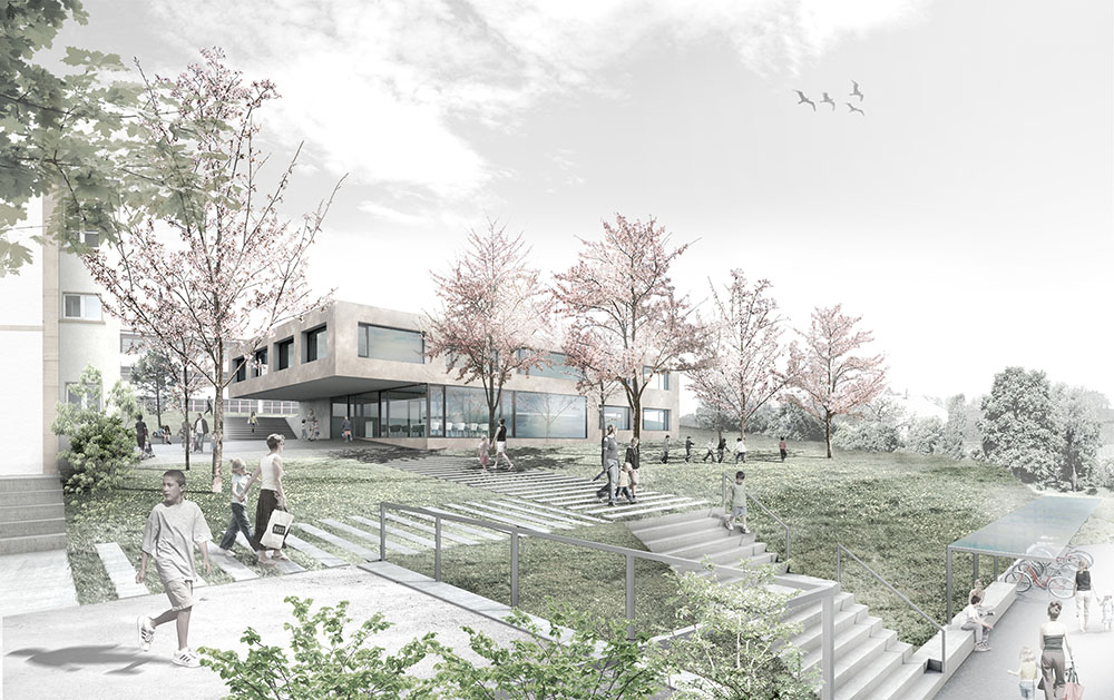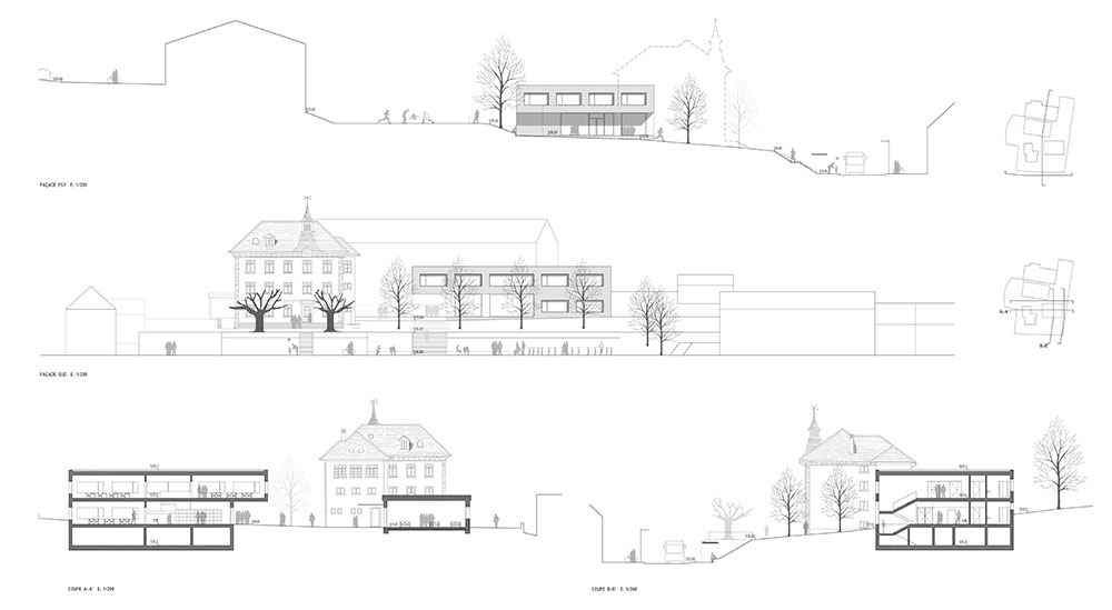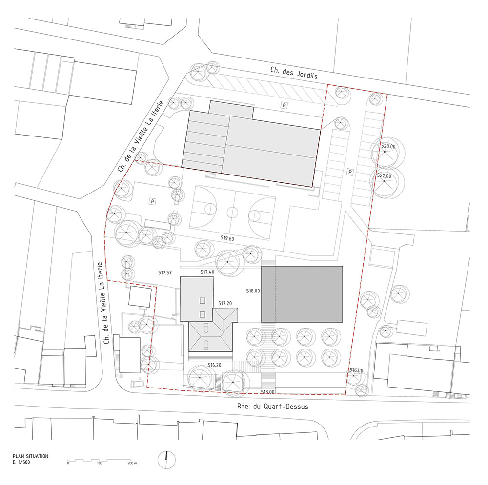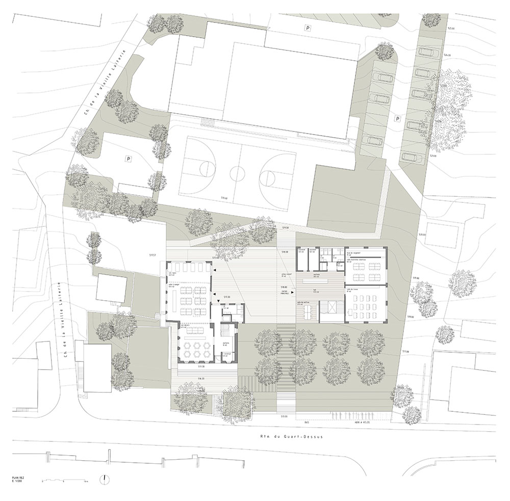 La différence de cote existante entre la voie routière (Route du Quart Dessus) et la parcelle actuelle est importante et provoque un manque de connexion visuelle entre les équipements et le tissu urbain de Lugnorre. Le projet propose de renaturaliser cette façade à travers un talus végétal doux qui remplacera le mur en béton et le bâtiment existant. Le contact visuel sera donc plus doux, le talus invitera à monter et, donnera accès, grâce à l’escalier, au nouveau jardin d’entrée. Une vaste surface perméable de pelouse amène vers la nouvelle architecture, située en arrière-plan, à travers des arbres fruitiers qui transmettront toutes les nuances saisonnières et didactiques des espaces cultivés. Les passants traverseront le jardin et les arbres pour atteindre le cœur du projet: la nouvelle place dont le vide relie les deux architectures. Au pied du talus, nous proposons un couvert qui sert d’abri à vélo et d’arrêt de bus muni d’un banc longitudinal qui contient la terre. Les accès pour les personnes à mobilité réduite depuis les parkings de la parcelle sont assurés grâce à des passages aménagés et des rampes reliées àla place minérale donnant accès aux deux bâtiments.