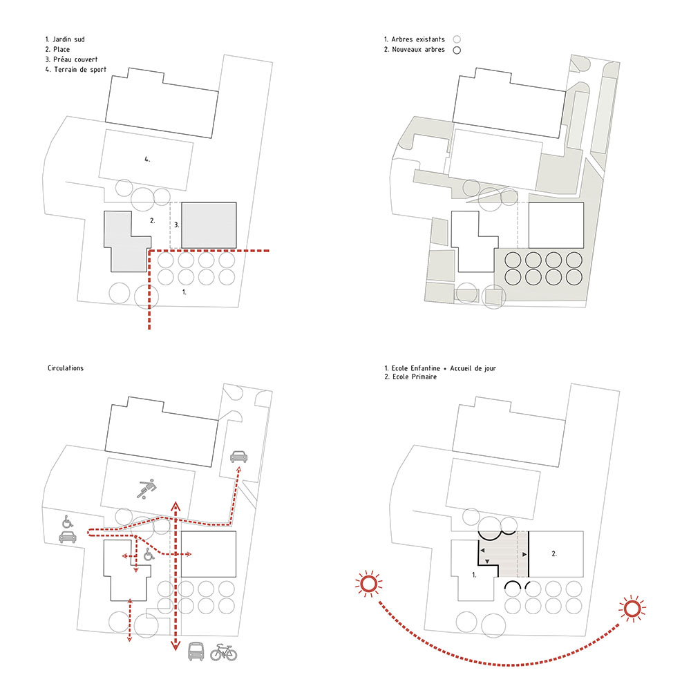 La position stratégique de la nouvelle école de Lugnorre dans la parcelle existante définira clairement les espaces extérieurs où se dérouleront les activités en plein air. L’emplacement du nouveau bâtiment crée trois espaces principaux: un jardin boisé, une nouvelle place (avec porche couvert) et le terrain de sports. Le nouveau bâtiment se place en retrait par rapport à la façade de l’ancienne école, lui laissant son rôle de protagoniste et générant ainsi un grand espace libre à l’avant. Ce nouveau jardin boisé orienté au sud, deviendra la nouvelle façade de l’école côté Route du Quart Dessus. Cette nouvelle cour d’accès fera le lien entre les façades des deux bâtiments (datés de 1853 et 2014). La nouvelle place, définie par la façade arrière du bâtiment actuel et l’entrée de la nouvelle école, deviendra, pour les élèves des deux bâtiments scolaires, un espace de socialisation, rencontre, repos et méditation. Le terrain de sports existant complète les trois espaces extérieurs principaux, qui se connectent entre eux par un grand axe qui les traverse et les relie.
