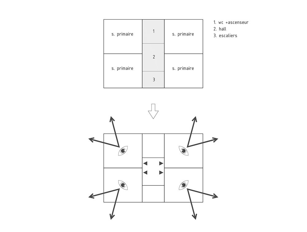 L’architecture du nouveau bâtiment répond à un schéma structuré et simple qui favorisera sa rationalisation constructive et son agrandissement éventuel. Séquence du projet: salles de classe + services + salles de classe. Un grand noyau central de services et communications (escaliers, hall distributeur, ascenseur, toilettes et chambre de nettoyage) de chaque coté du bâtiment sert les salles de classe. Ceci permet à toutes les salles de classe de bénéficier d’une double orientation et des vues sur le paysage, la parcelle et le jardin boisé. Au rez-de-chaussée, le grand hall d’entrée sert d’espace d’accès à l’école depuis le porche couvert et la place; un espace pour l’accueil, la détente, des réunions ou des expositions… Un espace sur double hauteur héberge le grand escalier menant au premier étage qui s’oriente vers le sud et les arbres fruitiers du jardin. Cet espace de montée illumine le hall d’entrée depuis le sud ainsi que l’espace d’accès aux salles de classe au premier étage. Le système structurel s’appuie sur la rationalité du plan et définit de manière ordonnée les espaces vides qui se répètent tout le long de la façade. Par souci de simplicité, l’extension éventuelle de l’école est basée sur la répétition à l’étage, de deux salles de classe supplémentaires et du noyau central de communications et services (salles de classe et services). Ce nouveau volume occupera l’extrémité Ouest du bâtiment qui donne sur la place, et coté Est il restera un volume vide dégagé qui sera utilisé comme toiture végétale partiellement aménagée en terrasse. Ce vide sur la toiture sera compensé par le vide du porche existant au rez-de-chaussée. Le système constructif et la composition des espaces vides sur la façade seront reproduits. L’agrandissement ne perturbera pas le fonctionnement de l’école et respectera et complétera l’esprit et le caractère de ce nouveau centre scolaire de Lugnorre.