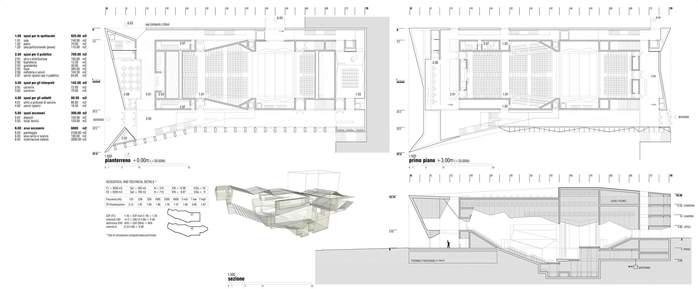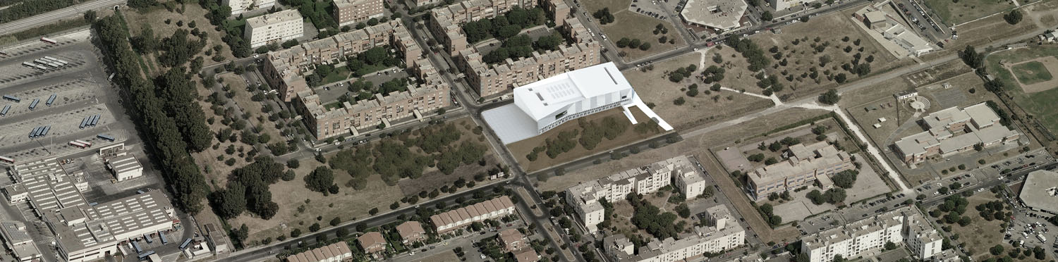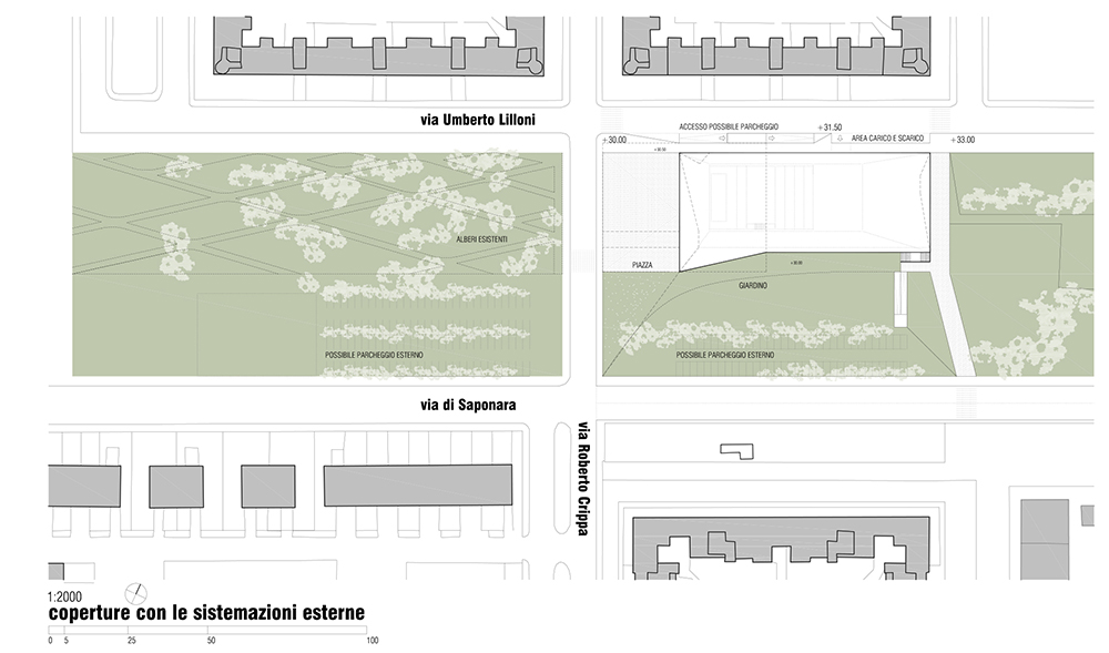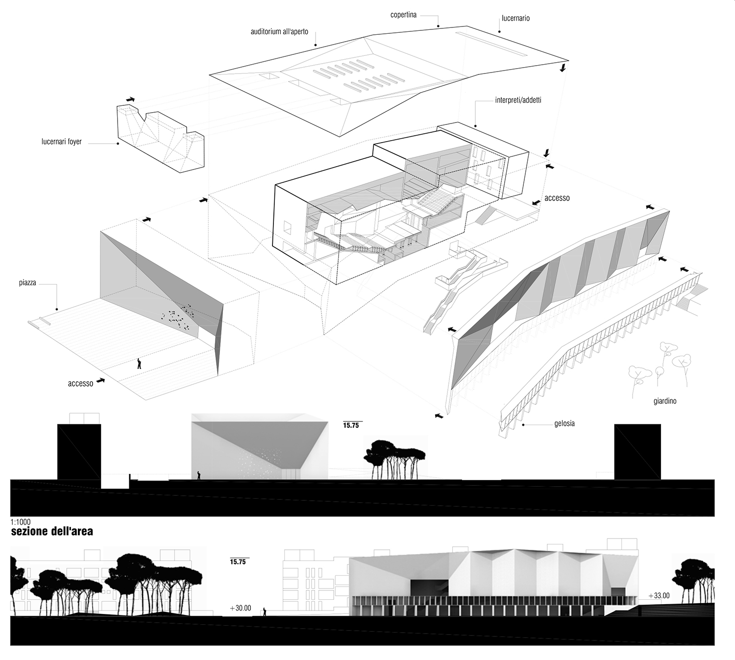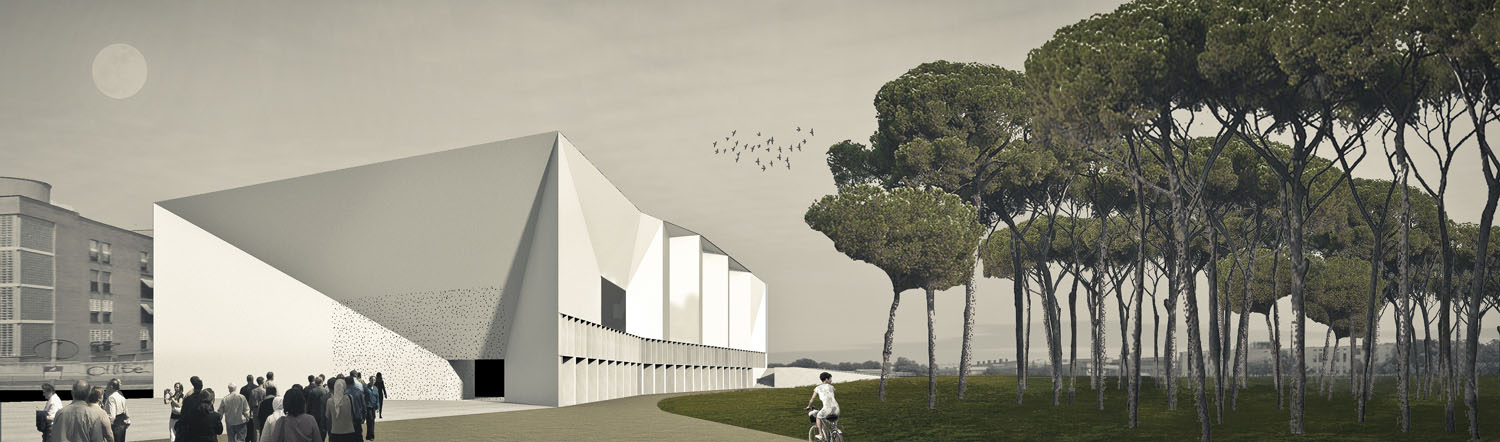As in other recent occasions, the proposal is developed around the idea of simplicity, obtained by a simple, lyrical, serene, and evocative architecture. We propose a double concert hall, which allows flexibility and versatility for any musical or theatrical event. It has an exceptional acoustic performance (tested in similar rooms), and permits events of different capacity. The building is aligned to via Umberto Lilloni, allowing full continuity of the park. The auditorium is partially buried to minimize the overall height. Main access faces the future park through a piazza, and a secondary access is set in the opposite facade. The atrium can be used as an exhibition space, fully open to the garden and houses the main stairs in an area of great beauty. Service access, loading and unloading, are located to the north facilitating the stage operations. The rooms for performers and offices are organized in various heights above the secondary access. We also propose the roof as an outdoor auditorium for those warm summer nights in Rome.