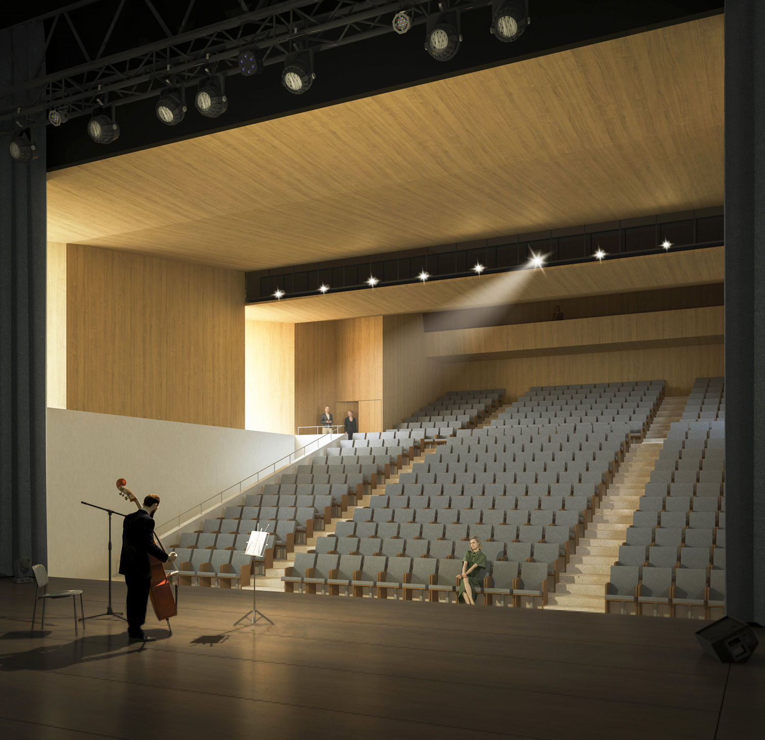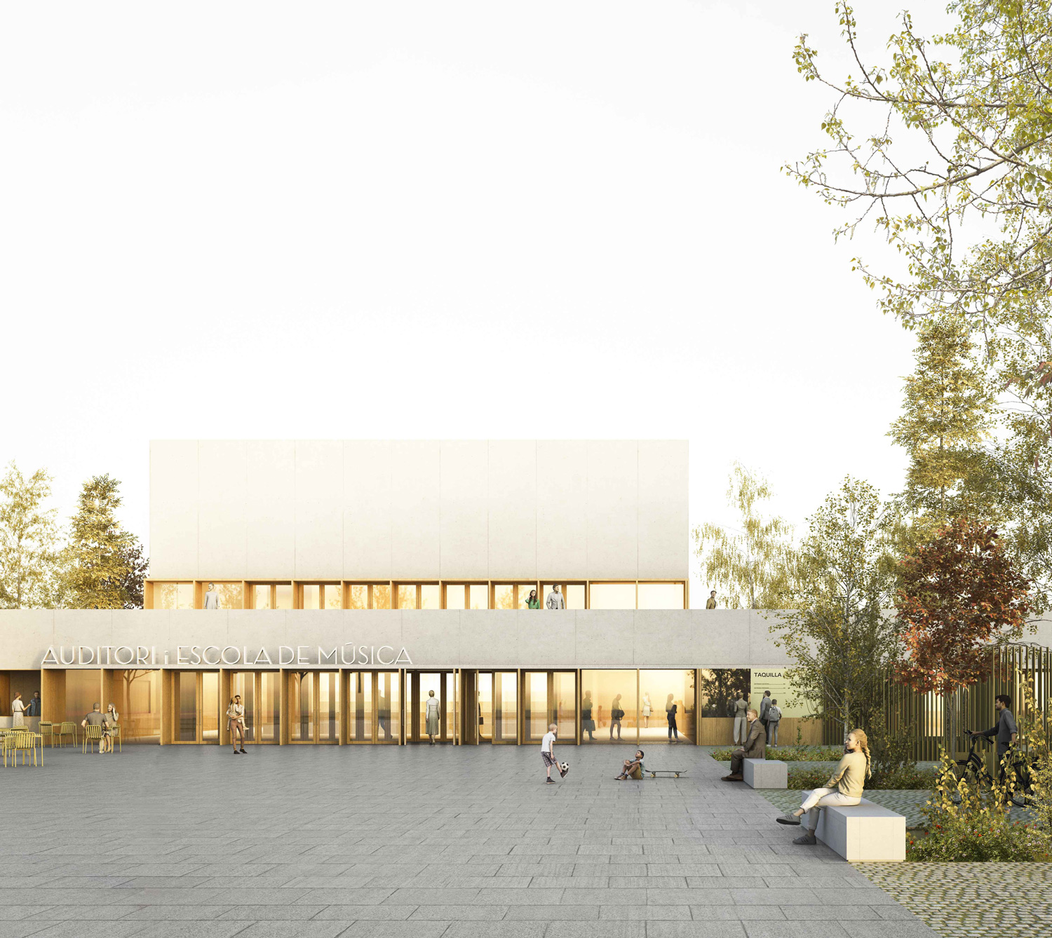 The competition calls for the construction of an auditorium and a music school and the development of the remaining free space on the plot. The mentioned urban conditions define the implementation of the project: in the southern part, all the free areas will be concentrated in such a way that a large square will be created to gather all the pedestrian flows leading to the plot, a multifunctional space on the ground floor and in the open air that will become part of the public space network of the town. In the northern part of the plot, the entire built volume of the building will be concentrated in such a way that its southern façade can be directly related to the square, extending it into its interior and therefore becoming a new urban front as a perspective background.