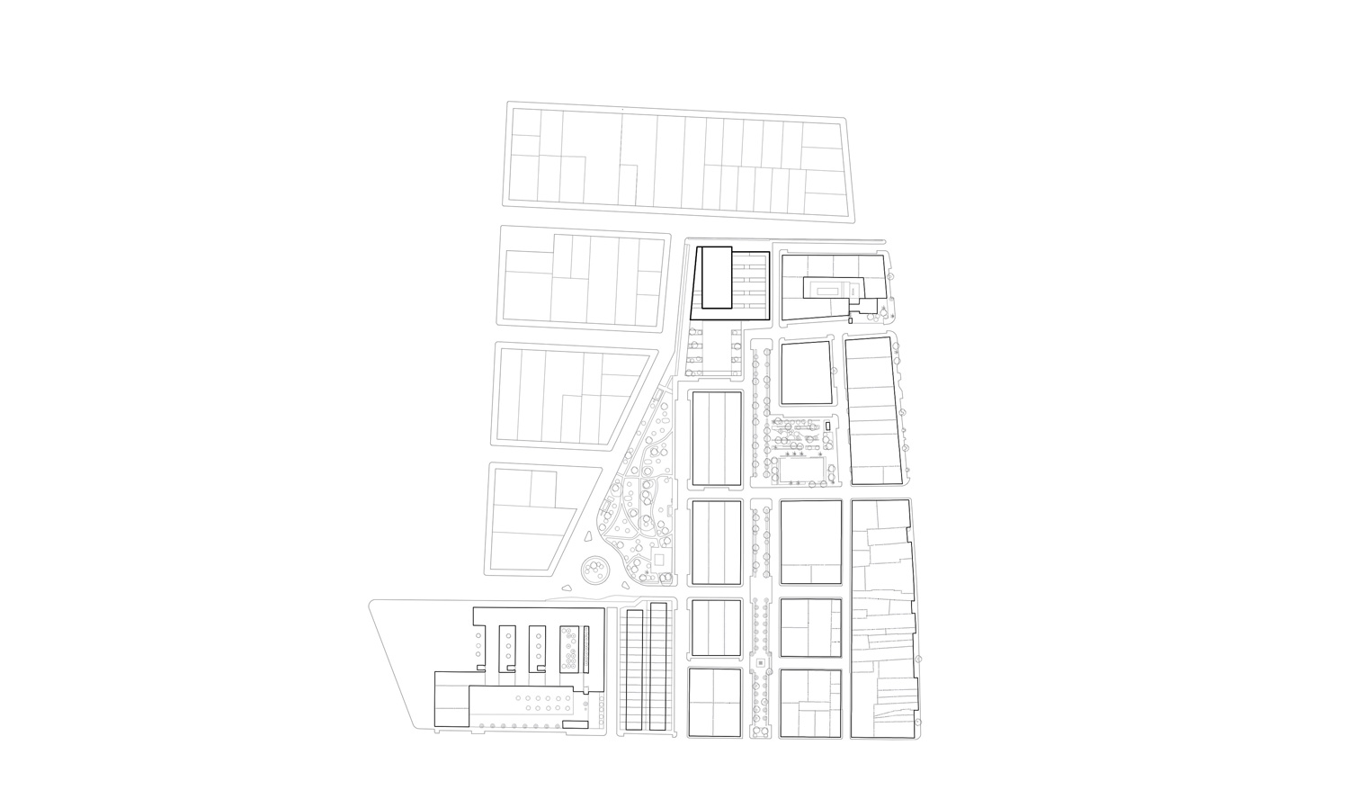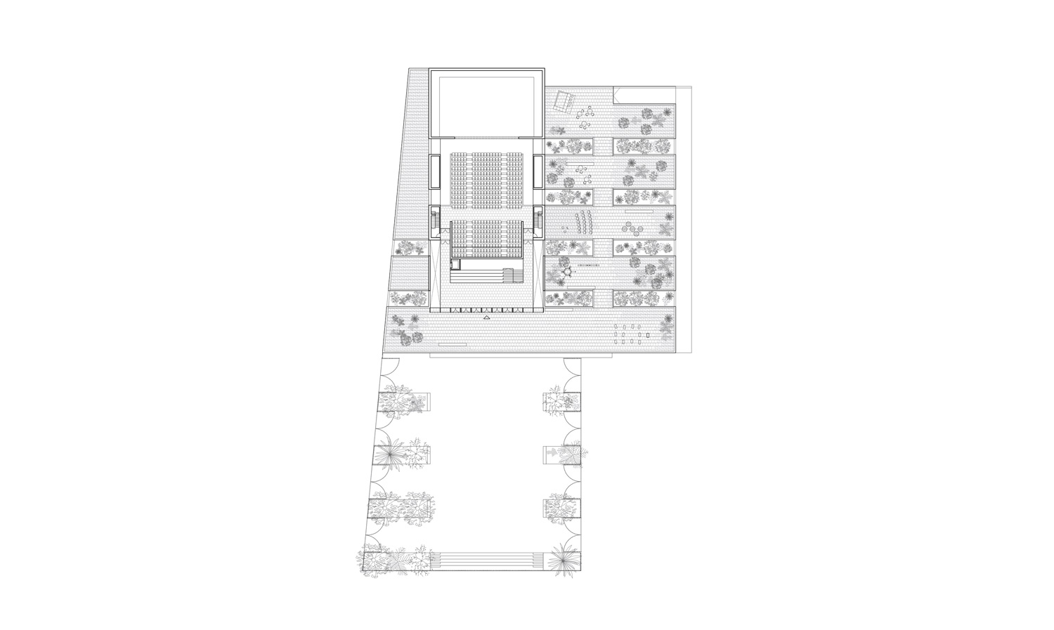 This volume is divided into two parts so that it can be built in independent phases, with each part of the programme being fully functional by itself. The geometry of the plot implies that one part of the new building will face the new square while the other will face the avenue. In the proposed building, the auditorium programme involves a higher volume than the music school on the ground floor, which will have a landscaped roof as required by the competition. For this reason, the music school is located in the eastern half of the plot, so that its roof is an extension of the green of the avenue. On the other hand, the auditorium is located in the western half of the plot: its higher volumetry becomes a built front to the industrial complex and its leisure activity is directly linked to the outdoor square it faces.