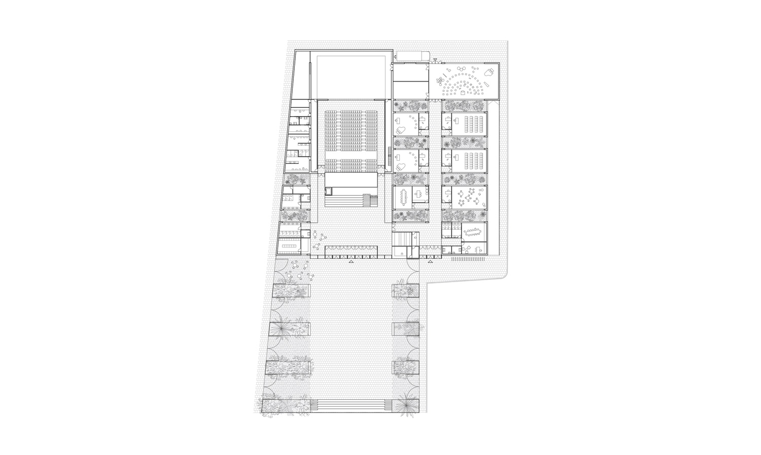 This is why the exterior vectors have continuity in the interior and the square becomes the foyer in the auditorium while the axis of the promenade becomes the corridor of the music school. In this way the spaces of distribution and spatial organisation become places of relationship in continuity with the public space. Perpendicular to these axes, a series of strips cross the building and become courtyards that allow the natural lighting and cross ventilation of all the rooms and spaces of the project.