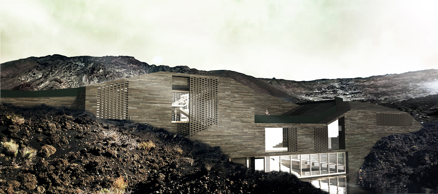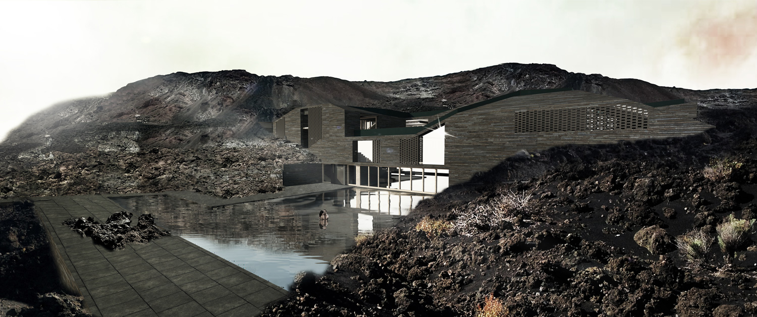 Los tubos de lava o caños de fuego, son las cuevas volcánicas más comunes en la isla de La Palma. La formación de las misma se efectúa cuando la lava fluye por el terreno preexistente siguiendo la trayectoria que menor resistencia ofrezca (la línea de máxima pendiente de la ladera o cauces fluviales previos). Las capas exteriores de la colada se endurecen al enfriarse, mientras el interior forma conductos horizontales que canalizan el flujo de lava permitiéndole avanzar más y posteriormente creando las cuevas. Partiendo de este fenómeno geológico, se ha procurado crear un diálogo entre masa y vacío, entre la luz y la penumbra, que sea capaz de generar toda la arquitectura del edificio. Como la lava que se solidifica en la superficie, generando a la vez cavernas en el subsuelo, el edificio se inserta como un objeto en el depresión geológica descrita en el capítulo anterior, generando un vacío entre el terreno y masa. Este vacío se materializa en la zona más plana del solar y alberga el balneario. El ubicar esta parte del programa en la cota más baja de la zona escogida, permite una relación directa y natural con el exterior, y los baños públicos que se plantean como una prolongación al aire libre del mismo edificio. Esta secuencia de espacios relacionados con los baños, se ve concluida en las antiguas galerías termales y en la playa, que tratan de incorporarse como parte activa del proyecto.