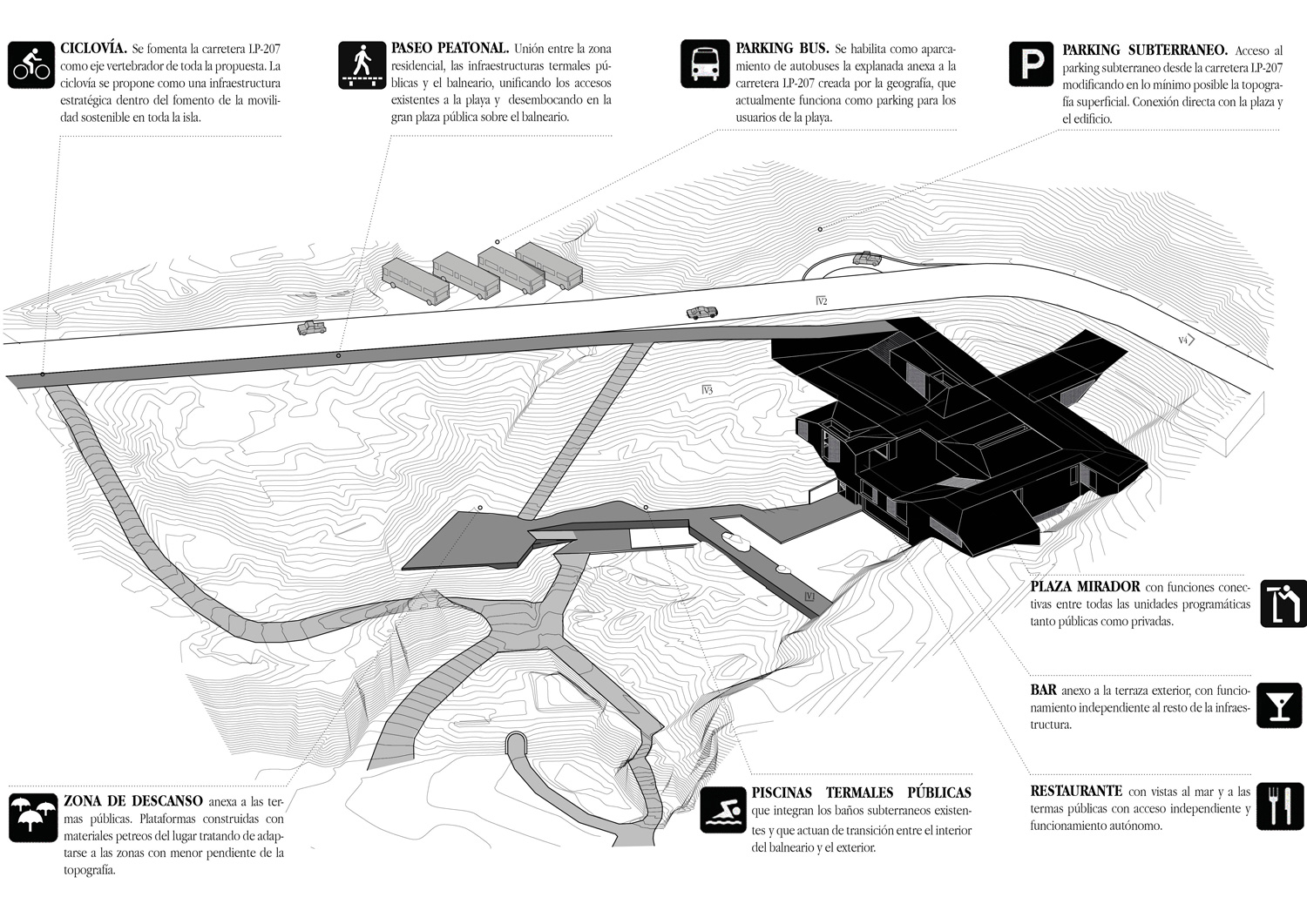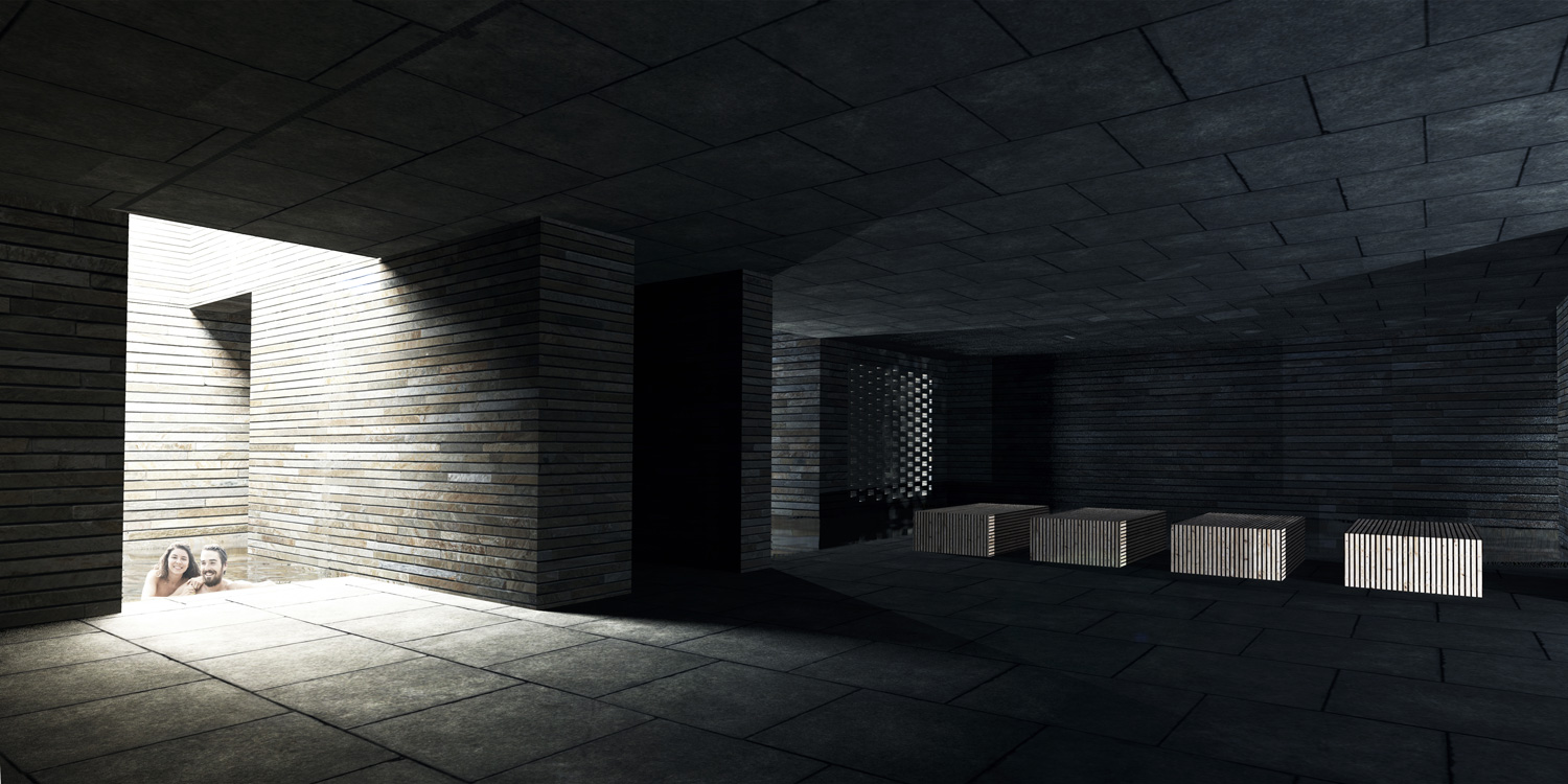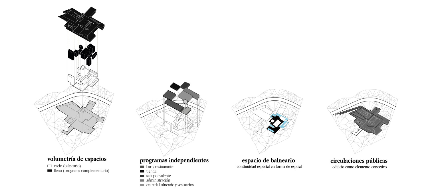 El antagonismo funcional entre distintas unidades programáticas se articula a través de la luz natural. En las plantas superiores, que podríamos asociar con el concepto de masa anteriormente mencionada, las unidades programáticas se extienden a través de 3 ejes perpendiculares hasta los límites marcados por el terreno. Esta extensión en forma de brazo, garantiza la iluminación y ventilación natural de todas las partes del programa ubicadas en la zona superior pero a la vez, crea una variedad de posibilidades para la iluminación del vacío o la zona de balneario. La masa superior es perforada en puntos estratégicos para iluminar zonas concretas del balneario creando atmósferas distintas según el tipo de tratamiento termal ofrecido por cada una.