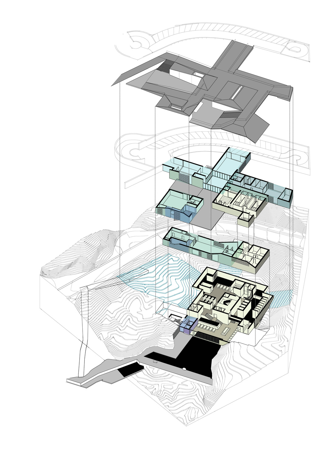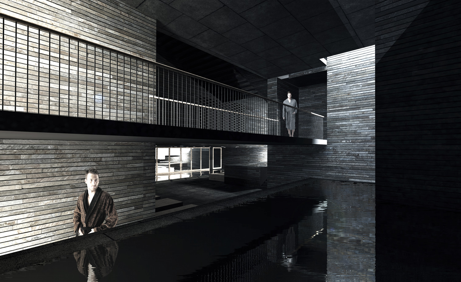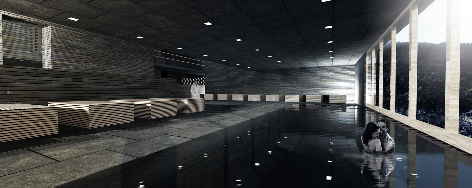 El antagonismo funcional entre distintas unidades programáticas se articula a través de la luz natural. En las plantas superiores, que podríamos asociar con el concepto de masa anteriormente mencionada, las unidades programáticas se extienden a través de 3 ejes perpendiculares hasta los límites marcados por el terreno. Esta extensión en forma de brazo, garantiza la iluminación y ventilación natural de todas las partes del programa ubicadas en la zona superior pero a la vez, crea una variedad de posibilidades para la iluminación del vacío o la zona de balneario. La masa superior es perforada en puntos estratégicos para iluminar zonas concretas del balneario creando atmósferas distintas según el tipo de tratamiento termal ofrecido por cada una.