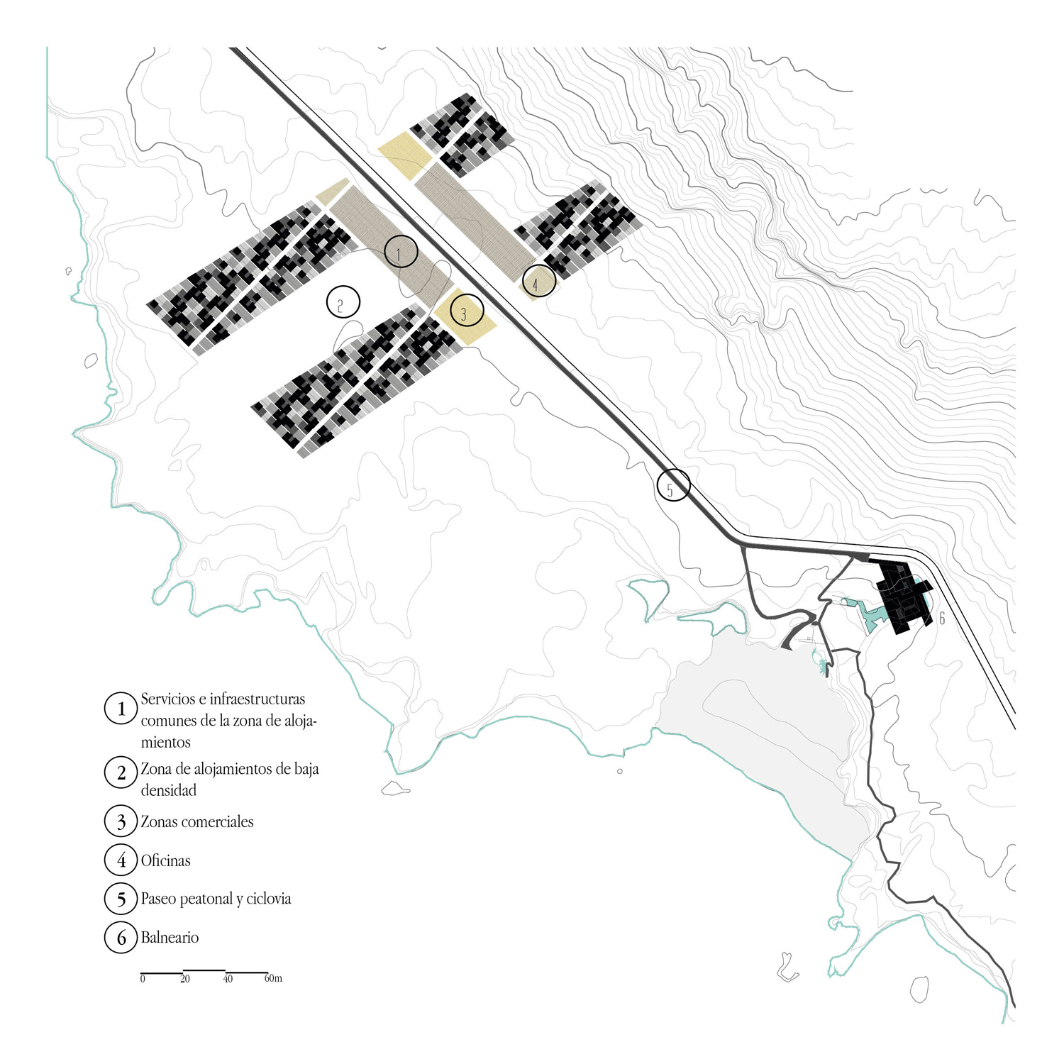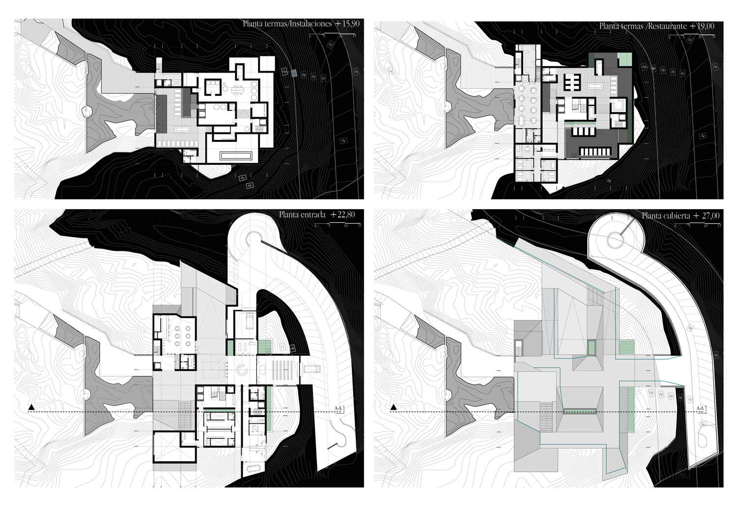 Al igual que la fachada y la cubierta, la estructura se convierte en parte de una concepción general de edificio más allá de los elementos reconocibles de la construcción tradicional. Partiendo de la idea de unos núcleos programáticos estructurales que se pueden entender como la prolongación hasta el terreno del elemento masivo superior, la planta de balneario inferior queda definida de manera natural, sin necesidad de particiones ni cerramientos. Los núcleos estructurales se convierten en el elemento generador de todo el edificio, ya que, su influencia no solo traslada a la estructura, sino a la distribución y zonificación del programa en todas las plantas.