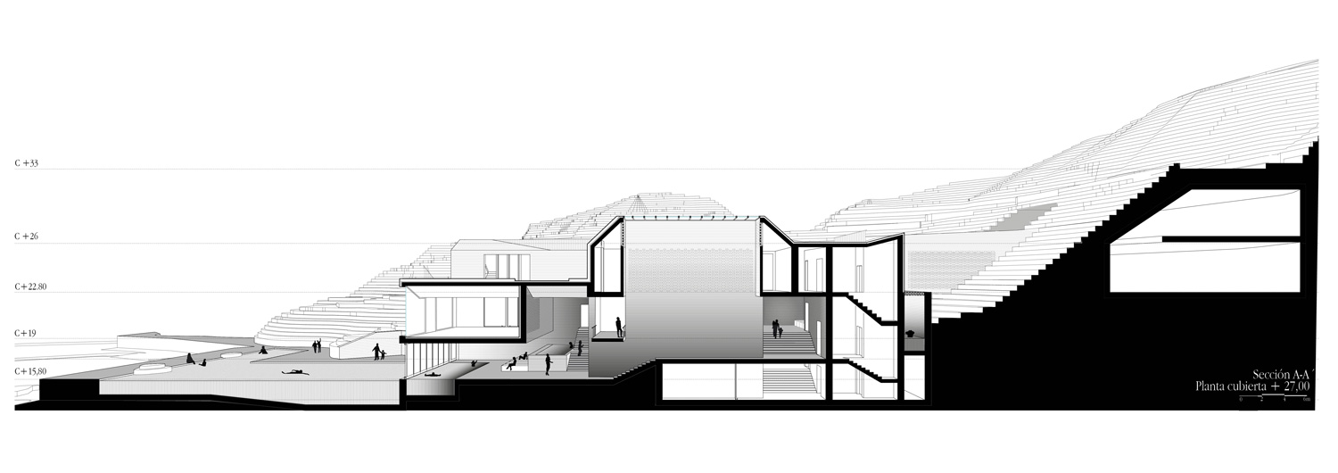 El concepto de edificio como elemento conectivo es otra de las premisas integradas en la propuesta. La integración del edificio en la topografía existente, desdibuja los elementos arquetípicos reconocibles como la fachada o la cubierta, y crean un paisaje nuevo que además de dialogar con el entorno permite conectar partes del terreno y del programa, creando nuevos espacios de apropiación para los usuarios y optimizando el funcionamiento tanto del edificio como de las infraestructuras exteriores propuestas.