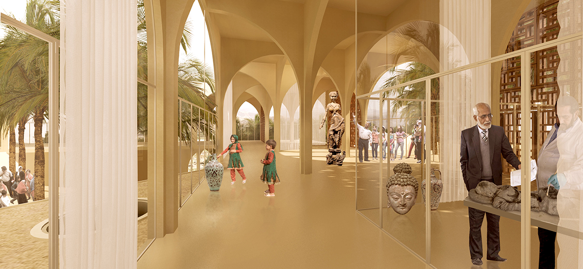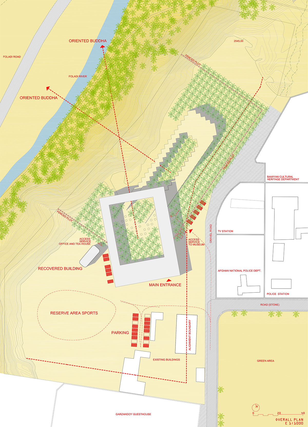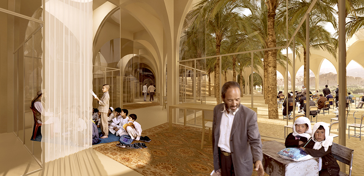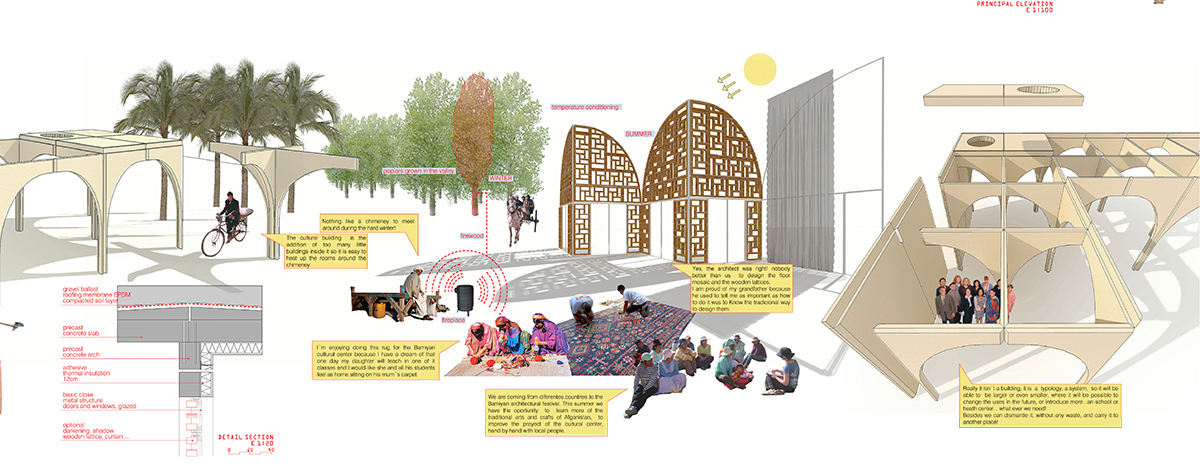 A palm tree that grows in the middle of the desert does not make an oasis; it needs a relationship with many more things to contribute to the environmental changes, to make a part of the desert a livable place. The oasis symbolizes the idea of salvation of those who wander lost in the desert, from the mythical Garden of Eden where man felt at one with nature. Bamiyan Cultural Centre is conceptualized as a small oasis in this desert, which like Afghanistan, has become devastated by strife. Symbolized by the construction of a garden, a place that fosters the coexistence of many beautiful Afghan palm trees, capable of overcoming the tough winter, resilient individualities; ethnics, cultural, of diverse traditions, in search of a communion of identities of which arise the renewed Afghan idiosyncrasy.