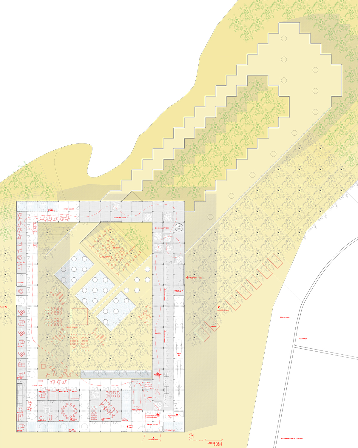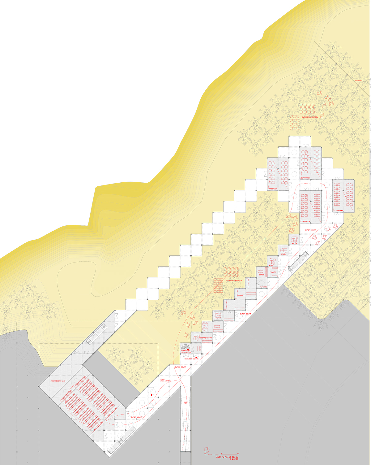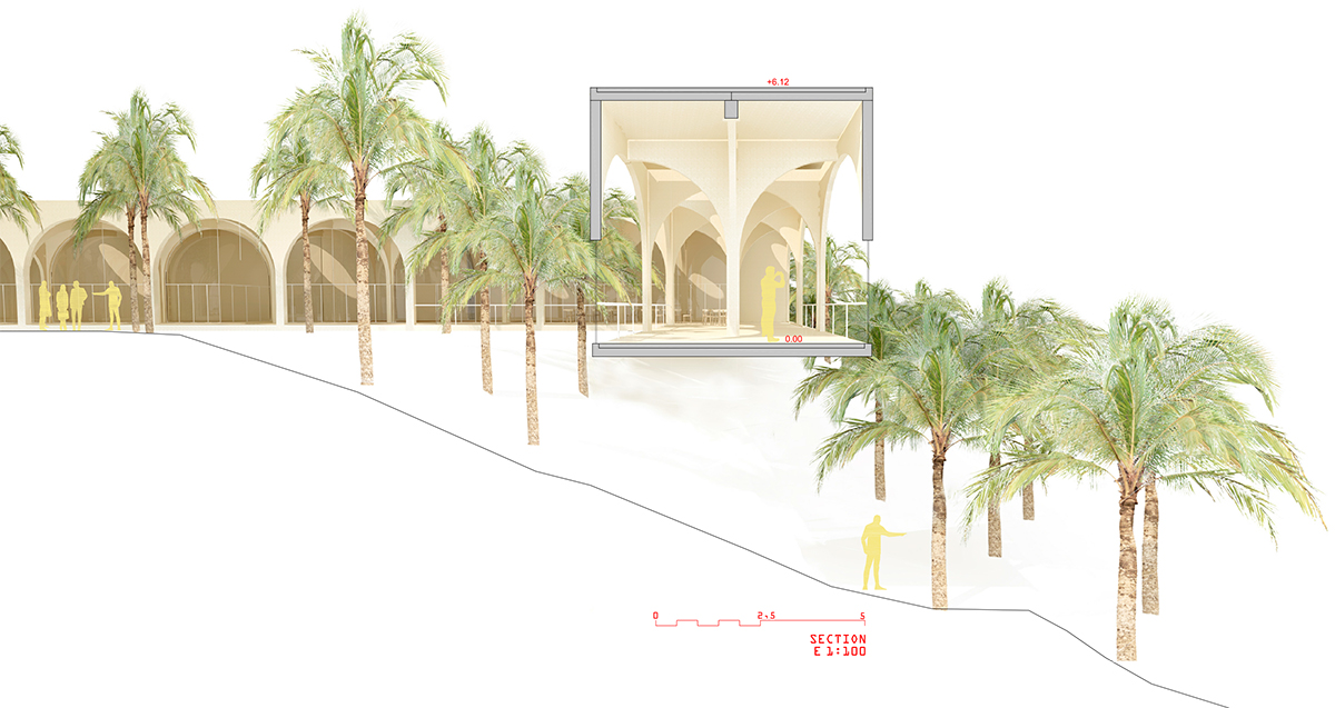 This kind of enclosures, configured as large porticoed buildings, are occupied by multipurpose rooms both in shape as dimensions, which encourages the multiuse of the cultural center. A system that optimizes the conditioning of the building in order to manage independently each room, without giving up on an interior and exterior grading which reinforces the idea of garden. The Project submitted to the competition outlines this system of spatial organization rather than a final result, which could be adjusted if the programme of uses or requirements change. Its materialization is equally versatile, and can be solved with glass walls, concrete or wood latticework, implemented with textile items such as curtains and carpets produced locally.