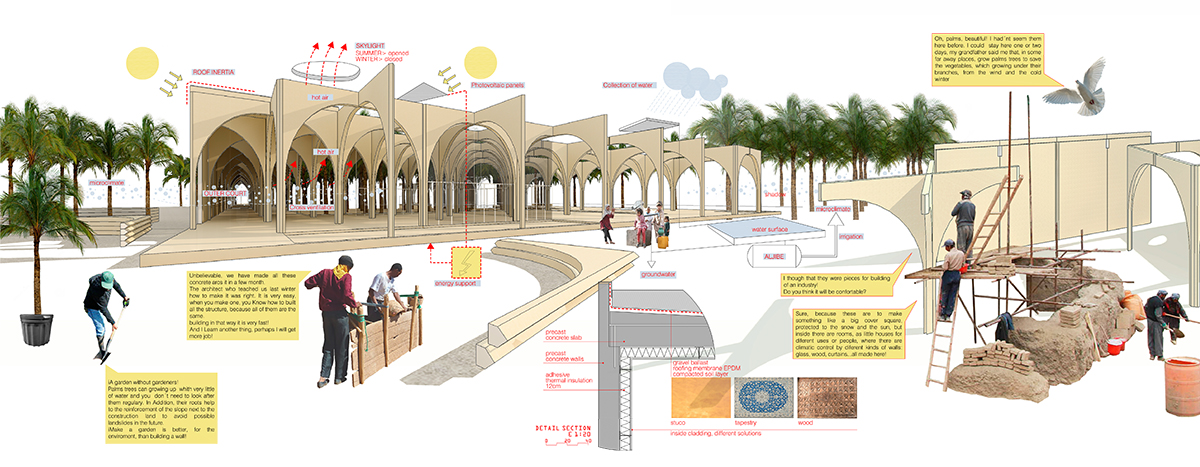 The geometry on which the garden is structured is configured from the crop pattern of the Afghan palm tree extended into a planting mesh. This vegetable lattice empowers a microclimate that enhances environmental conditions around the garden. Pools, placed both inside and outside the enclosures, act like a deposit collecting the water from the scarce rainfall, and promoting this microclimate. The presence of water also supports the symbolic recreation of the garden and fosters the formal attributes of architecture through the use of reflection as used mainly in the Islamic tradition.