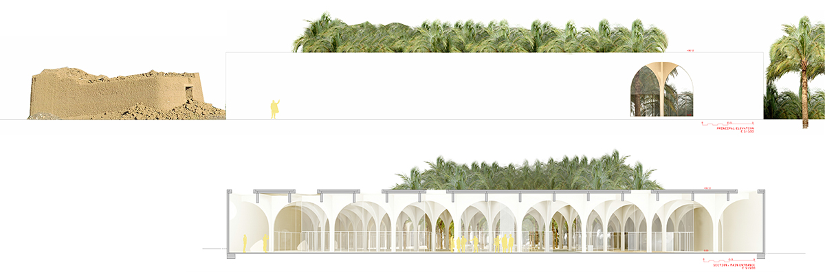 The upper closed volume, linked to the tradition of walled enclosures, ensuring the palm grove indoors, protected, more suitable for the urban landscape, from where the main access is made. The other one is fitted into the lower level distancing it from the urban landscape, and bringing it closer to the landscape, so the garden jumps outwards, dematerializing the perimeter of the building that is opened, thereby becoming more extroverted. This double status, open and closed, is also due to different functional qualifications of the programme uses. A duality that is diluted by folding both enclosures until they get connected, updating this traditional typology of strong horizontal hierarchy into a new relationship.