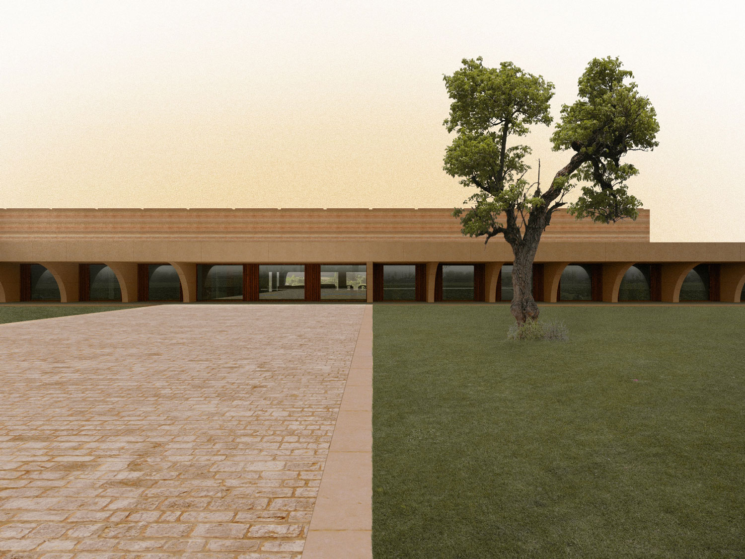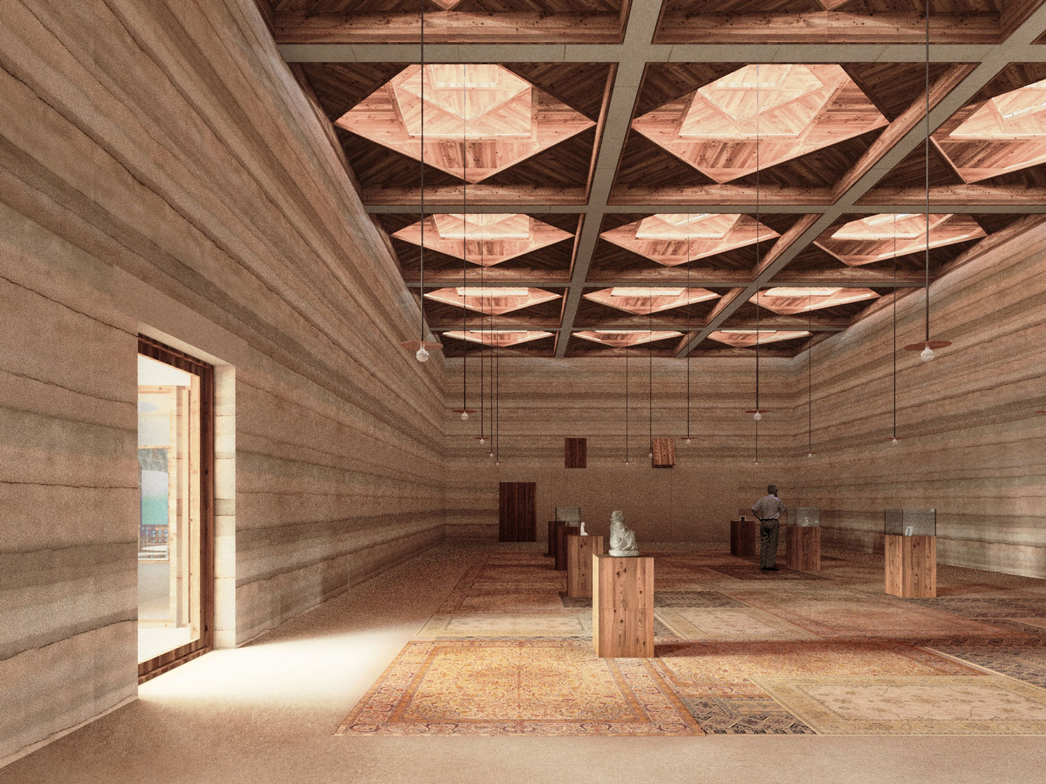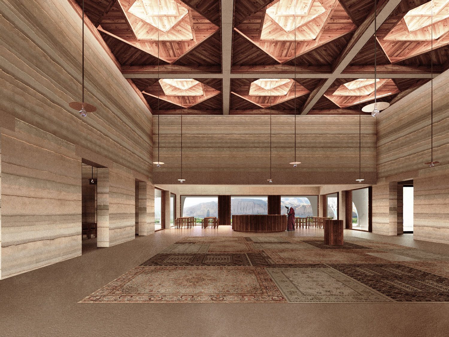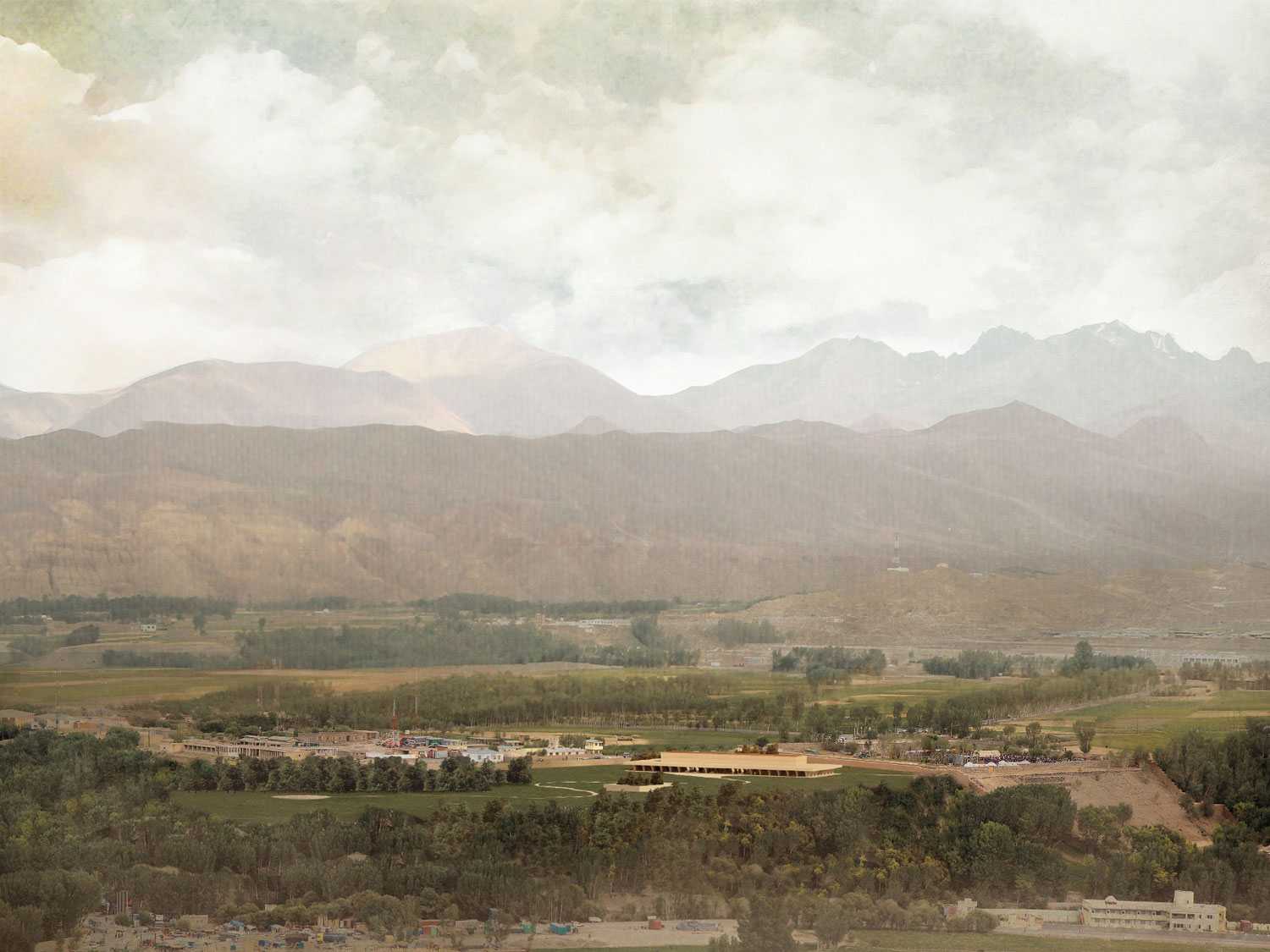 Our proposal for the Bamiyan Cultural Centre, starts from a simple gesture over the sensitive landscape of the Bamiyan valley. A rectangular and low structure (3.5 meters high) which is open on its four sides to the landscape, surrounds a second rectangular structure with a more vertical character. This scheme enables the building program to be vertically and horizontally hierarchized and at the same time, allows the building to reduce its apparent scale without compromising the spatial proportions of the structure’s public program. Despite the subtle interaction with the landscape, the building does not hide in the middle of it, instead, it does a gentle integration. And this integration it’s catalyzed by the materiality of the building. The exposed concrete of the continuous porch that surrounds the cultural center, is harmonized with the landscape through the use of local sand and aggregates on its fabrication and the tonality of the central volume is given by the rammed earth walls, also made by local materials.