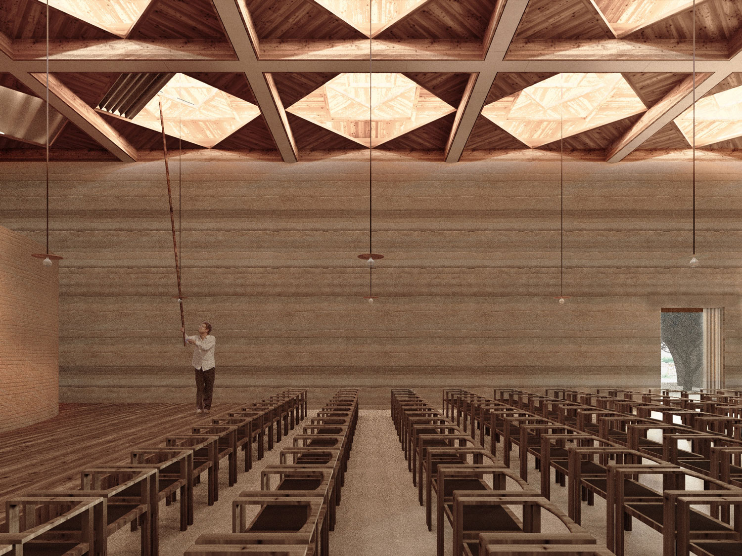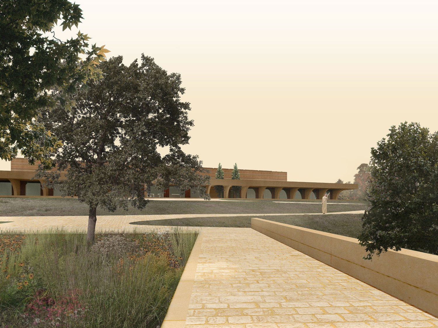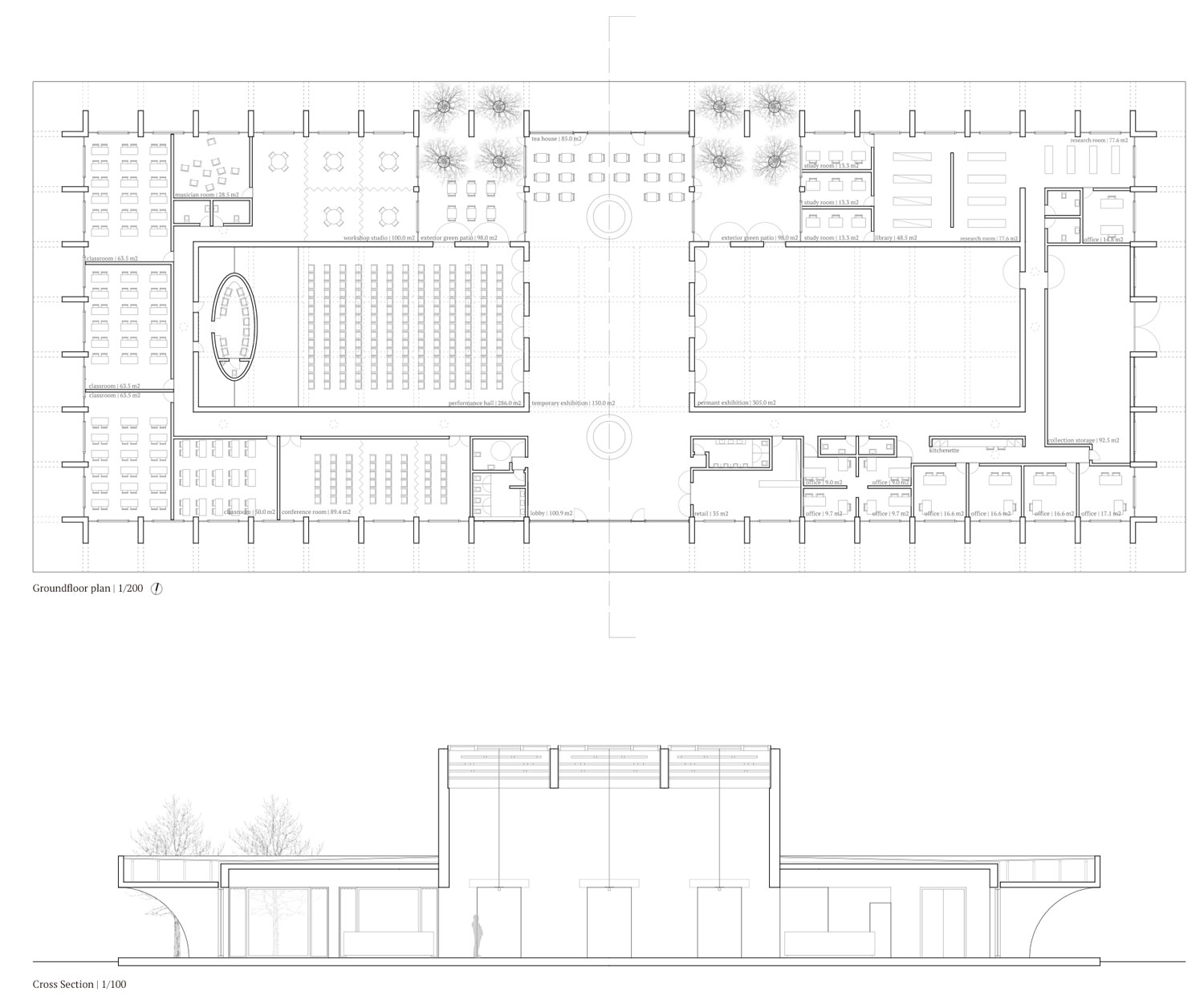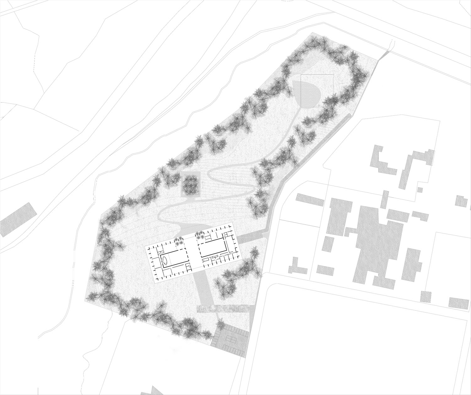 Our proposal for the Bamiyan Cultural Centre, starts from a simple gesture over the sensitive landscape of the Bamiyan valley. A rectangular and low structure (3.5 meters high) which is open on its four sides to the landscape, surrounds a second rectangular structure with a more vertical character. This scheme enables the building program to be vertically and horizontally hierarchized and at the same time, allows the building to reduce its apparent scale without compromising the spatial proportions of the structure’s public program. Despite the subtle interaction with the landscape, the building does not hide in the middle of it, instead, it does a gentle integration. And this integration it’s catalyzed by the materiality of the building. The exposed concrete of the continuous porch that surrounds the cultural center, is harmonized with the landscape through the use of local sand and aggregates on its fabrication and the tonality of the central volume is given by the rammed earth walls, also made by local materials.