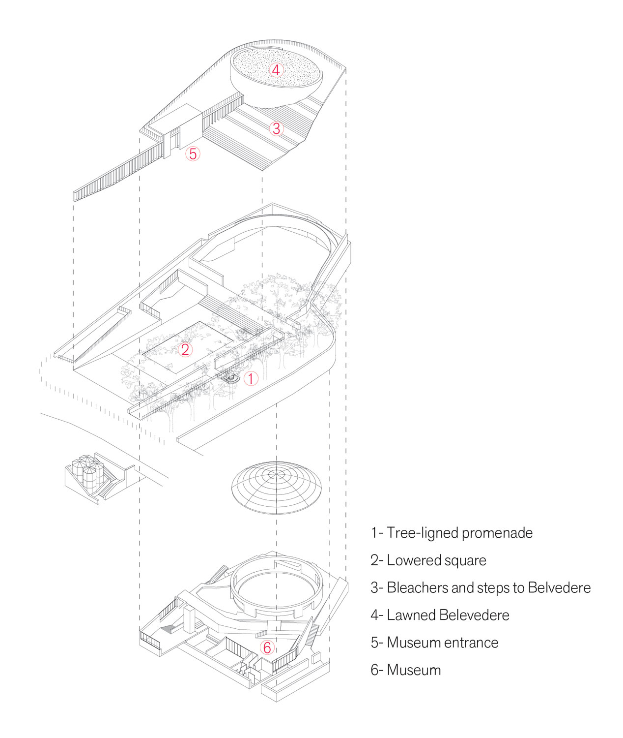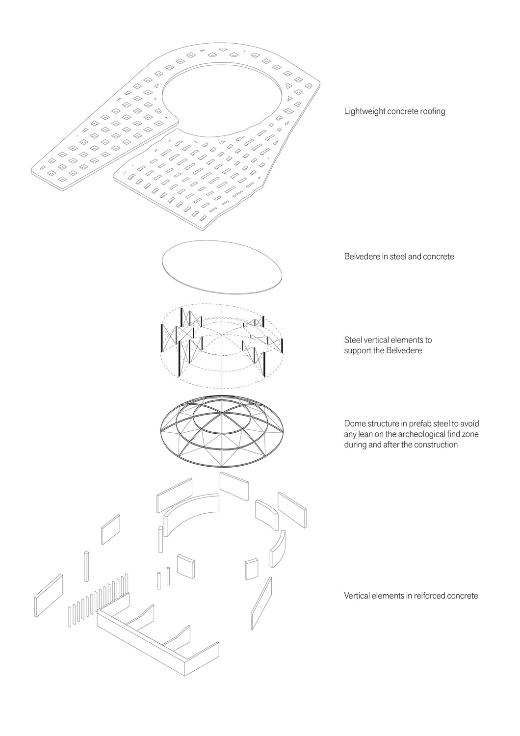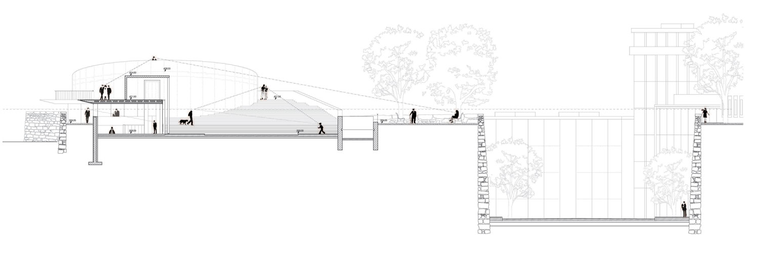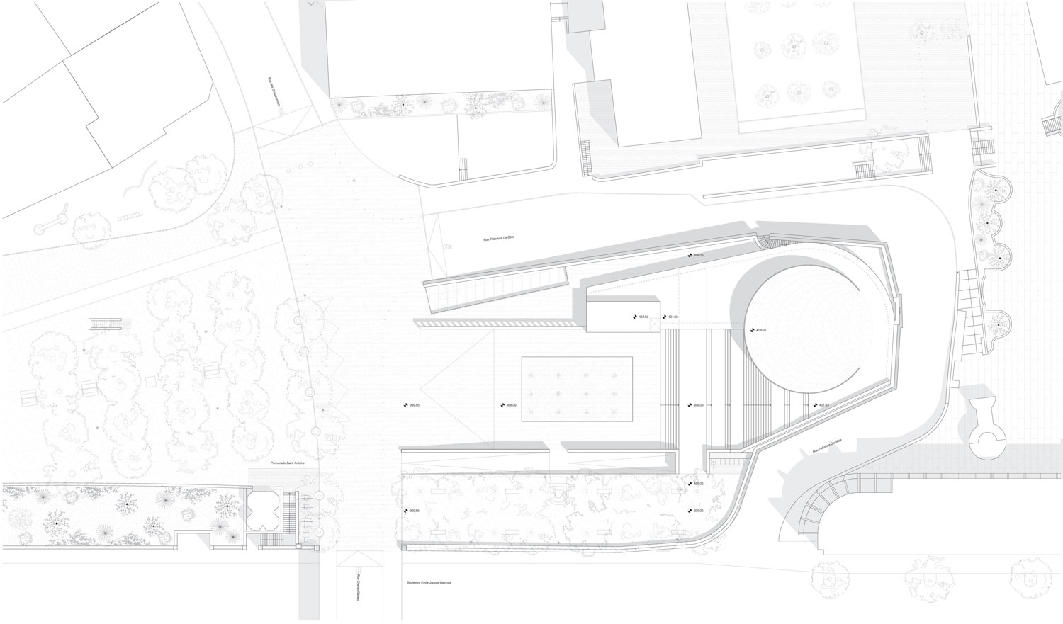The competition requirements were to design a museum for the archaeological evidences found at the Bastion-Saint Antoine and to organize the public space around the museum. The new public space is related with two main public axes: it lays on the first one, which is connecting the XIXth century city to the Old City through the Art&History Museum and the Bourg-de-Four square, and it is crossed by the second one which, from the Plainpalais, through Saint-Antoine Promenade and Lycée Calvin, leads to Rive and the lake. The public space is organized to face different users and uses. A tree-lined promenade underlining the strip along Emile-Jaques-Dalcroze boulevard and dialoguing with Saint-Antoine Promenade and the Observatoire park; a lowered polyfunctional square, getting closer to the archaeological evidences and being a natural stage for the steps leading to the lowned Belvedere, where it is possible to pic-nic with a view towards the lake; the entrance to the underground Museum, closing the square borders, and the urban lantern, which denounce the lying of the evidences. Public paths are connecting all these different levels with the city, creating a complex space of relations and hierarchies. Also the interior of the museum is conceived as a public path, connecting the levels and the parts of the city through a fluid and differentiated experience.
