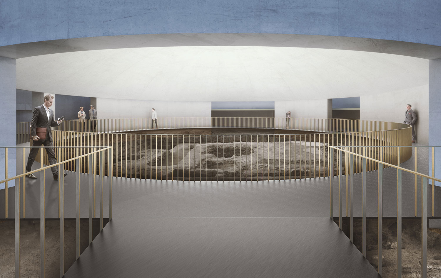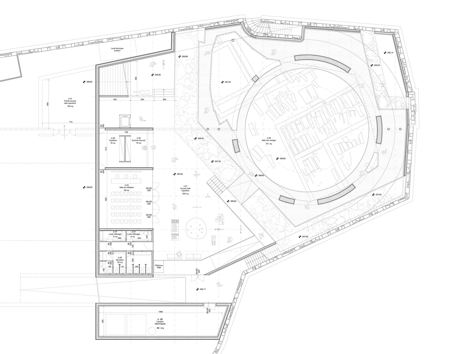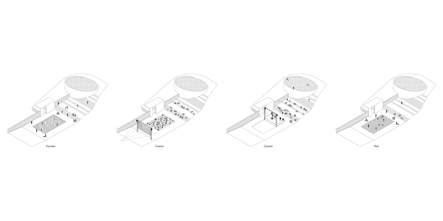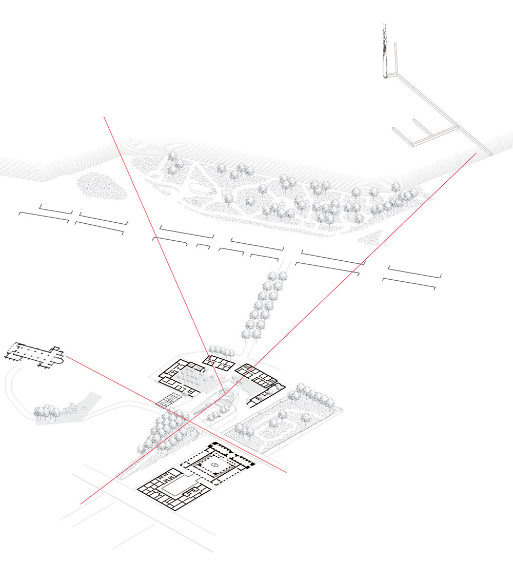 The competition requirements were to design a museum for the archaeological evidences found at the Bastion-Saint Antoine and to organize the public space around the museum. The new public space is related with two main public axes: it lays on the first one, which is connecting the XIXth century city to the Old City through the Art&History Museum and the Bourg-de-Four square, and it is crossed by the second one which, from the Plainpalais, through Saint-Antoine Promenade and Lycée Calvin, leads to Rive and the lake. The public space is organized to face different users and uses. A tree-lined promenade underlining the strip along Emile-Jaques-Dalcroze boulevard and dialoguing with Saint-Antoine Promenade and the Observatoire park; a lowered polyfunctional square, getting closer to the archaeological evidences and being a natural stage for the steps leading to the lowned Belvedere, where it is possible to pic-nic with a view towards the lake; the entrance to the underground Museum, closing the square borders, and the urban lantern, which denounce the lying of the evidences. Public paths are connecting all these different levels with the city, creating a complex space of relations and hierarchies. Also the interior of the museum is conceived as a public path, connecting the levels and the parts of the city through a fluid and differentiated experience.