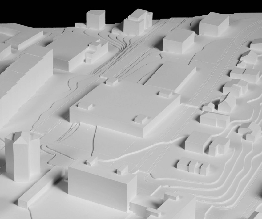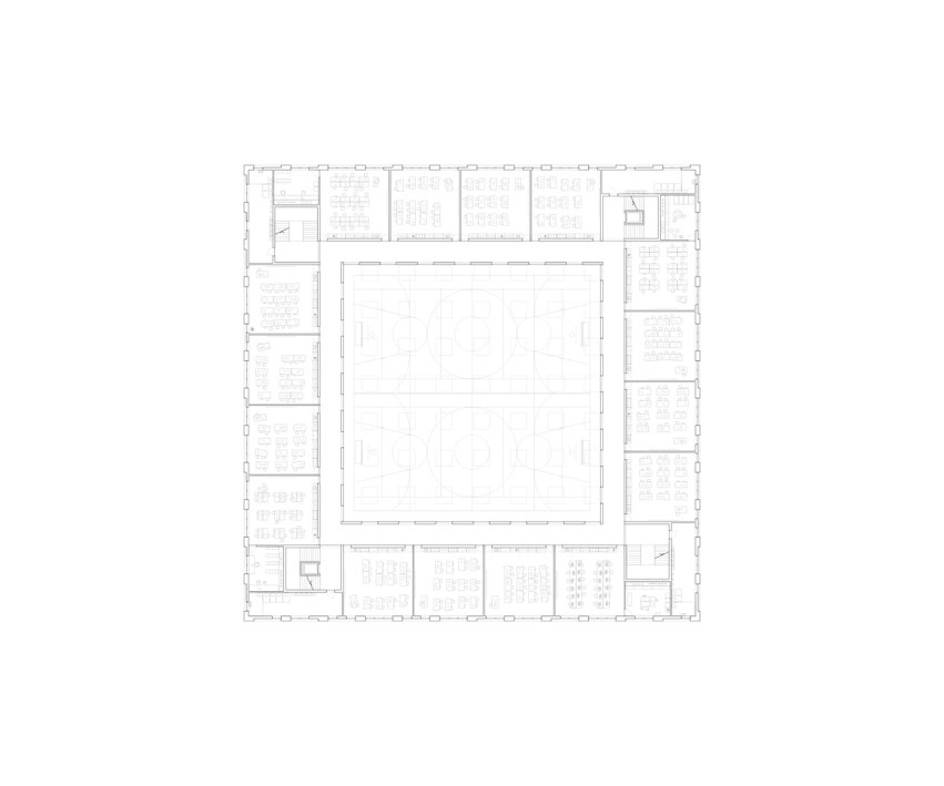 Les environs du site du nouveau complexe scolaire de Romont se caractérisent par une forte hétérogénéité à la fois programmatique et volumétrique. Notre projet consiste en l’instauration d’un microcosme dédié à la scolarité dans ce milieu. Ainsi, le projet est résolument unitaire; sa volumétrie est simple et rationnelle.L’ensemble du programme est assemblé en un volume compact et horizontal, répondant aux prairies voisines et au pavillon scolaire existant. Ainsi, il libère autant d’espace que possible à une végétation accueillante, ainsi qu’aux possibles développements futurs, et ceci sans empiéter sur l’abri de protection civile existant. Son autonomie et son insertion dans la topographie laissent imaginer qu’il ait pu occuper le site bien avant les bâtiments voisins. L’expression architecturale est sobre et claire. Les trois étages de programme sont couronnés du préau de l’école, de manière à lui offrir des vues privilégiées tout en annonçant au passant la vocation singulière du bâtiment.Il s’agit d’imaginer un édifice généreux et clair pour ses jeunes occupants, et leur dédier ainsi un espace dans le paysage. L’organisation du bâtiment est d’une simplicité enfantine. Les escaliers, ascenseurs et salles d’eau occupent les angles du volume, alors que le reste des circulations est assuré par de généreux corridors donnant sur la salle de gymnastique centrale, et desservant l’ensemble du programme.