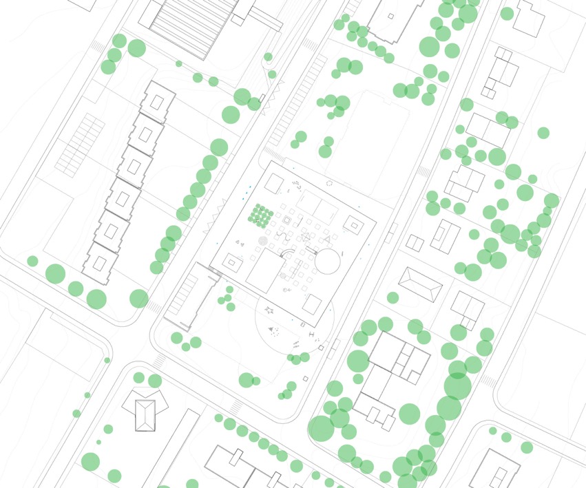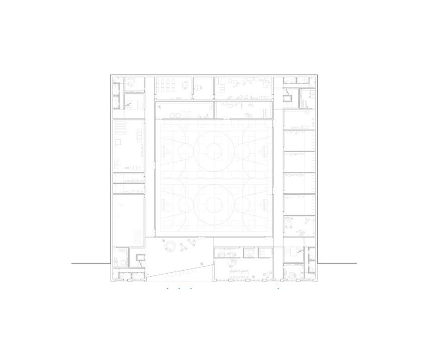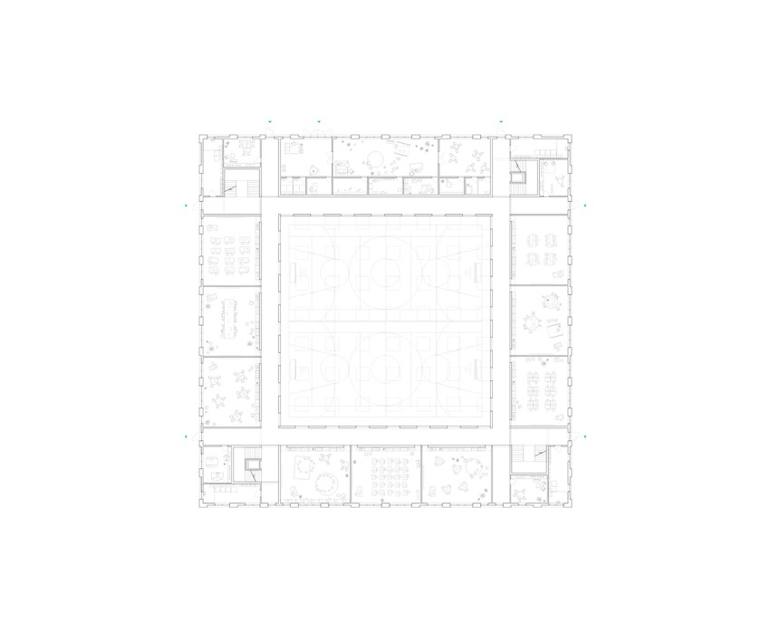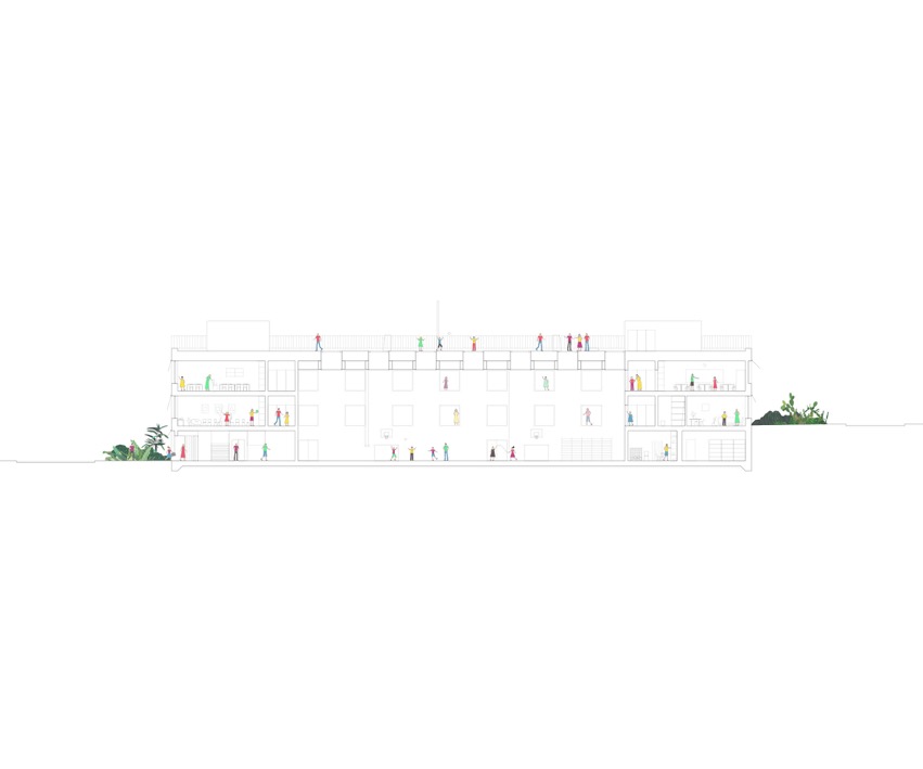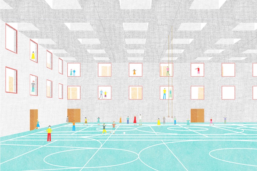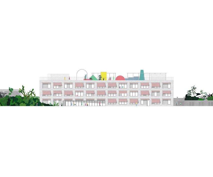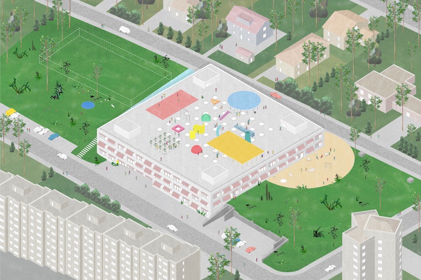 Ainsi, l’ensemble de l’édifice est organisé de manière circulaire autour de l’espace triple hauteur nécessaire à la salle de sport double. Celle-ci est éclairée de manière zénithale et fonctionne donc comme un puits de lumière monumental pour les espaces attenants. Le niveau le plus bas, ouvert sur la rue Pierre de Savoie, comporte le hall d’entrée principal, les espaces dédiés aux professeurs de l’école, ainsi que l’ensemble du programme sportif. Les deux étages supérieurs sont occupés par l’école, et accèdent donc facilement aux espaces verts du site. Les salles de classes sont disposées en rangées le long des façades, avec la possibilité d’envisager des accès entre elles.L’espace d’accueil extrascolaire est au deuxième niveau et bénéficie donc d’un accès indépendant depuis la rue Aliénor, ainsi que d’un espace extérieur propre au Sud.La toiture plate est entièrement occupée par le préau de l’école. Spacieuse et variée, elle est agrémentée d’une constellation d’éléments de jeu et de plantes en pot de différentes dimensions. Ainsi, le préau devient un petit univers comme suspendu dans les airs. Idéal pour le jeu des enfants et laissant deviner la destination du bâtiment aux alentours.
