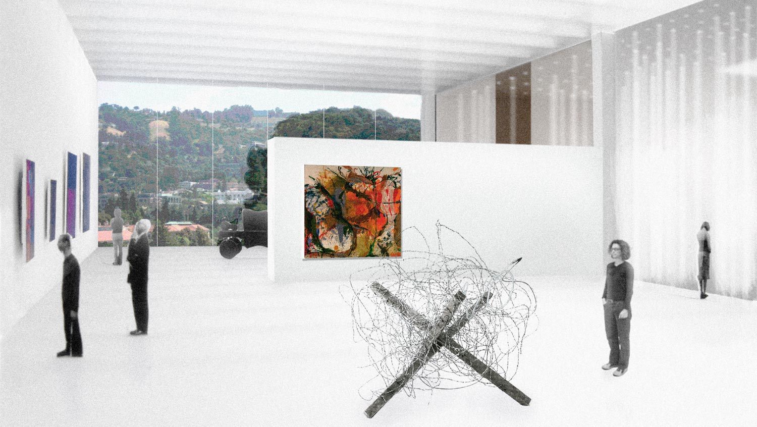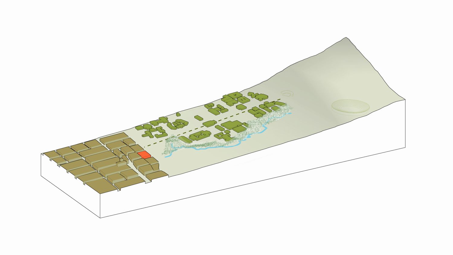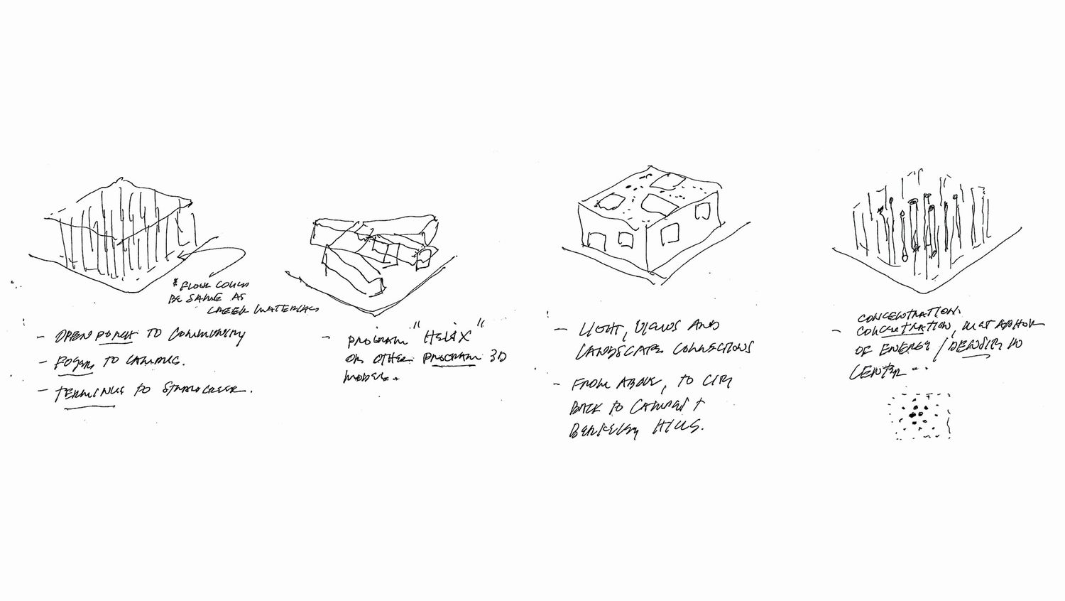 The building proposal is a compound structure defined by differing qualities of light and ways of engaging the collection. The design envisions two interlocking spatial systems – one for art and one for film. In the first system, a continuous and ascending gallery sequence engages the street and brings visitors into contact with the collection, the campus, city and the Berkeley Hills beyond. Advanced daylighting and reconfigurable spaces provide a range of environments for the presentation of the diverse collection of the museum. In the second system, massive walls spiral into the earth and hold a chain of discrete volumes for lectures, performance, archival storage, film screenings and multi-media installations.