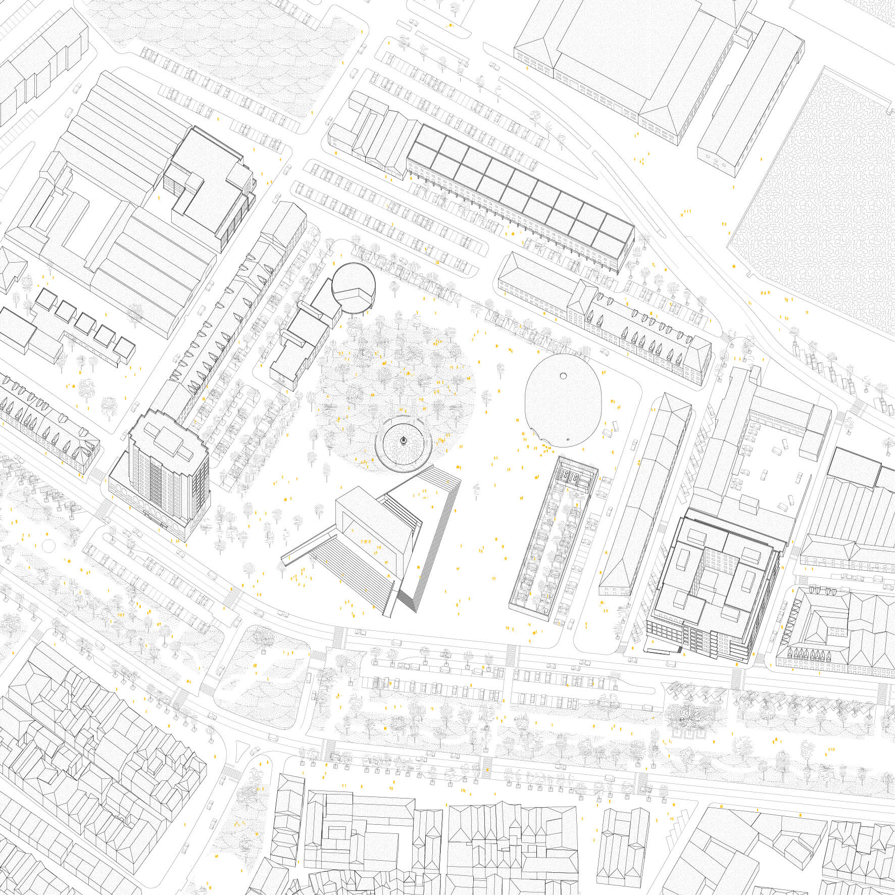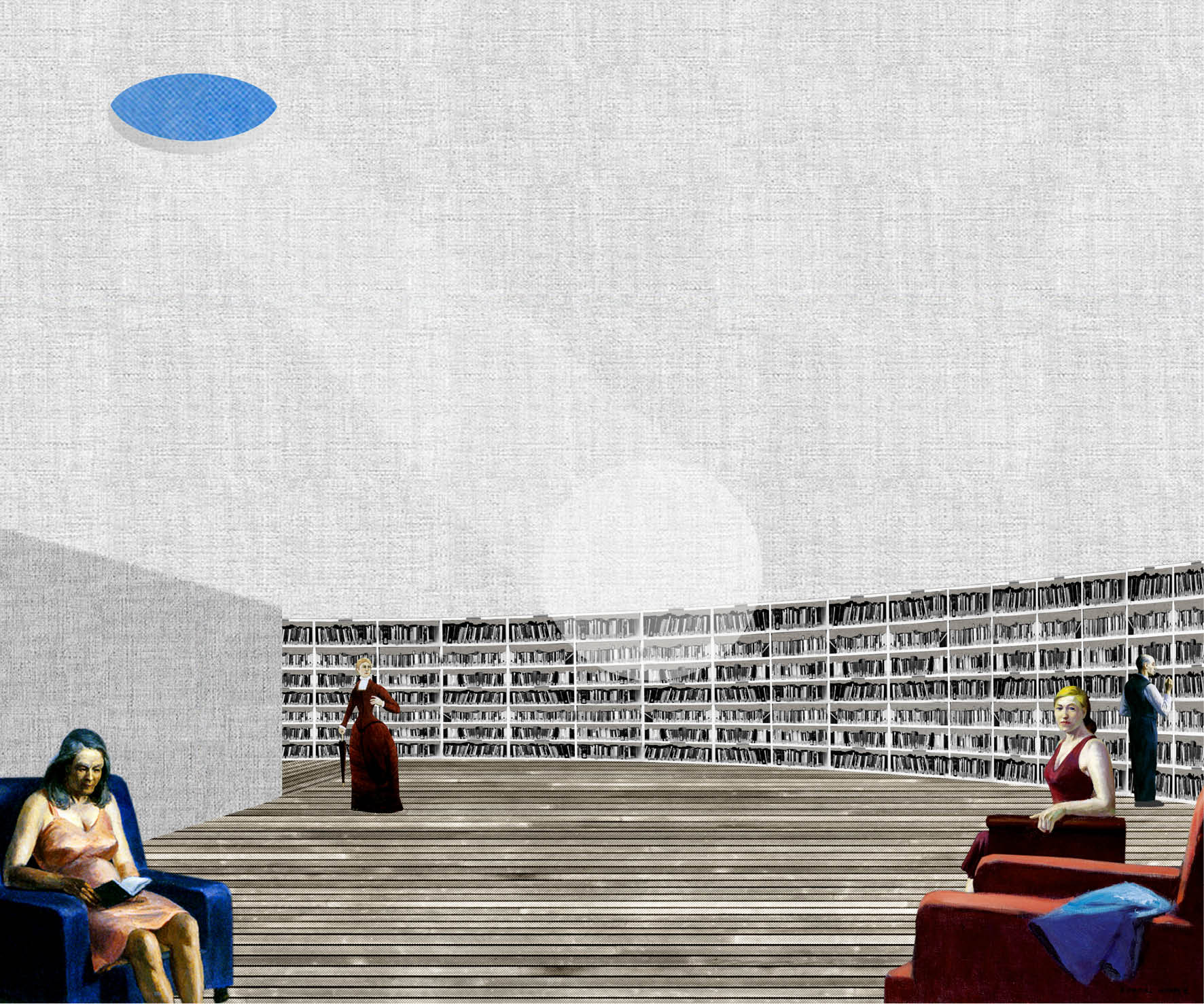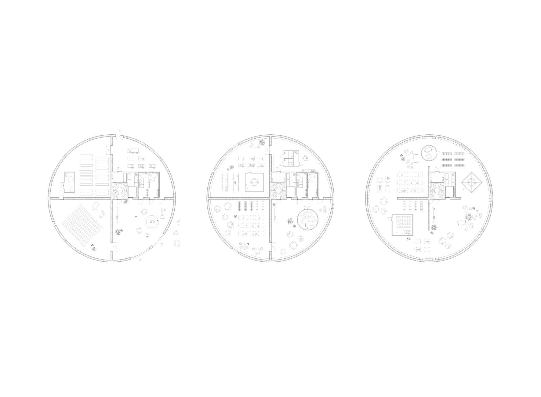 The given site for the new municipal library appears to be lost: the garden is not a garden anymore and the square seems to be just an empty space, without scale or program, almost abandoned. The proposal sought to answer to the library’s program but also to the city. While placing the building as a loose object, division and hierarchy were created. The car parking was limited by a white wall and the garden got a grassy area around the old fountain. The library would be almost autistic and live from its geometry. With a circular plan, each floor would be divided into four equal parts with the accesses located in the center. All spaces would be artificially led, with occasional round windows for exterior views. The structure would allow that no pillars would be needed in the middle of the rooms, assuring them versatility. At the top, the reading room space would be exceptional, as a large pantheon. This open space would be under a big dome reflecting on the outside the grand interior space. Light and geometry define the building.
