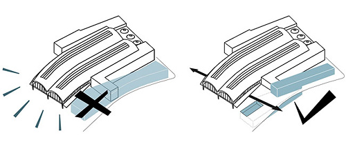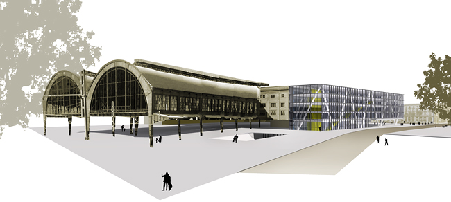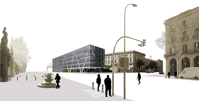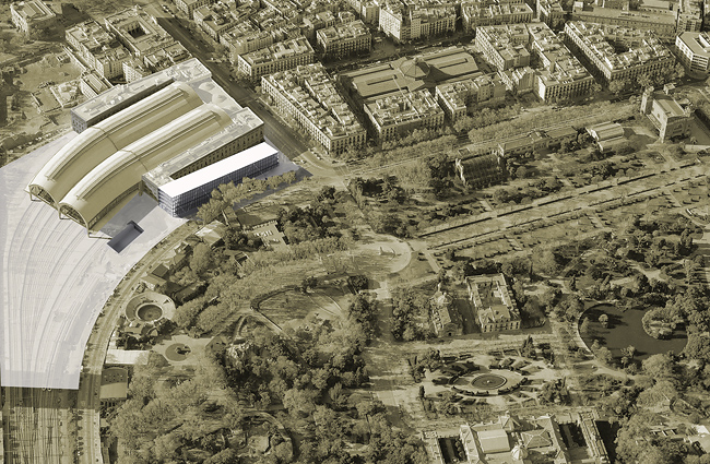 Se busca articular el encuentro entre unos frentes urbanos muy definidos, el verde del parque y la potente presencia de las marquesinas de la estación, dejando que cada uno de estos elementos mantenga su carácter. El edificio se divide en dos largos prismas. El primero dialoga con los frentes urbanos cercanos y muestra el testero a la avenida Marqués de la Argentera. El segundo desaparece, enterrado, frente a las marquesinas de la estación, de modo que no compita con ellas y permitiendo una continuidad visual desde el parque. El prisma visible de la biblioteca continua la volumetria de la estación convirtiendo la U en una S, la cual rodeará dos ámbitos de espacio público: los actuales andenes, bajo las marquesinas, que se convertirán en una continuación cubierta del parque de la Ciutadella, y una plaza larga que dará acceso a la propia biblioteca. Las fachadas del cuerpo visible asumirán el carácter homogéneo de las fachadas cercanas, para respetar el carácter de frente urbano de éstas. Se busca la mímesis en dos conceptos: altura y ritmos compositivos.