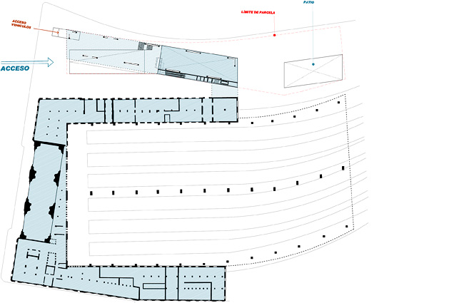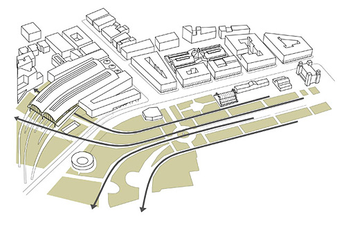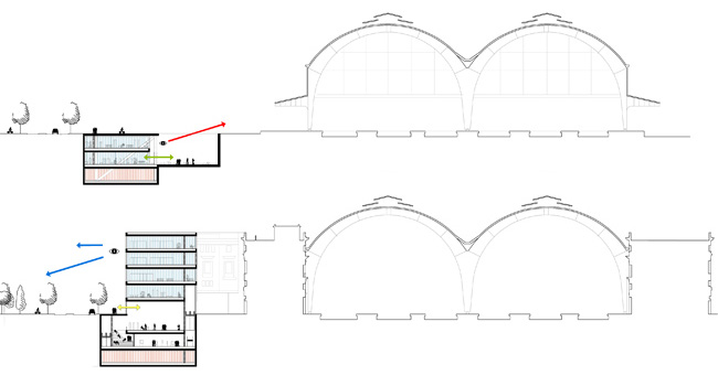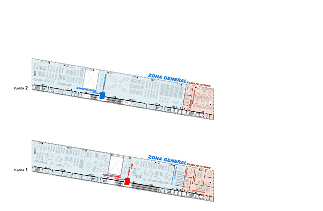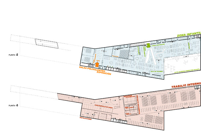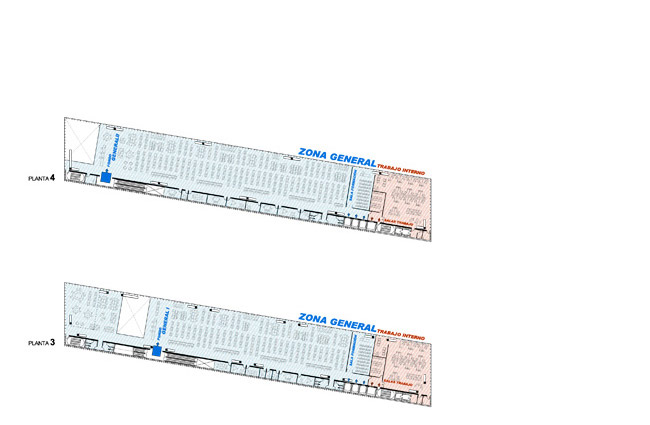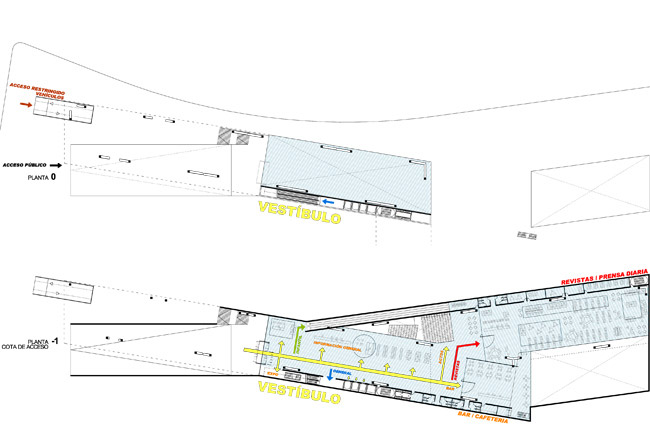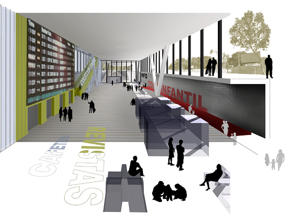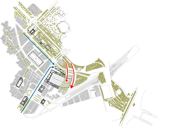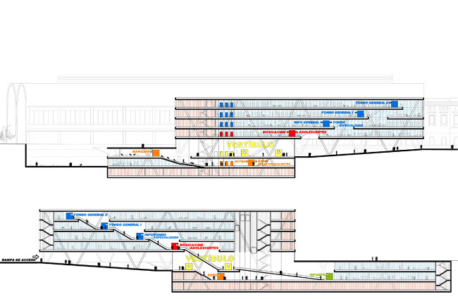 El nuevo equipamiento desempeñará la función de biblioteca central de toda el área metropolitana de Barcelona y por tanto sus requerimientos son superlativos, tanto en relación a la complejidad del programa como a las dimensiones de los espacios e incluso a la necesidad de representatividad, de visibilidad urbana. La propuesta reconoce la gran escala de la biblioteca proponiendo un acceso y unas circulaciones internas representativos. El ámbito es muy alargado y relativamente estrecho y obliga a pensar en una disposición longitudinal del programa. La propuesta organiza las circulaciones verticales internas de manera lineal como una franja lateral. La gran cantidad de usuarios diarios potenciales de la biblioteca y la complejidad del programa hacen de la zona de acogida y promoción un espacio central que articula todos los flujos internos de la biblioteca. Este espacio conforma una transición hacia el exterior en pendiente que dota al edificio de representatividad y al ingreso en él de ritualidad.