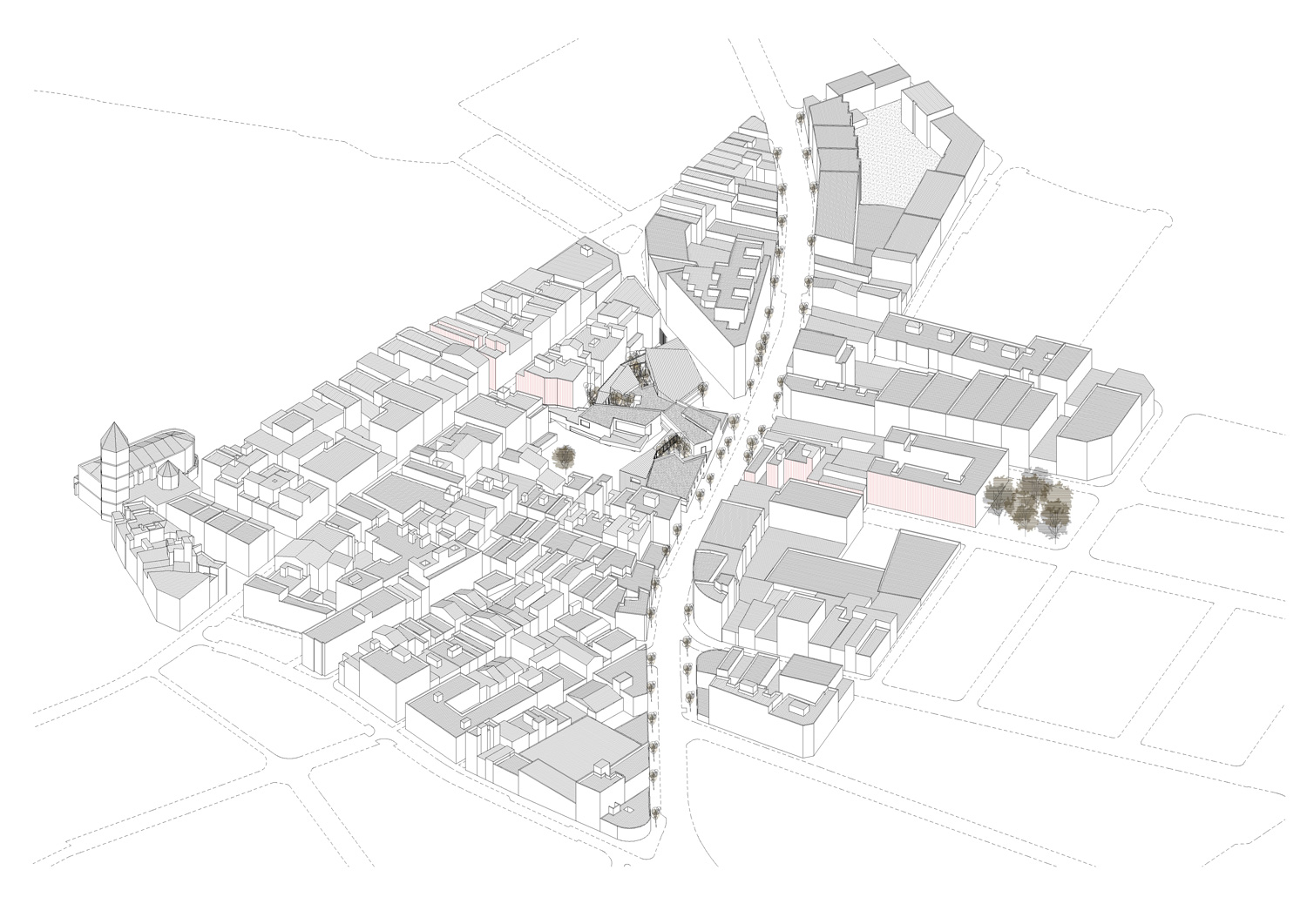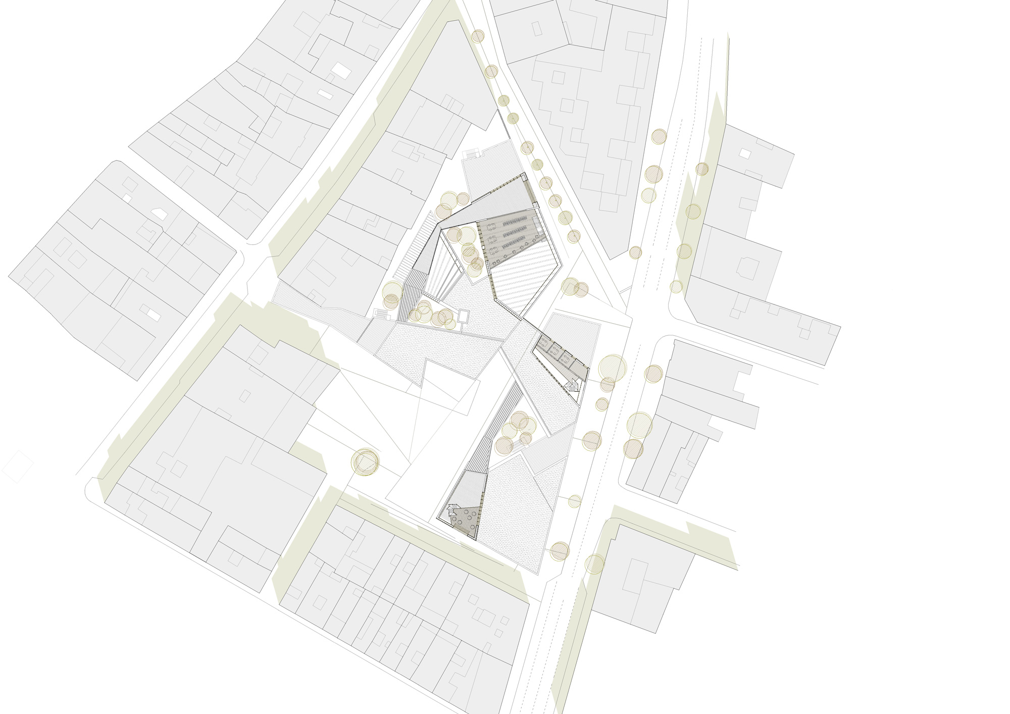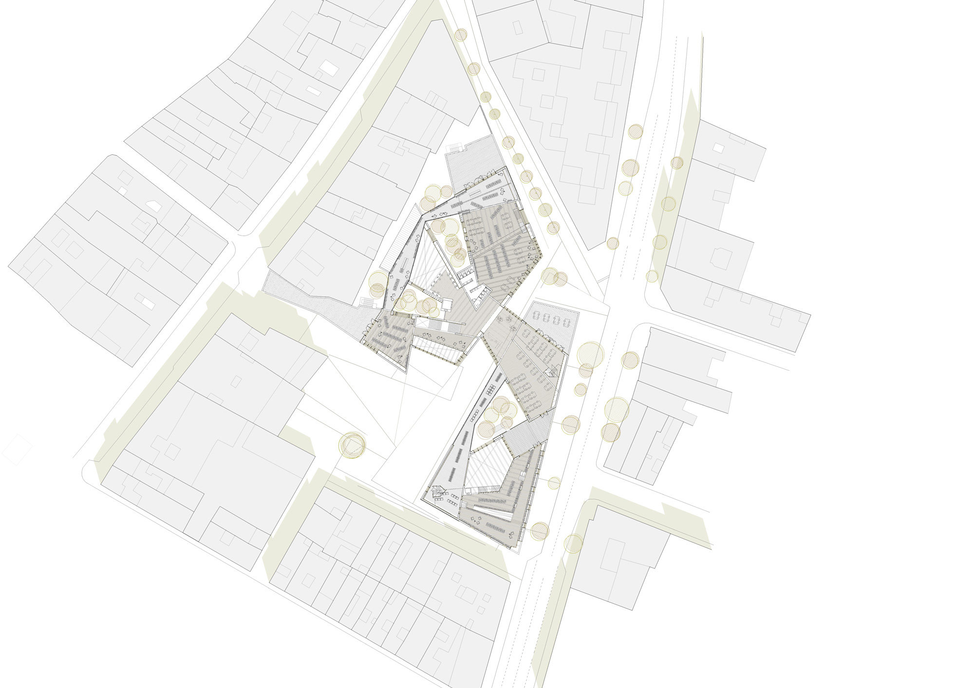El solar está en el límite del núcleo antiguo; y su entorno conserva en parte las características de implantación de éste: una trama compacta, con calles estrechas y delimitadas por una estricta alineación de fachadas en el límite de las parcelas y variaciones en altura; situación determinante en la definición del perfil del proyecto. Espacio cultural y de encuentro. ‘La concepción tradicional de la biblioteca como espacio exclusivo para los estudiantes o como almacén de libros de todo tipo ha dado paso a la nueva biblioteca pública. La biblioteca se convierte en el centro de información más importante para los ciudadanos; en una puerta abierta a la información general y local que las tecnologías de la información ponen a nuestro alcance; en un centro de actividad cultural de primer orden; en un espacio de identidad con el territorio que estimula valores de interculturalidad, solidaridad y participación y en un multiespacio abierto a todos los sectores sociales’. *UNESCO
