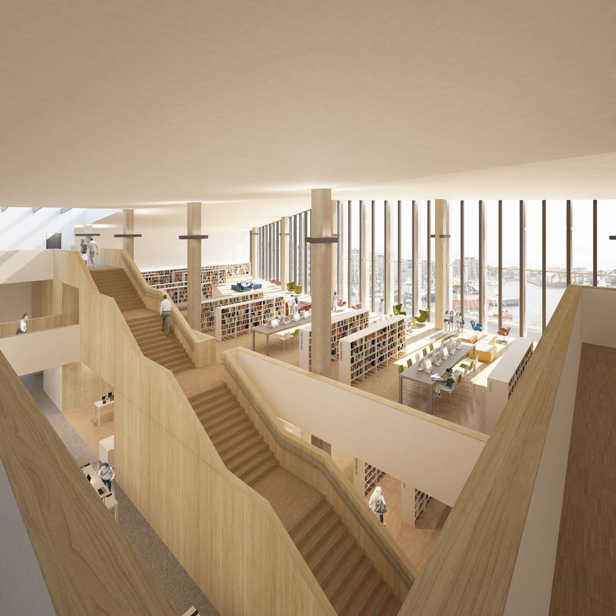 Bodø Library is a winning proposal by DRDH Architects for Bodø Kommune designed in 2008. It is located in Bodø Norway in a seaside setting. Its scale is medium with a surface of 6.300 sqm an estimated budget of 25.000.000 € and a ratio of 3.968 €/sqm. Key materials are wood glass and metal. Forbes Massie collaborated as visualizer. The concept of ribs is explored.