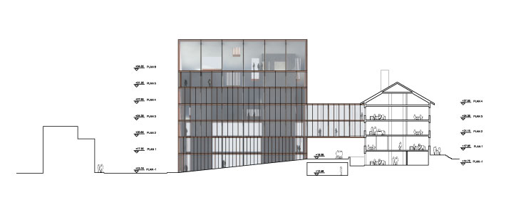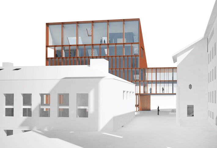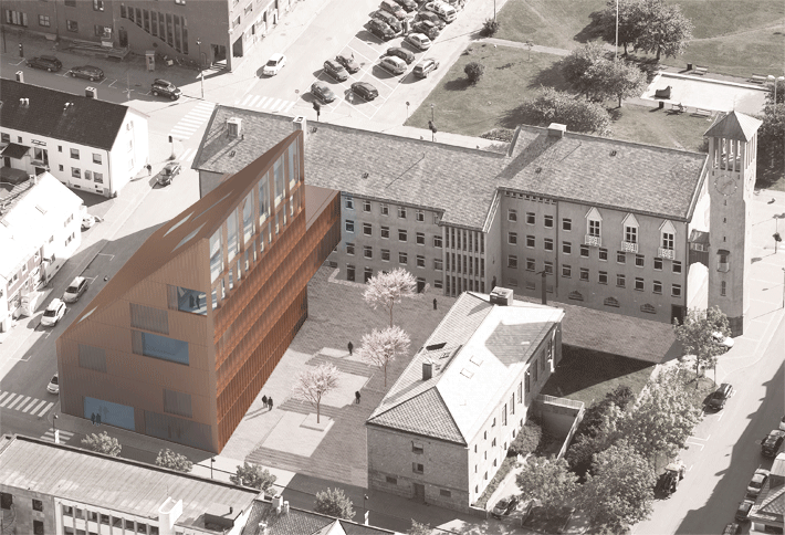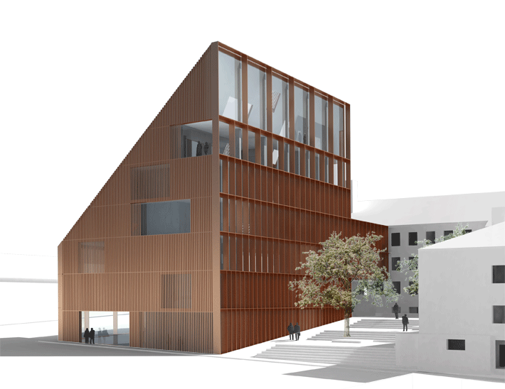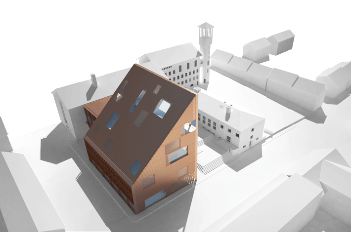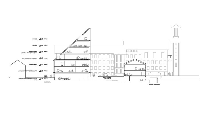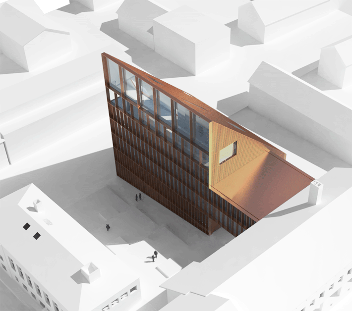 The starting point of the project was to create an open and transparent public building – a building belonging to the citizens of Bodø. The project adds a new building to the existing site by erecting a simple tower with the same footprint as the library building that exists on the site today. The tower has a large roof to the east to adjust the volume to the scale of Havnegate and preserve good lighting condition for the neighboring buildings.
