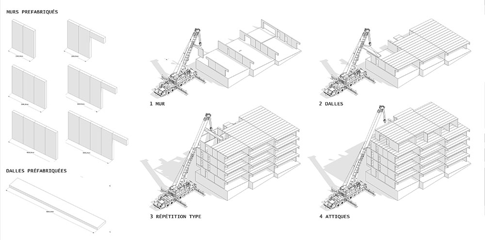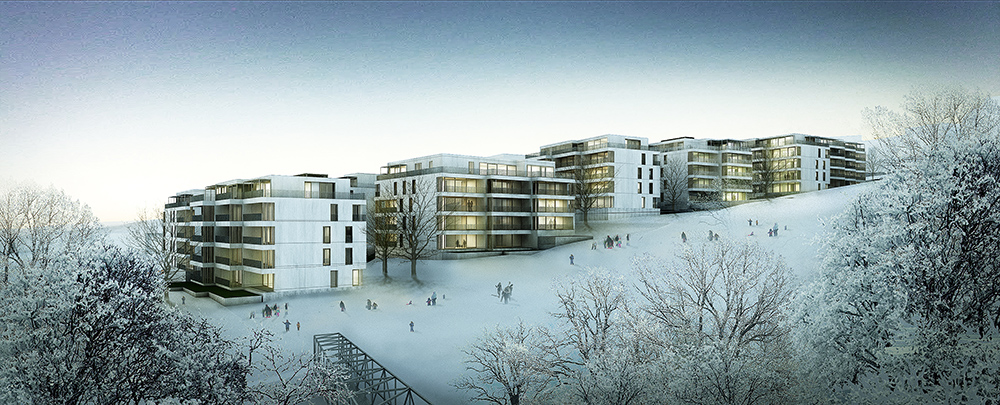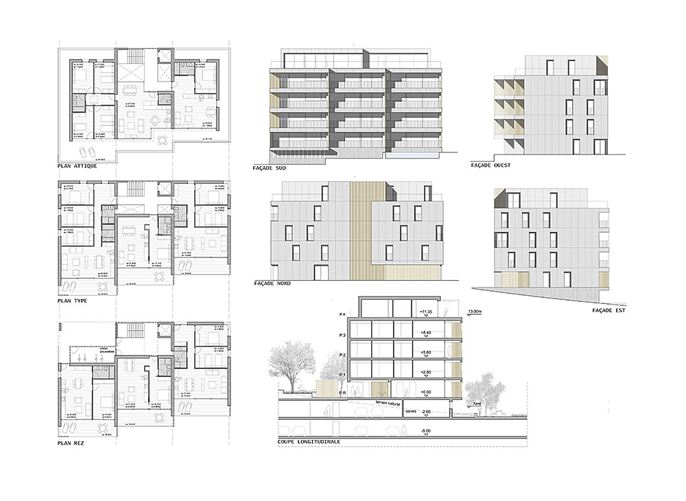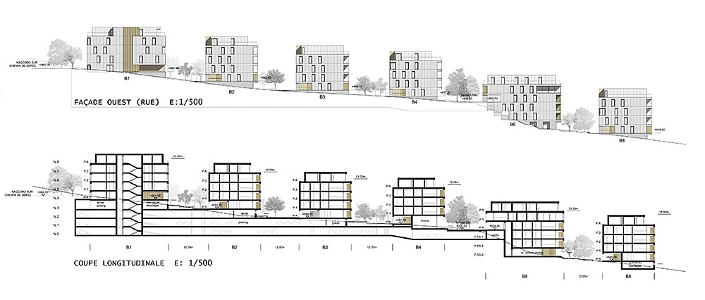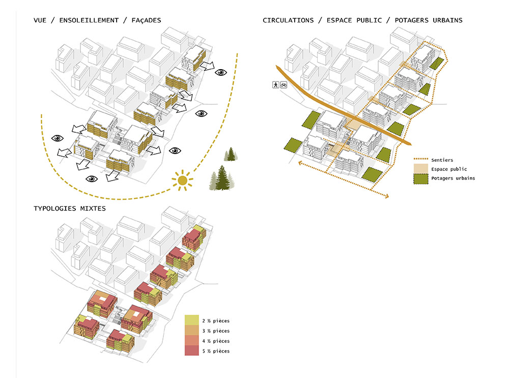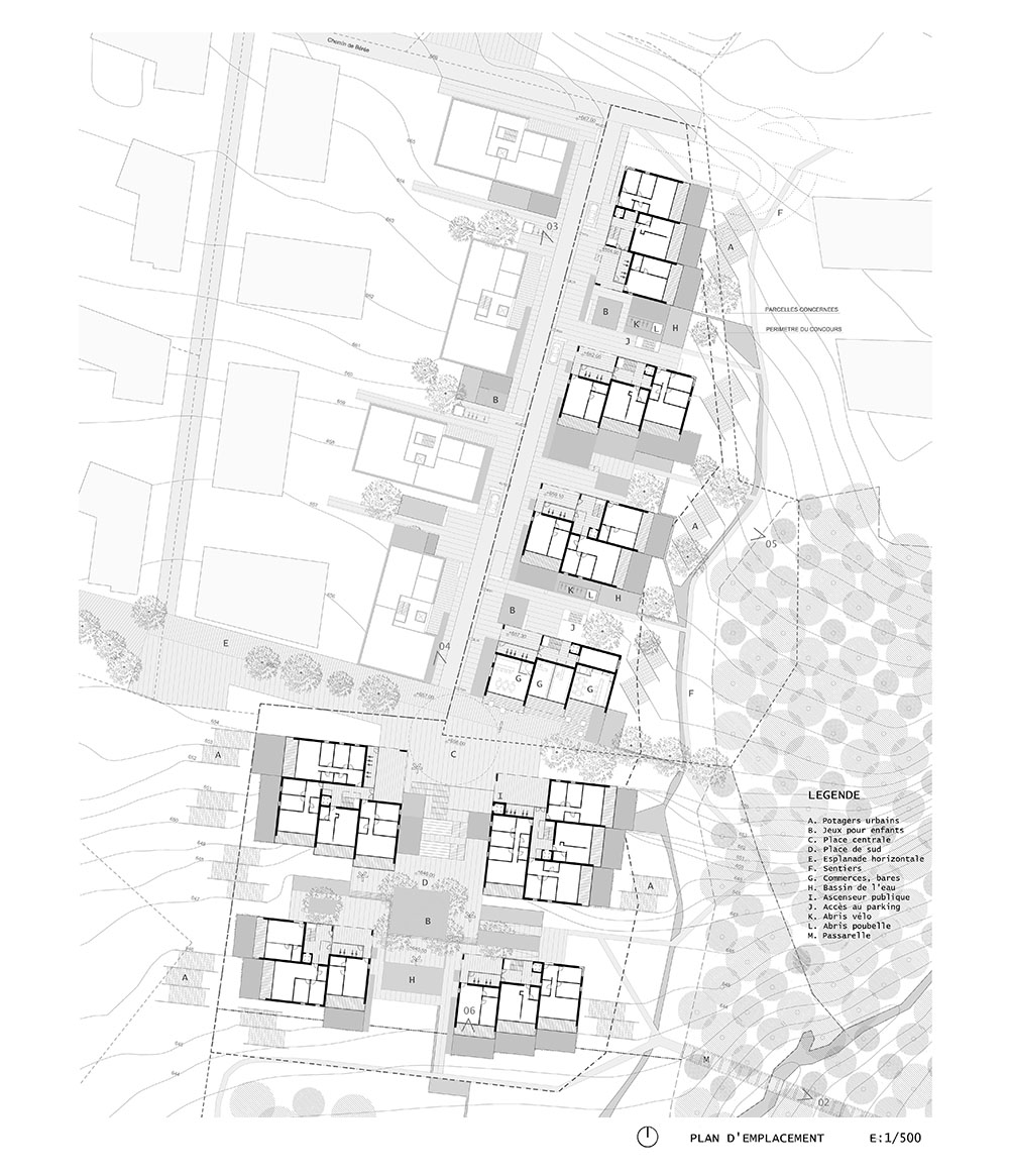 Le projet de logements situés aux Fiches Nord sur les parcelles des terrains 8 et 9 se définit fortement par la topographie du lieu, c’est-à-dire par l’orientation sud dans la pente, les magnifiques vues sur le lac et la forêt avoisinante. Les huit bâtiments sont disposés sur le terrain en formant une façade étalée qui clôture le quartier et qui s’ouvre sur la vue ce qui permet de jouir de partout d’un panorama unique. Les façades extérieures de l’ensemble (est, sud et ouest) définissent l’image caractéristique du projet rythmée par l’alternance entre les vides et les pleins. 117 logements sont proposés avec 4 typologies différentes (2 ½, 3½, 4½ et 5½ pièces) et 3 typologies de blocs (A, B et C). Le système constructif est structuré par l’utilisation de dalles préfabriquées en bois multicouches. Le montage se réalise comme des grandes boîtes en bois assemblées selon les caractéristiques de l’emplacement. Une diversité sociale du quartier est ainsi garantie puisque chaque bâtiment et chaque rez-de-chaussée offre des variations typologiques de logement. Les huit bâtiments sont liés au lieu et au reste du quartier par deux axes principaux : L’axe est-ouest (commercial) et l’axe nord-sud (rue piétonne). L’espace public du quartier sera défini par ces deux éléments structurants comme une plateforme qui relie le milieu urbain et le milieu naturel. Nous proposons un dégradé progressif de l’espace urbain vers la nature au moyen de matériaux de plus en plus souples et perméables. La place centrale (intersection entre les deux axes du quartier) est projetée comme un espace ouvert et polyvalent, un espace d’échange, un espace pour des concerts, fêtes, marchés, évènements culturels. La connexion avec les 4 bâtiments sud (blocs 5, 6, 7 et 8) a lieu au moyen d’un escalier en gradin, en solution à la dénivellation forte du terrain. Un ascenseur public est aménagé dans le bloc 5, il garantit l’accès des handicapés aux deux blocs inférieurs et au parking. Les espaces principaux de repos et de cohabitation sont proposés entre tous les bâtiments et directement reliés avec la sortie vers l’espace potagers urbains, prairie et forêt. Ce sont des zones avec une surface plus souple pour des jardins d’enfants, des bassins d’eau et un accès au parking souterrain.