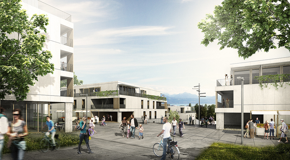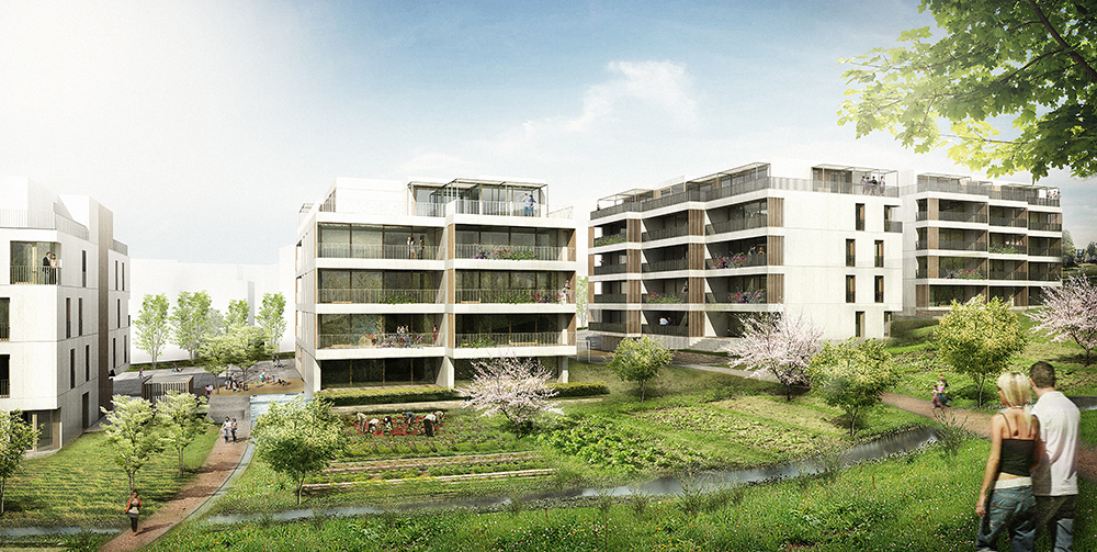 Eau: Il est prévu un réseau de récolte des eaux pluviales des toits pour les huit blocs. L’eau de la pluie sera stockée dans des bassins situés dans les espaces publics de loisir. Ils garantiront la fourniture d’eau d’arrosage pour les jardins potagers urbains avoisinants. L’excédent d’eau sera dirigé à travers un système de bisses et vers les écoulements des eaux pluviales connectées au ruisseau de Vennes.